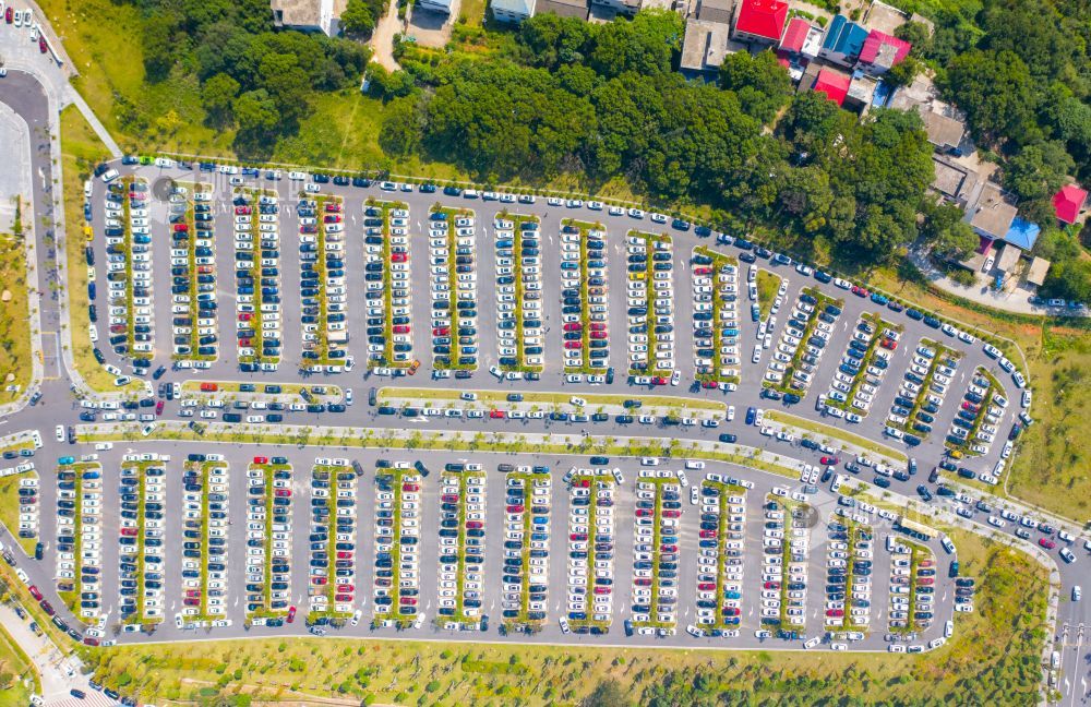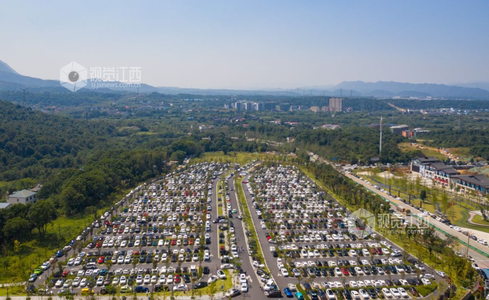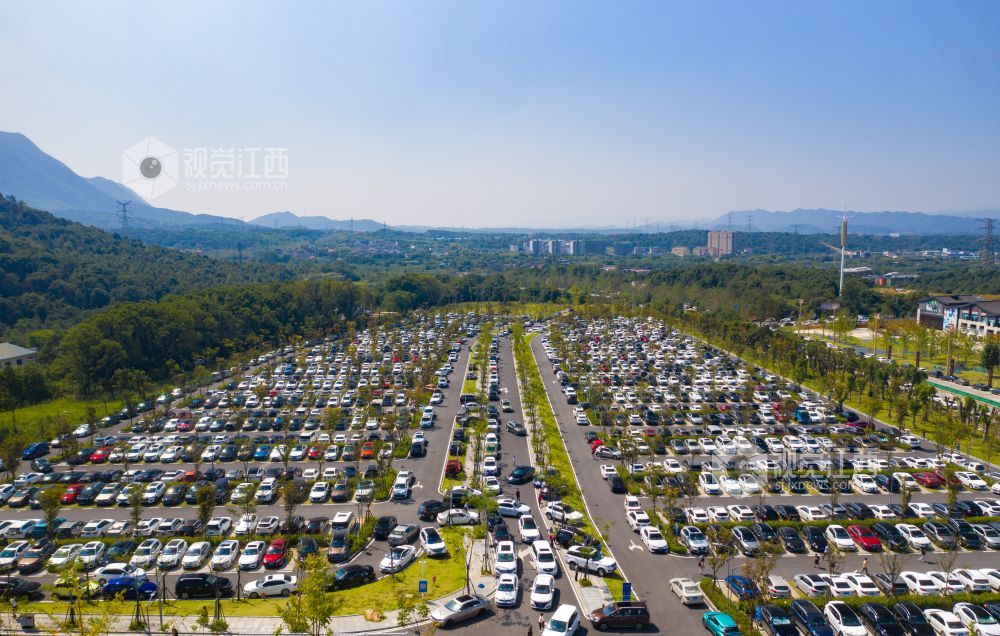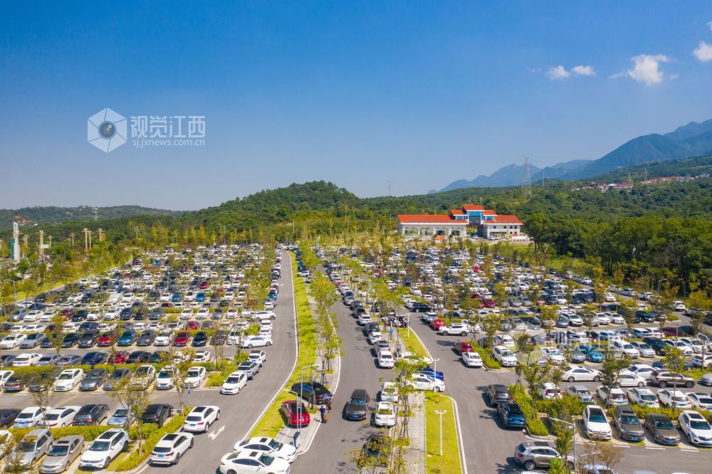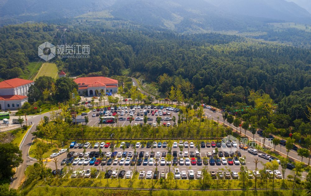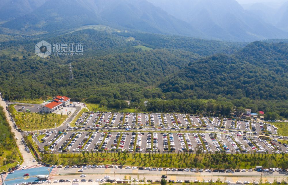 10月4日,航拍下的江西省庐山风景名胜区庐山索道停车场迎来了高度饱和状态,马路两旁在交警的指挥下也停满了车辆,秩序井然。