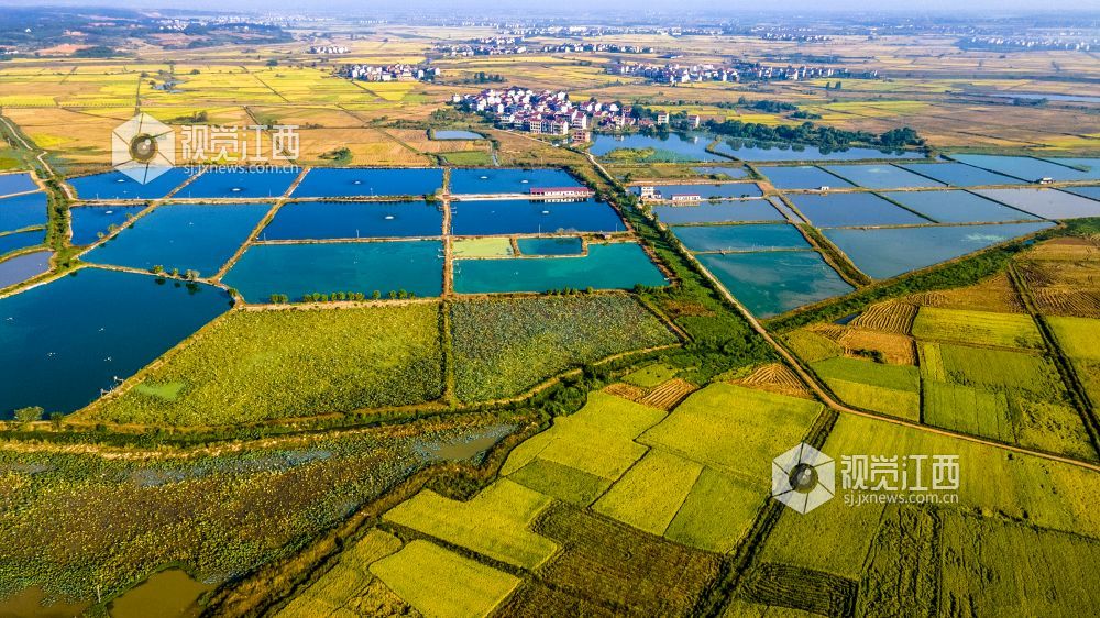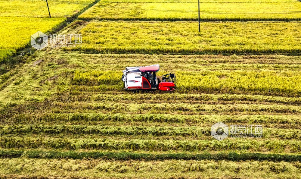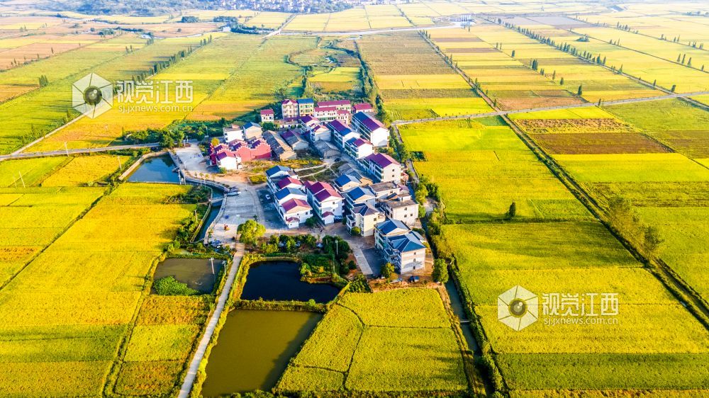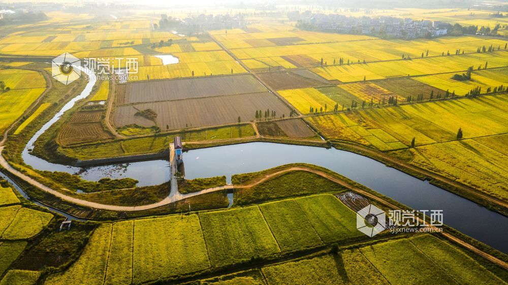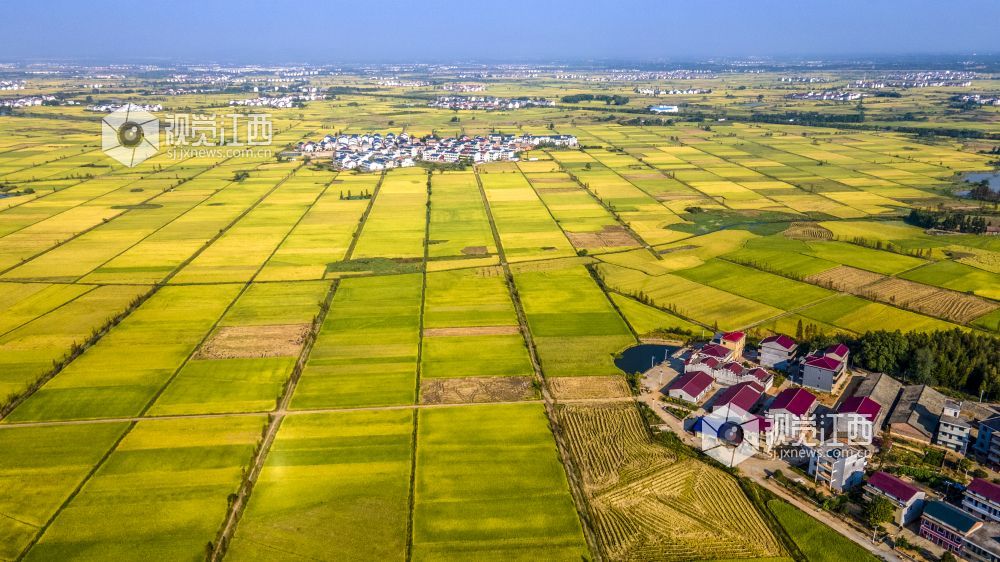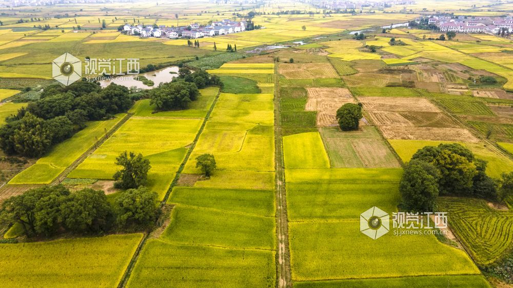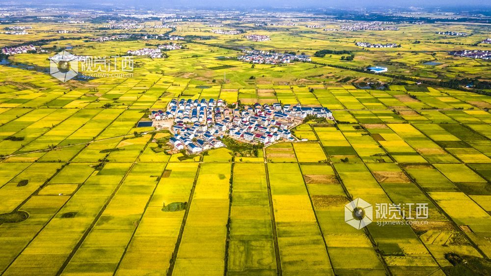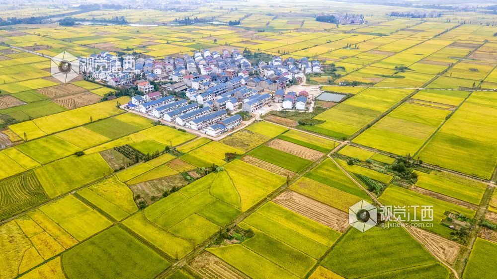 2021年国庆期间,江西省新余市优质水稻进入成熟收获期,高标准农田改造后的稻田线条优美,金色的水稻包围着村庄,无人机俯看宛如一幅幅优美画卷。