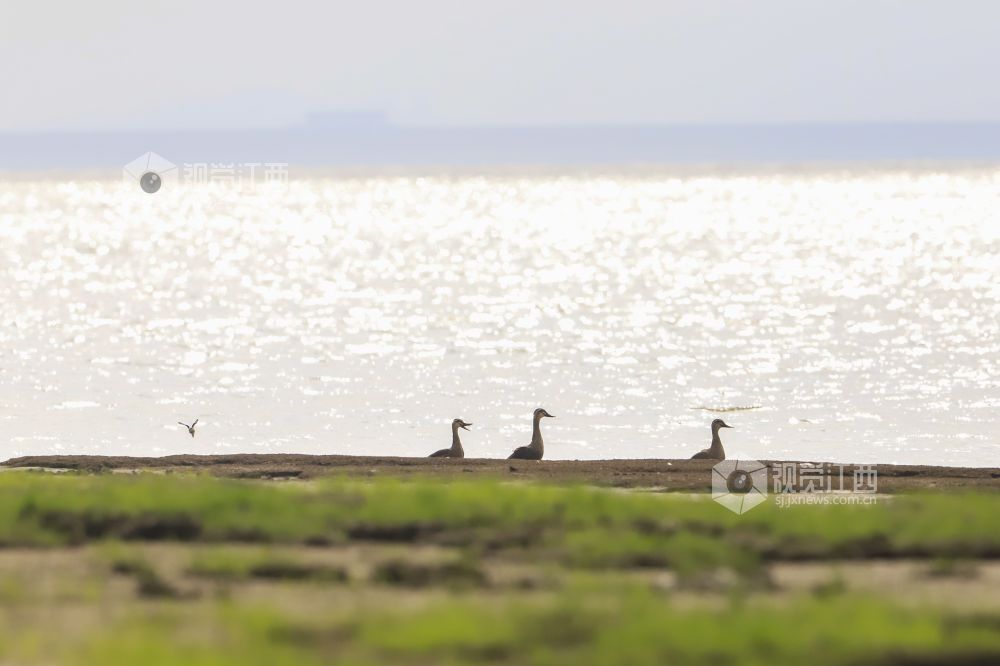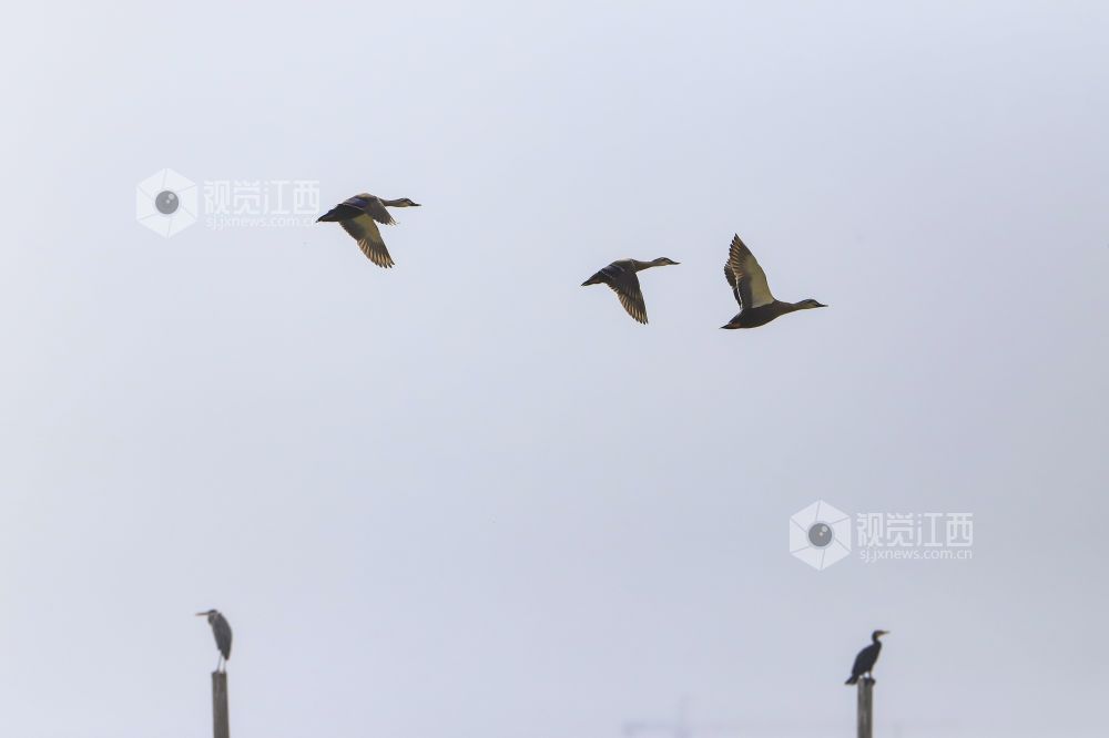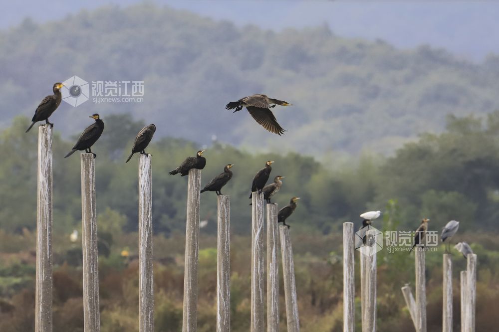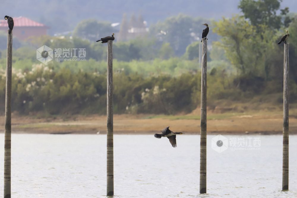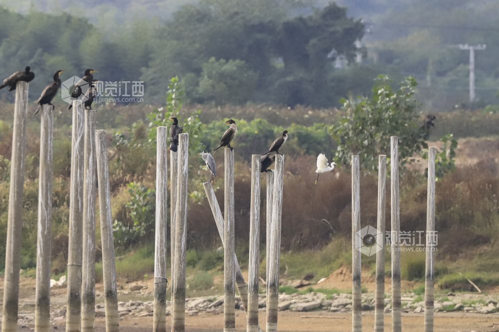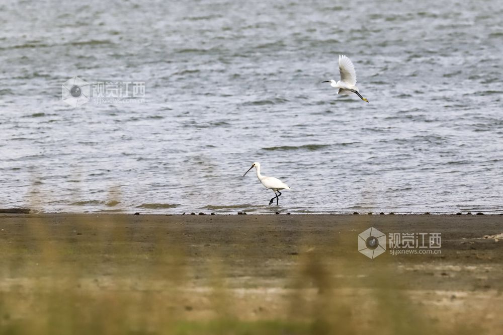 2021年10月8日,白琵鹭和鸬鹚等越冬候鸟在鄱阳湖江西省九江市湖口县湿地觅食。当天19时,鄱阳湖湖口站水位15.88米,随着水位持续下降,越来越多的越冬候鸟将飞抵鄱阳湖。长江中下游南岸的鄱阳湖是中国最大淡水湖和国际重要湿地,也是世界上最大的鸟类保护区之一,每年秋冬季,便会进入枯水期,形成广阔的绿洲,成为东亚-澳大利亚西候鸟迁徙路线上的越冬地和停歇地。