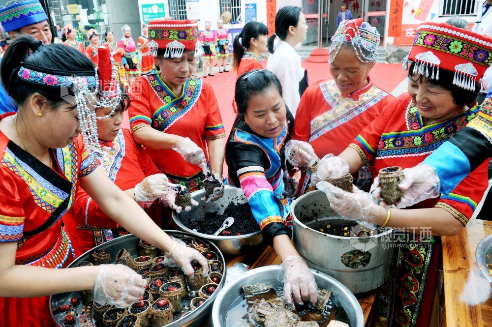 2021年10月14日,江西省德兴市香屯街道兰村畲族大妈们正在开心制作我国少数民族特色美食畲族乌米饭。