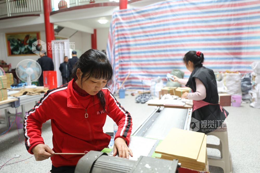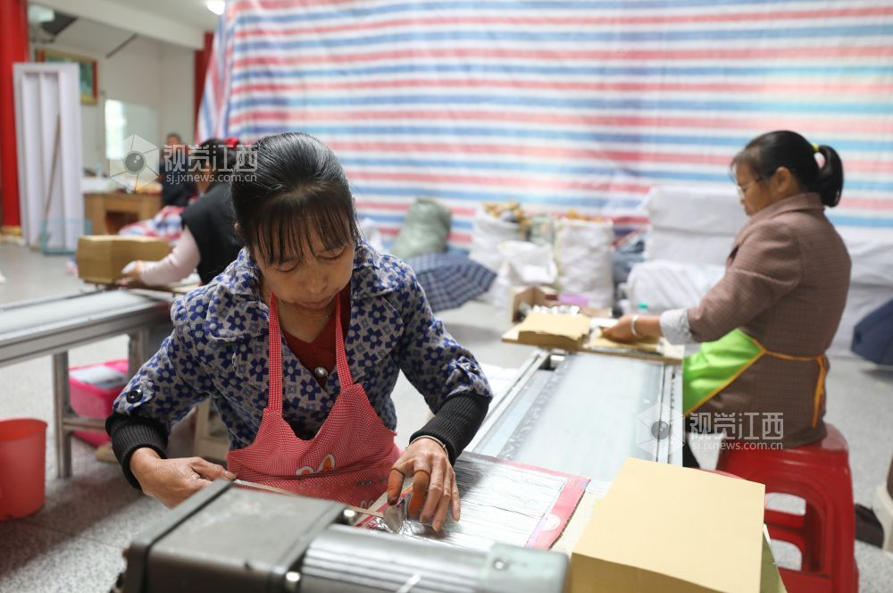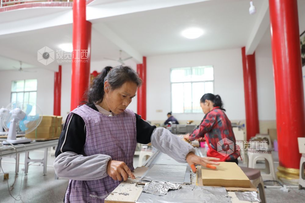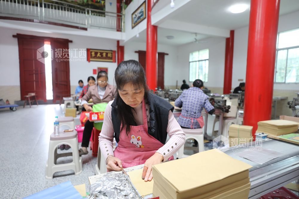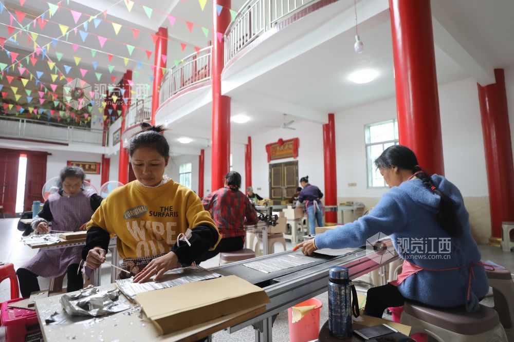 10月14日,江西省莲花县三板桥乡山口垅村江氏祠堂,村民在忙着加工锡箔纸。据了解,去年该村通过引来客商在祠堂设立车间,有40余名村民在此务工,月收入2000元左右,还照顾了家庭。