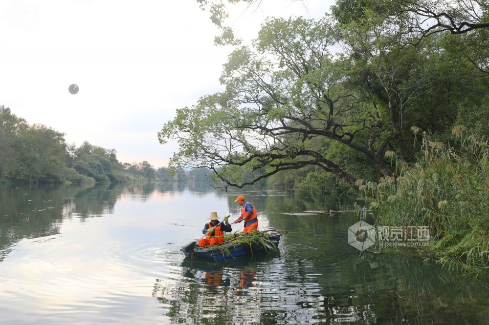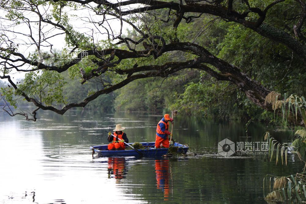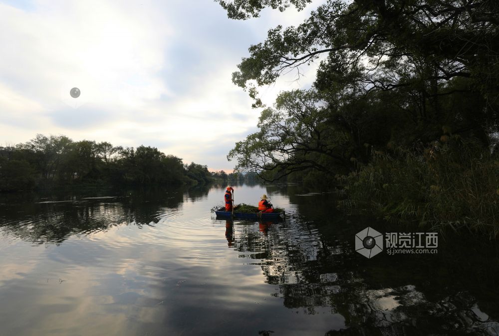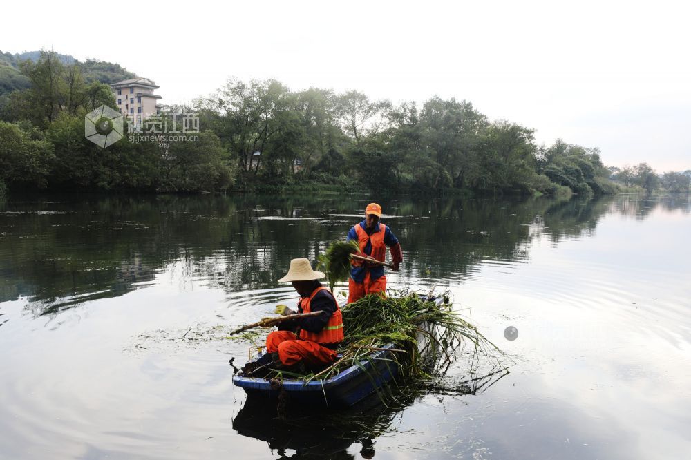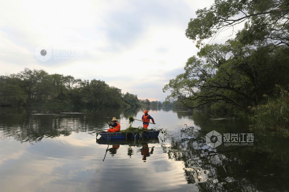 10月18日,河道保洁员在江西省莲花县琴亭镇六模村莲江河段清理水草和漂浮物。
