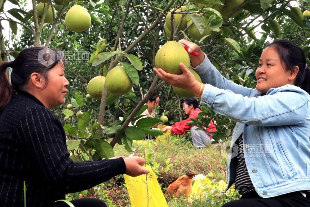 “一天拉六七百斤去市场,早上七点卖到九点半就卖光了。我们的树基本不打草药,纯天然无污染,味道甜,大家都爱吃,回头客很多。像这种金兰柚最低四块钱一斤,红心柚和三红柚价格低一点,平均两块五一斤。”销售负责人盛银花指着树上的柚子介绍道。