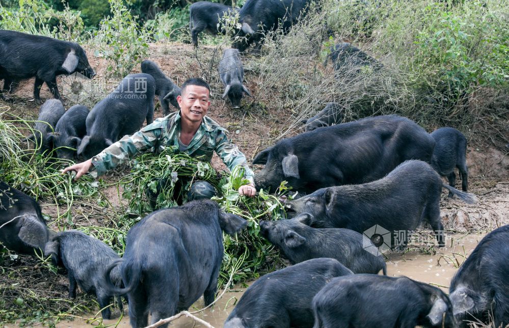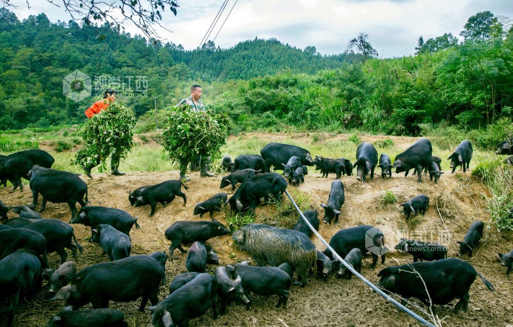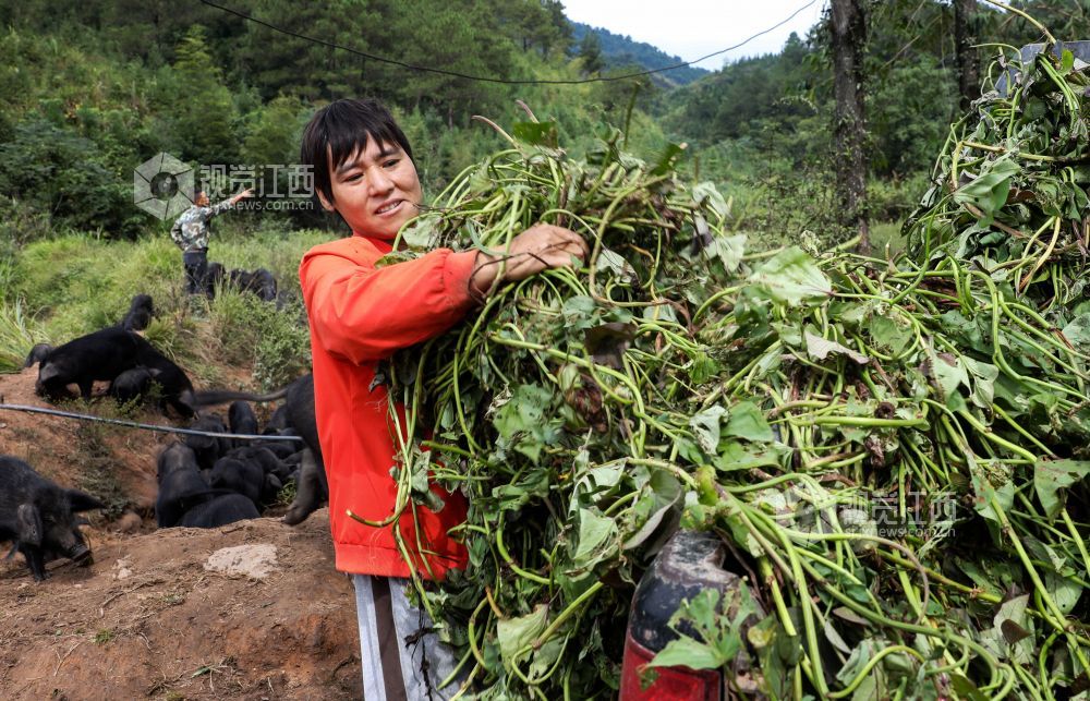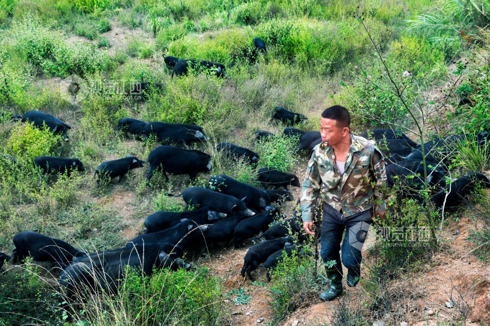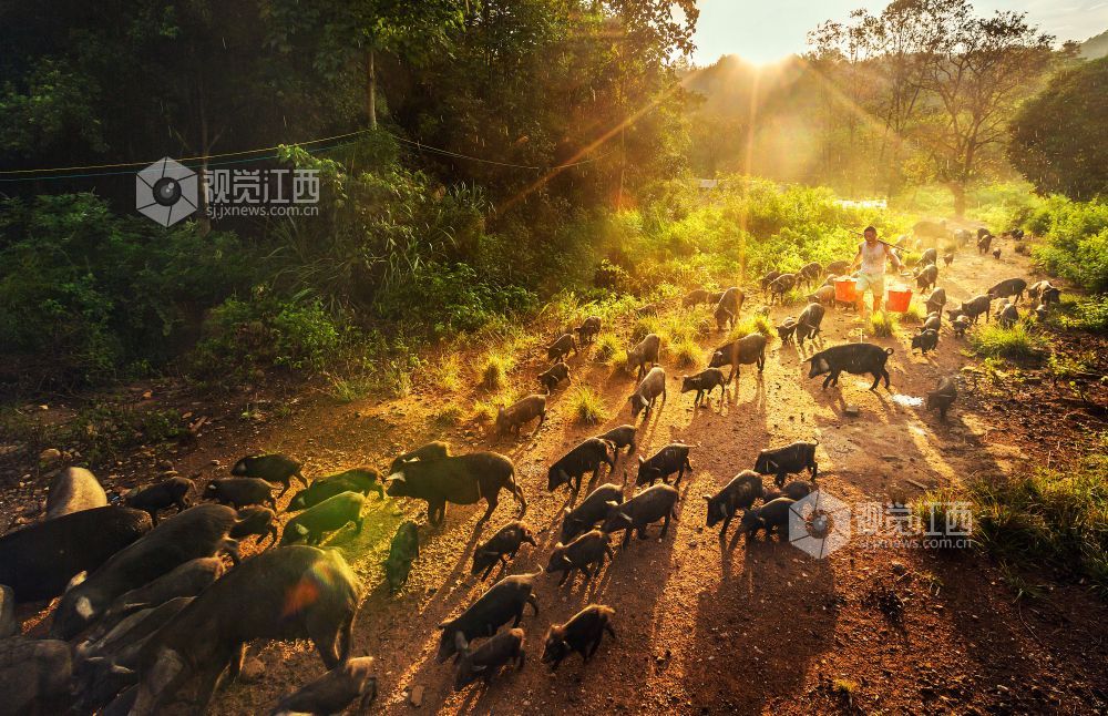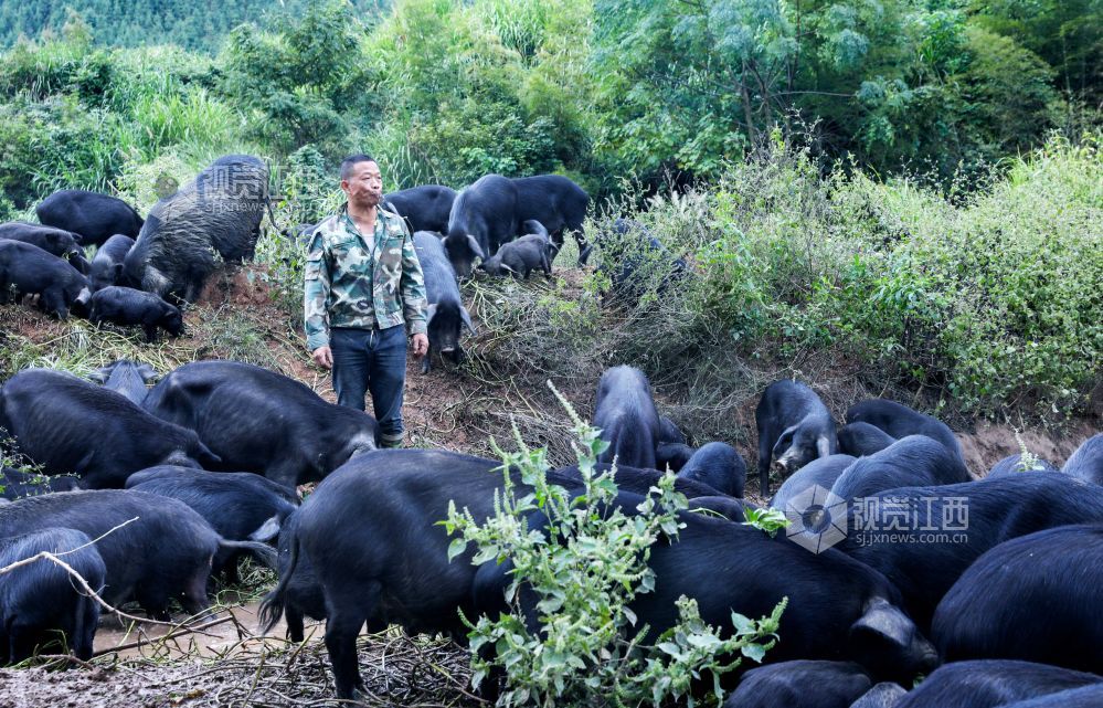 10月19日,江西省永新县象形乡新风村香猪生态养殖基地,基地负责人康小文吹响口哨,一头头香猪从山林各处跑来进食。