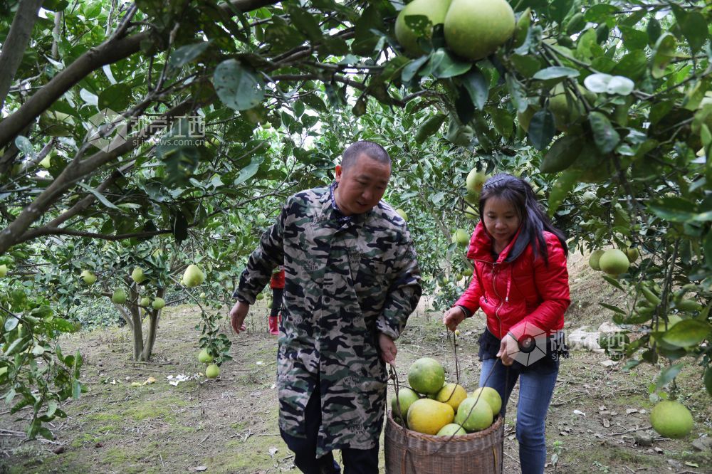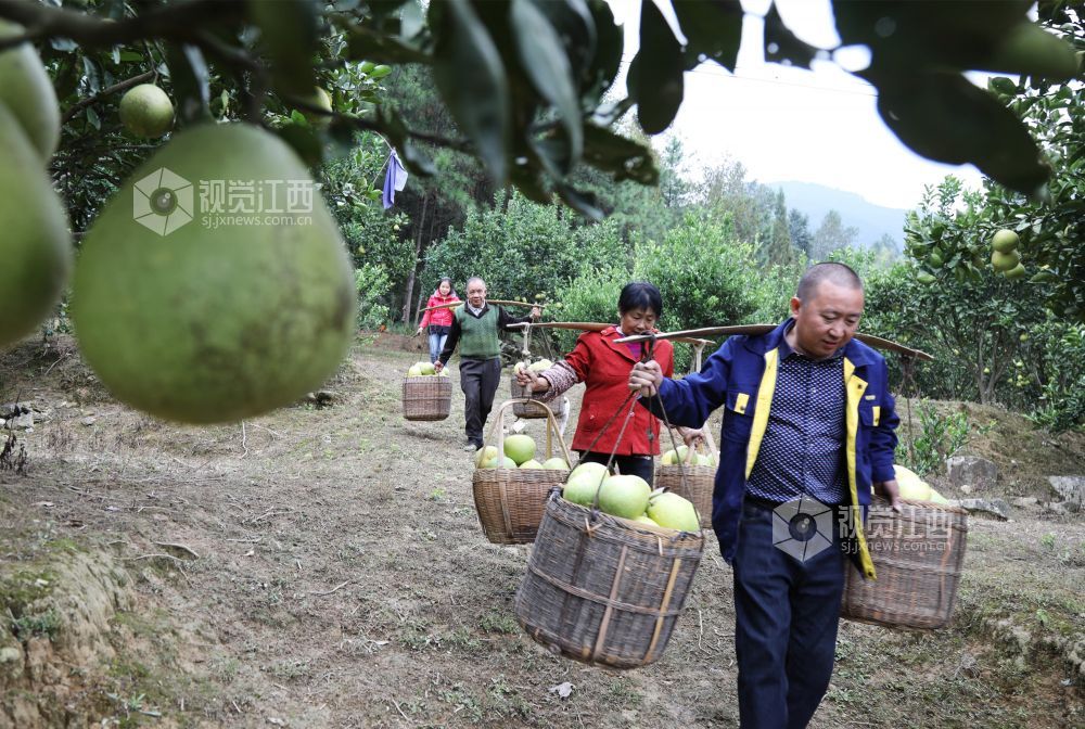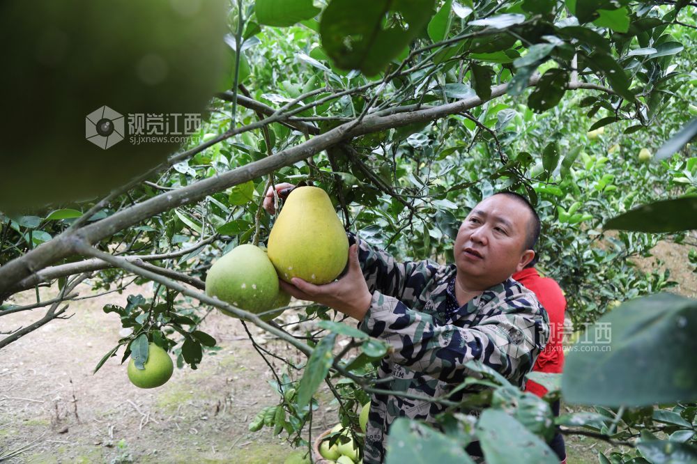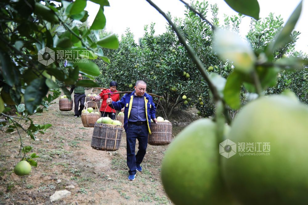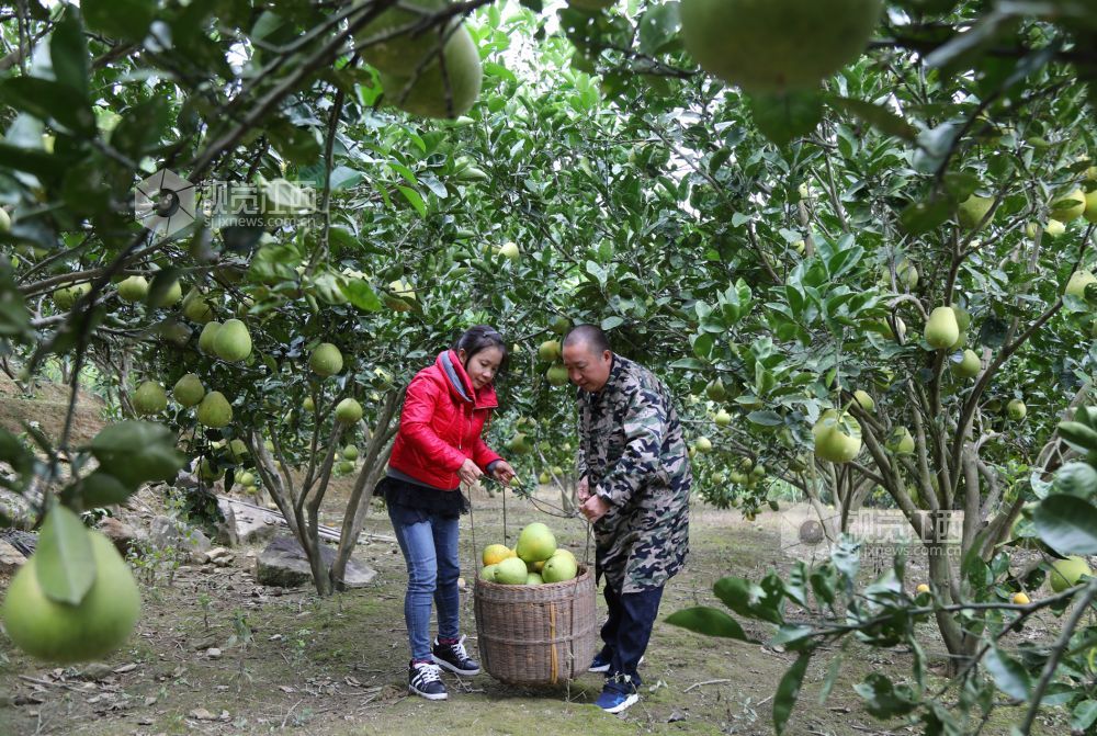 10月22日,江西省莲花县闪石乡西江村脱贫户吴天行一家在自己果园里采摘金兰柚。吴天行曾经是贫困户,在乡村组织的帮助下,通过养殖牛羊、种植果树,2016年成功脱贫,今年他种植的金兰柚又喜获丰收,纯收入可达18000元,加上其他产业的收入,全家一年收入估计可以达8万元。