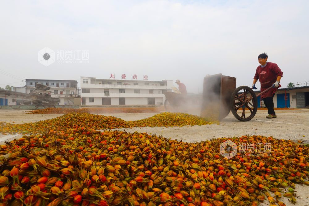 10月24日,江西省湖口县武山镇元青中药材专业合作社忙着杀青、晾晒中药材黄栀子。