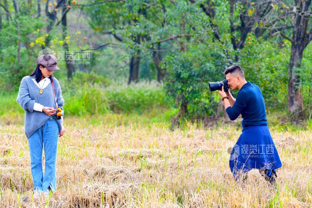 2021年10月24日,在江西省上饶市铅山县新滩乡后畈村,摄影爱好者正在采风拍摄红柿子。