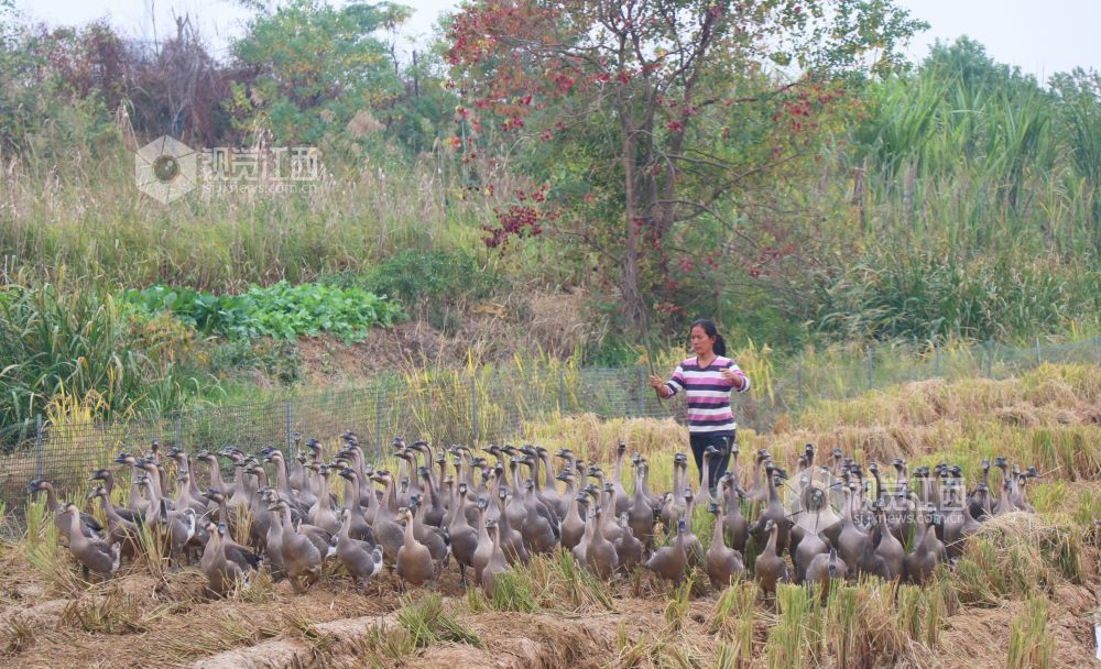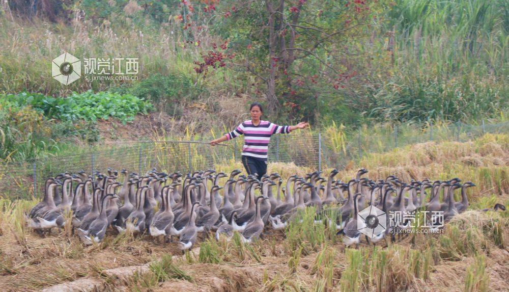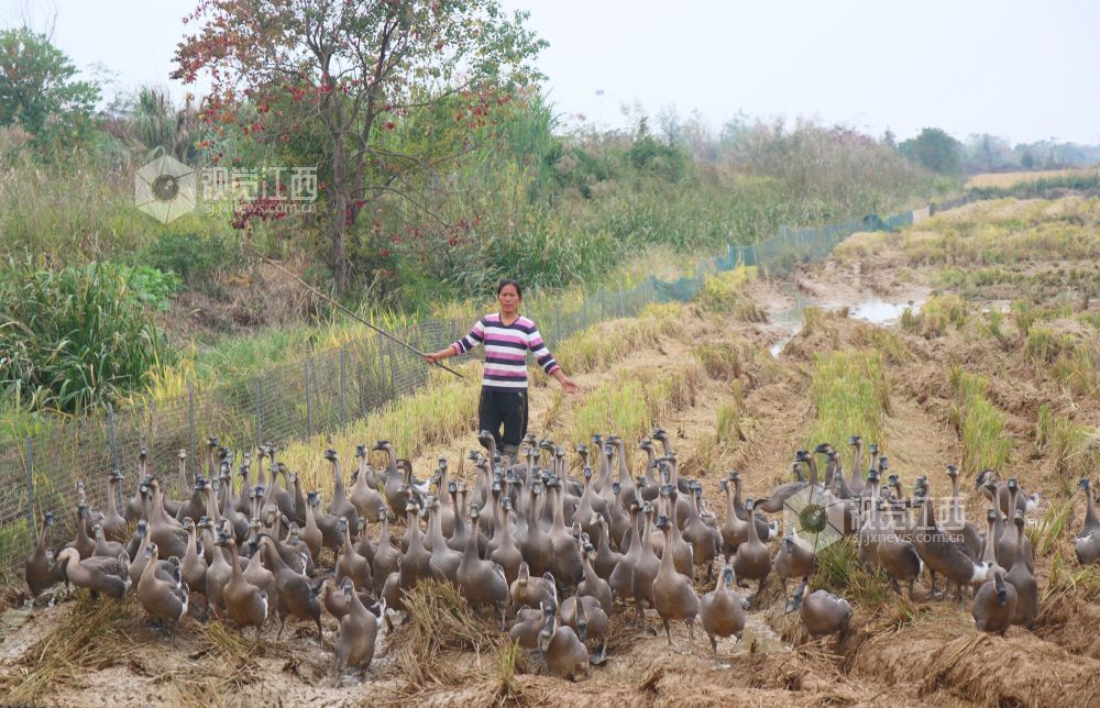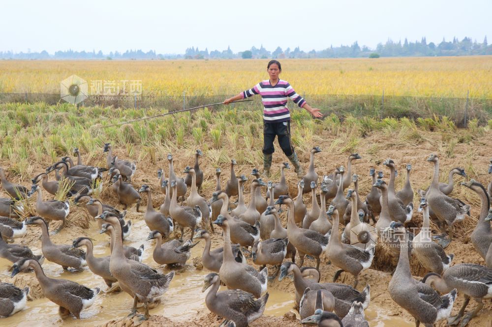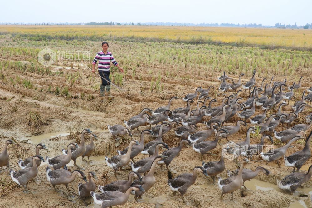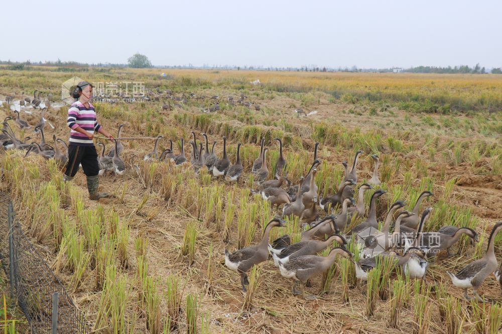 2021年10月29日,江西省余干县康山垦殖场大湖口分场养殖户陈秀萍在收割后的稻田里放养鹅群。