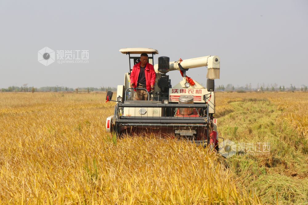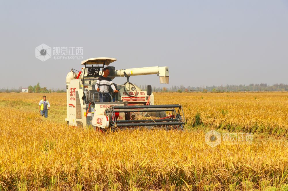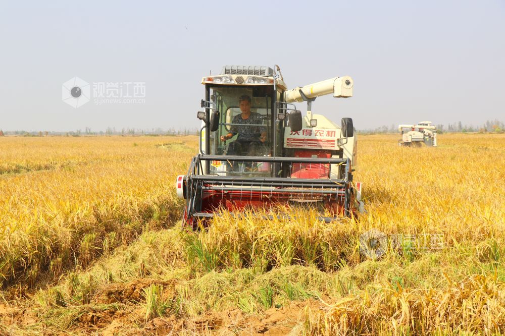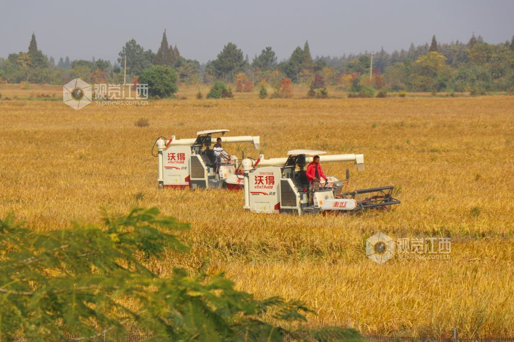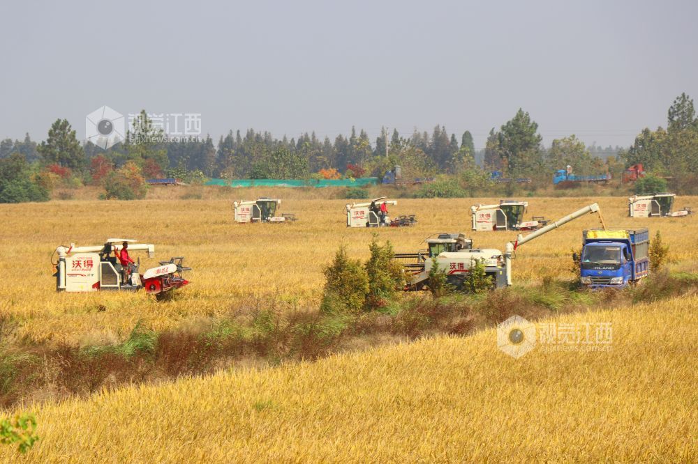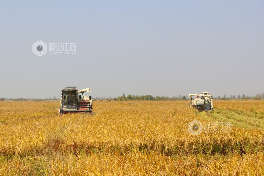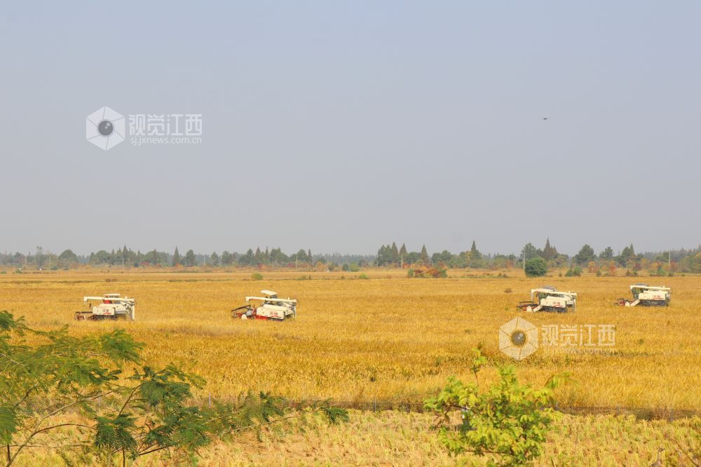 2021年10月30日,江西省余干县康山垦殖场大湖口分场千亩有机稻进入收获季,田野一片金黄,多台收割机抓紧作业,田间地头呈现一派秋收的繁忙景象。
