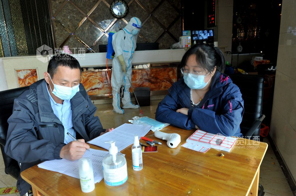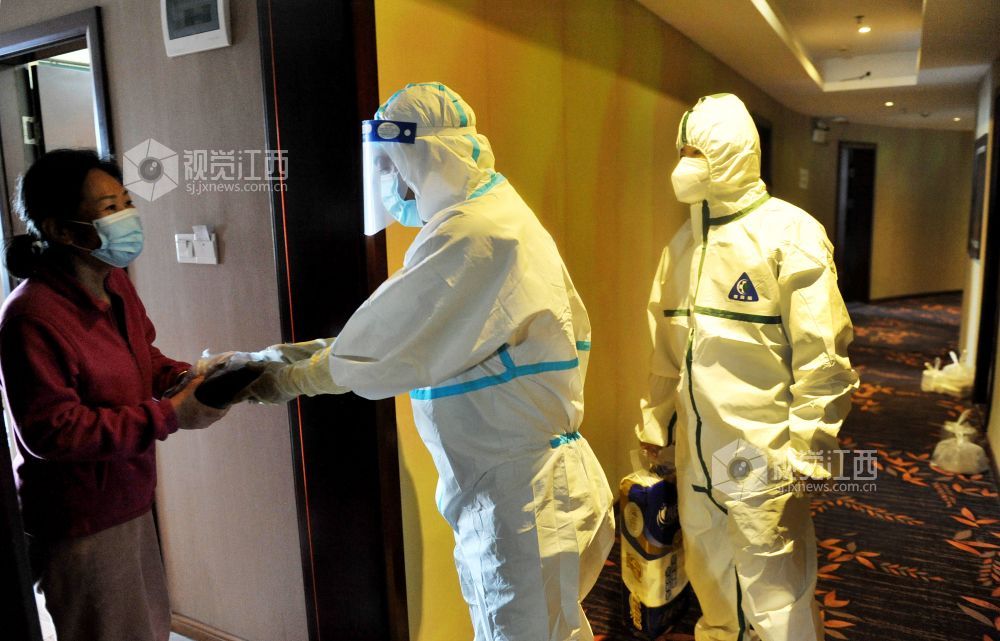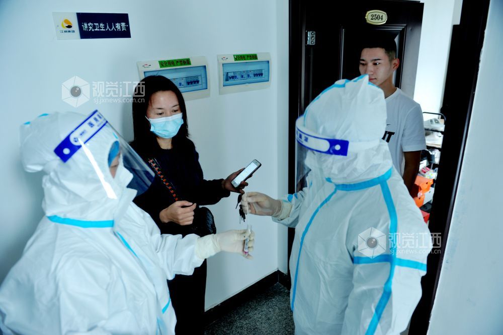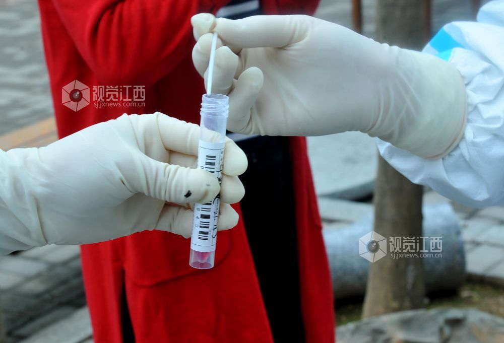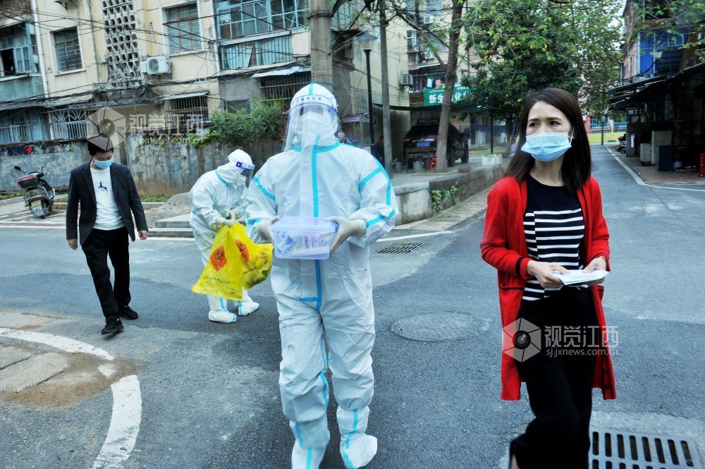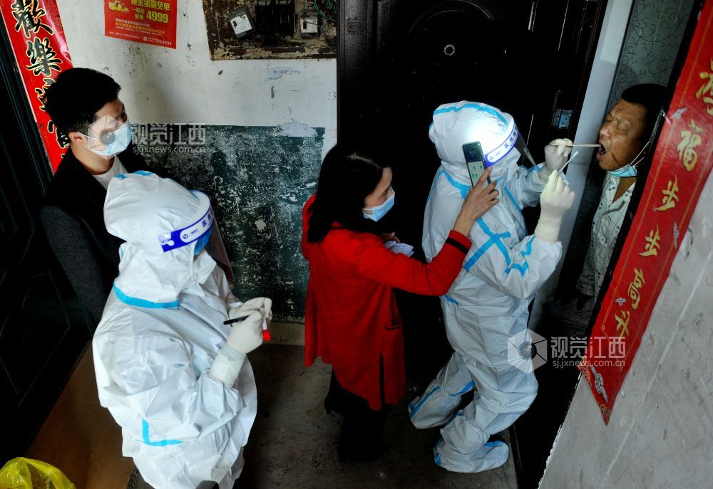 2021年11月3日,江西省德兴市铜矿街道办干部联合当地医务人员上户为居家隔离的群众做核酸检测。