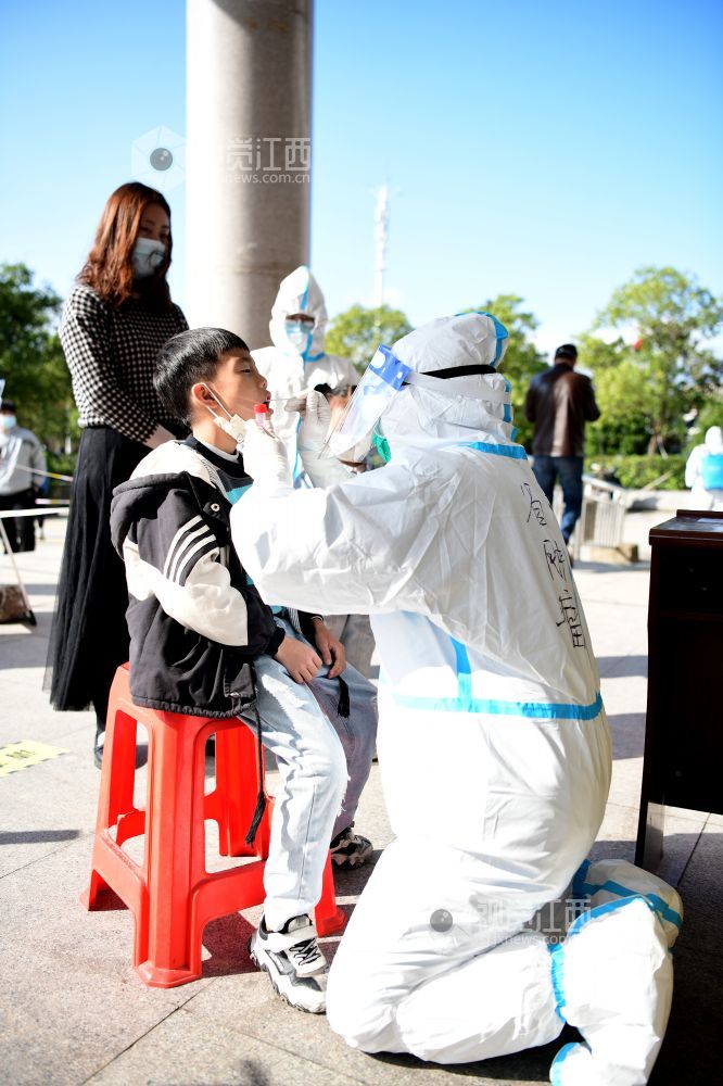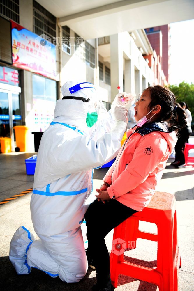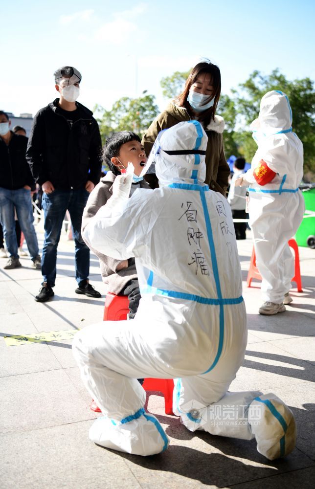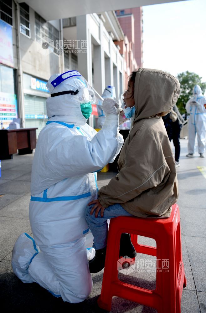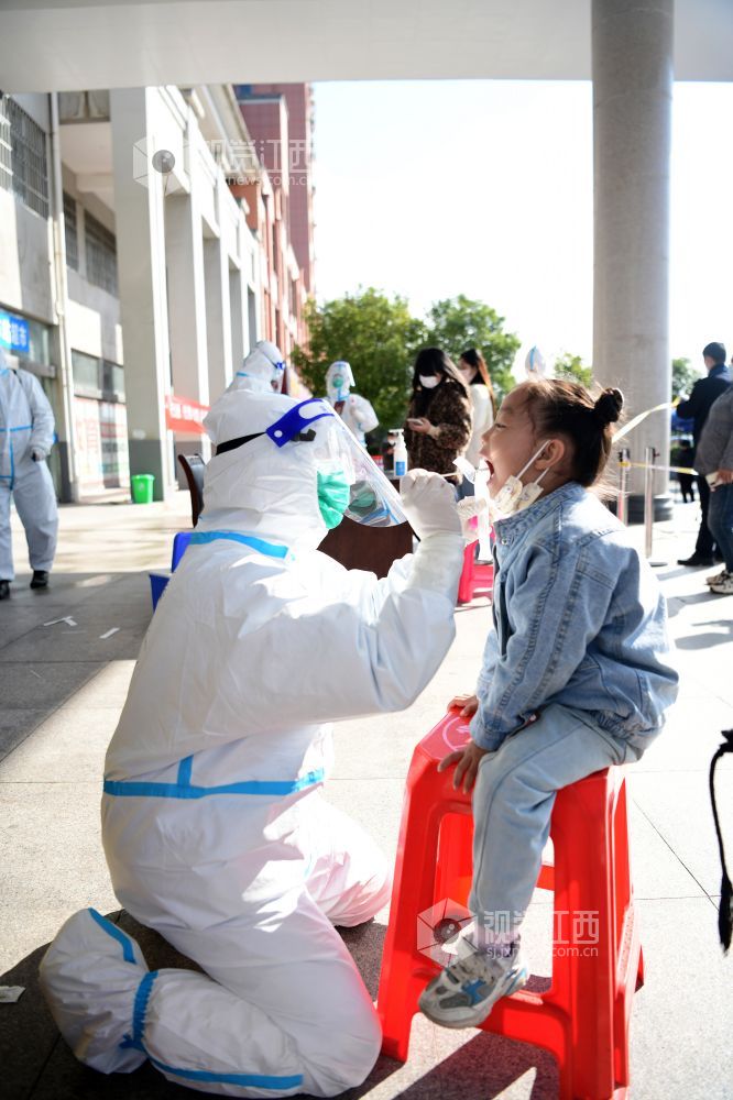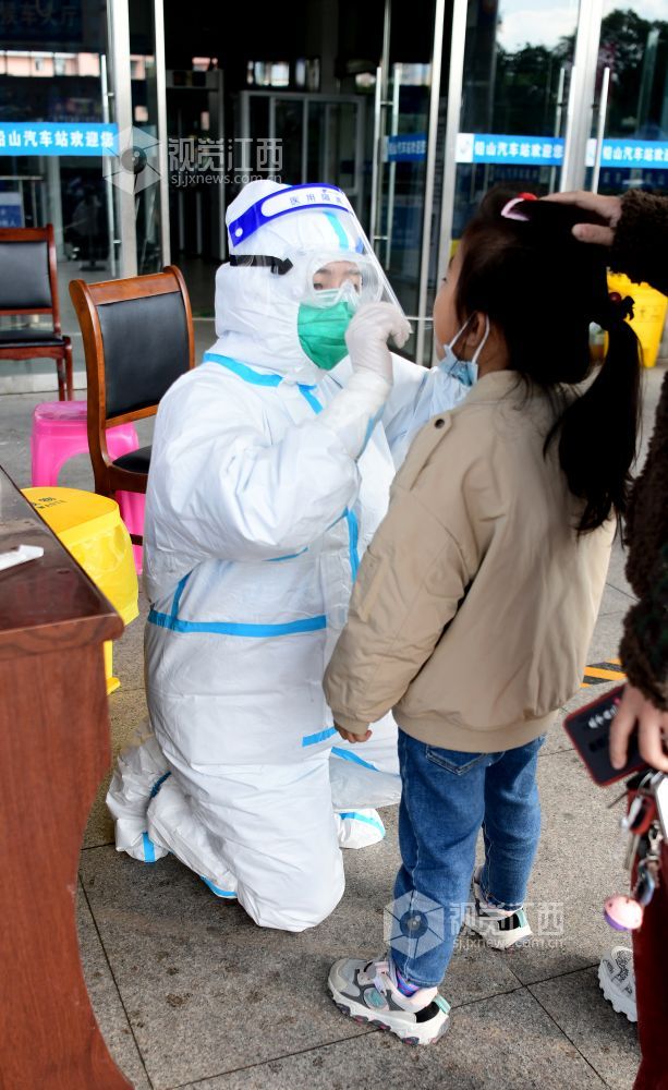 2021年11月8日,江西省上饶市铅山县开启第六轮核酸检测,在该县河口镇汽车站检测点,来自江西省肿瘤医院的医务人员周欣正在用跪姿为小孩做核酸取样,令人心疼。