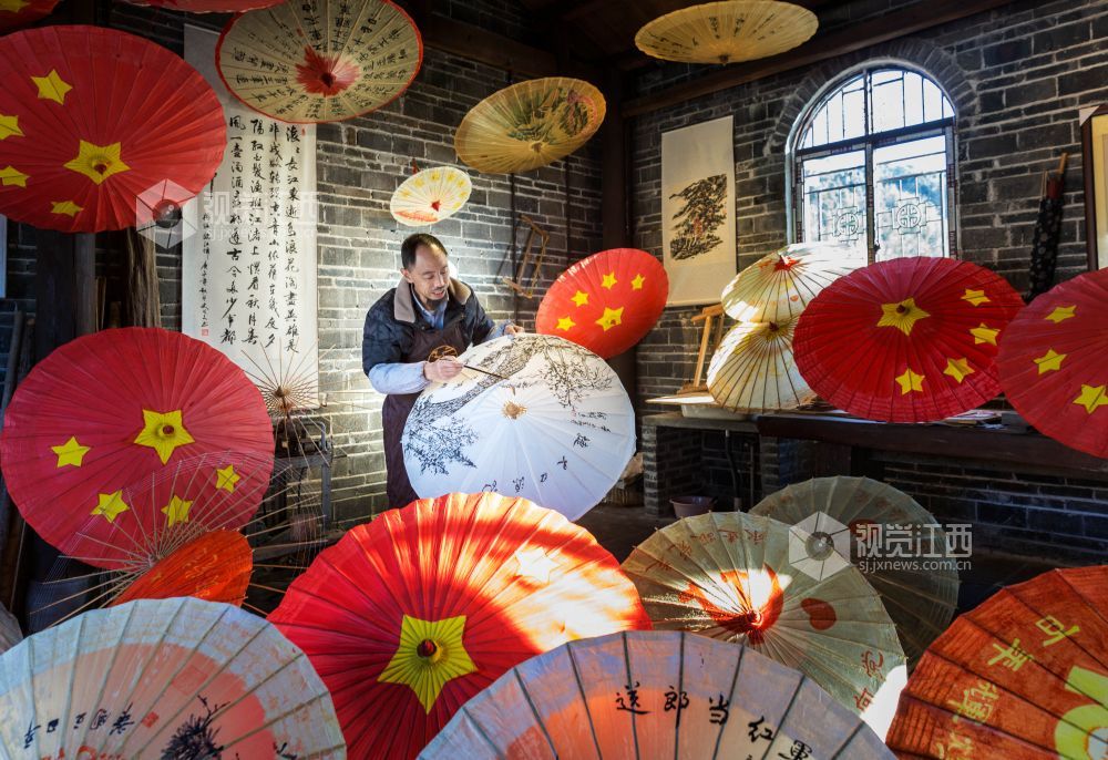 11月8日,在江西省永新县曲白乡院下景区的祥云油纸伞作坊,油纸伞大师罗银祥正在绘制以红色文化为主题的油纸伞。