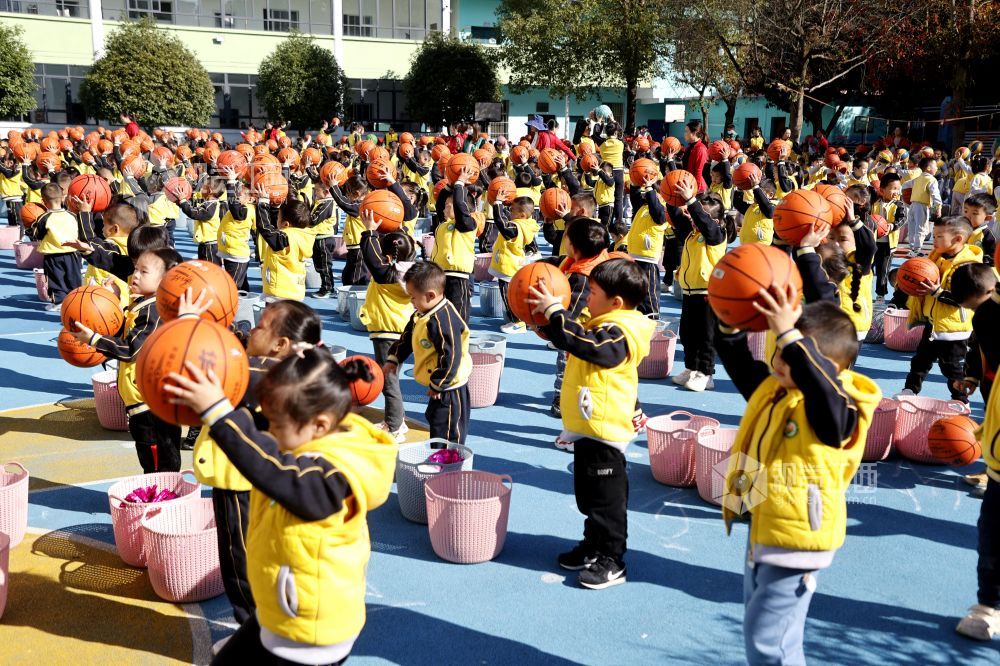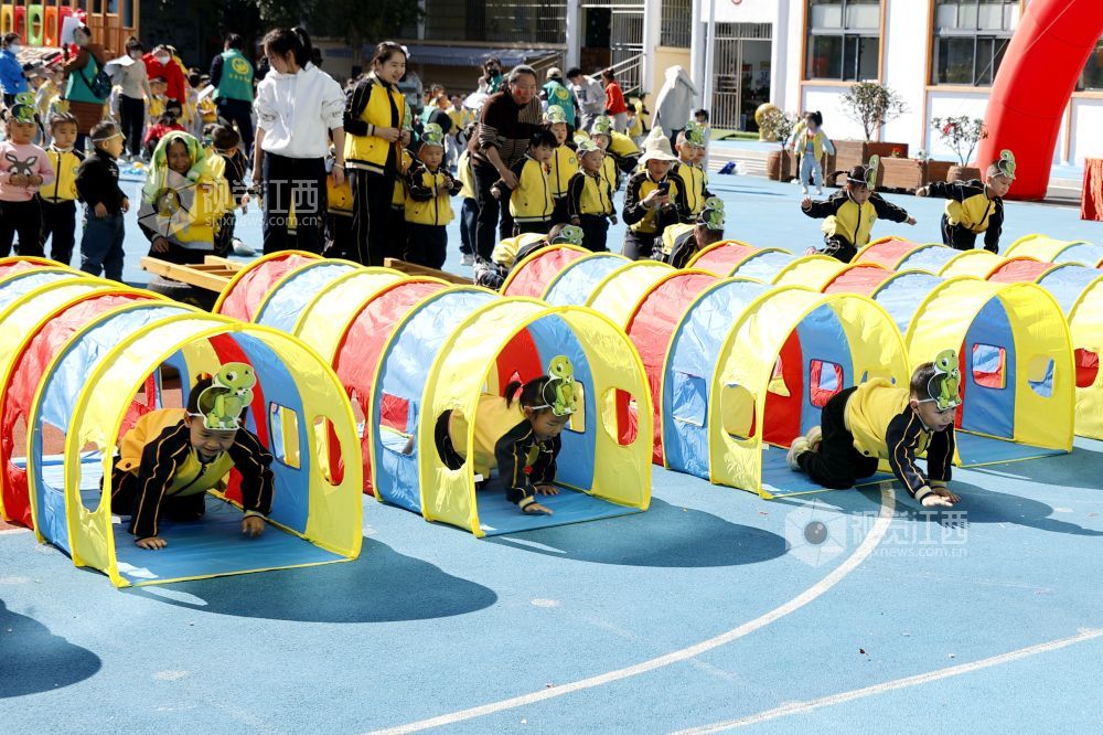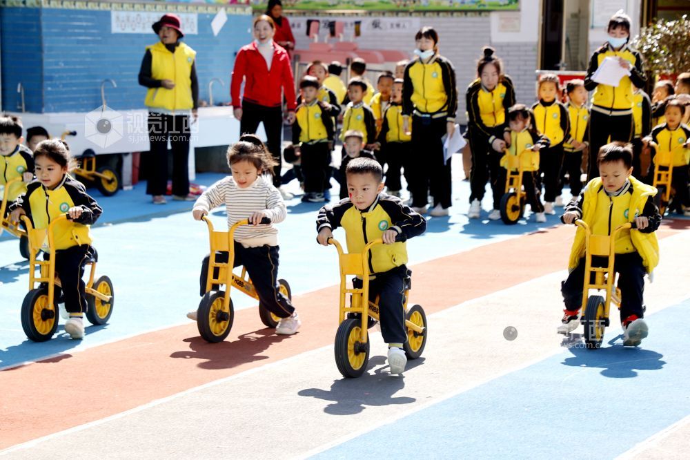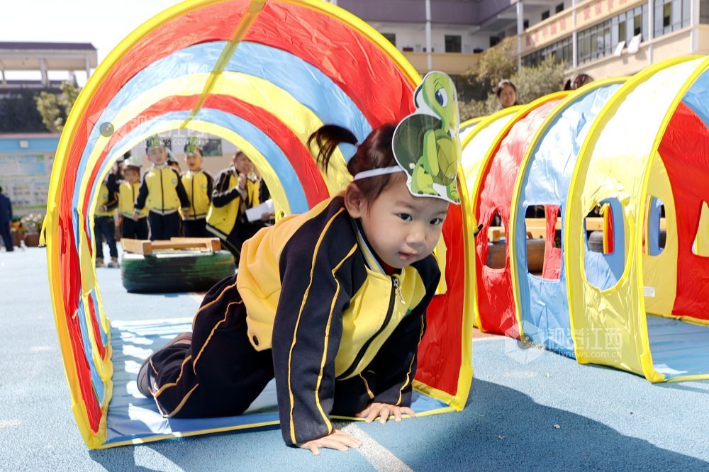 2021年11月10日,在江西省吉安市峡江县幼儿园,小朋友们在运动会上进行比赛。当日,峡江县幼儿园举行少儿趣味运动会,600多名小朋友参加了自行车骑行、球操、障碍爬等项目的比赛。