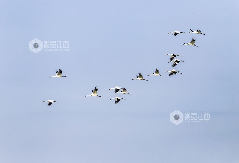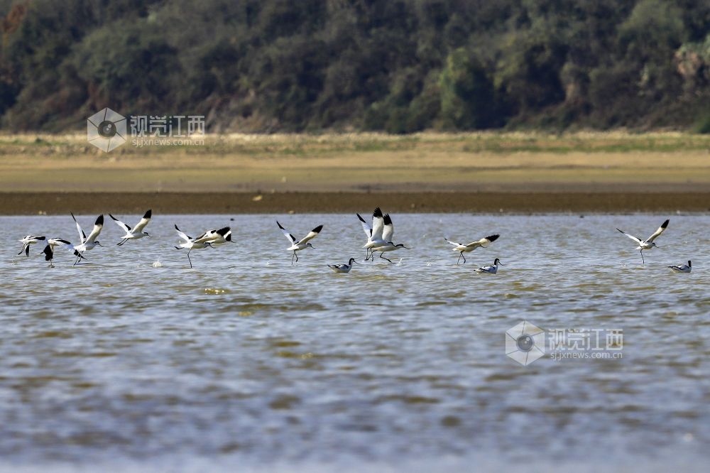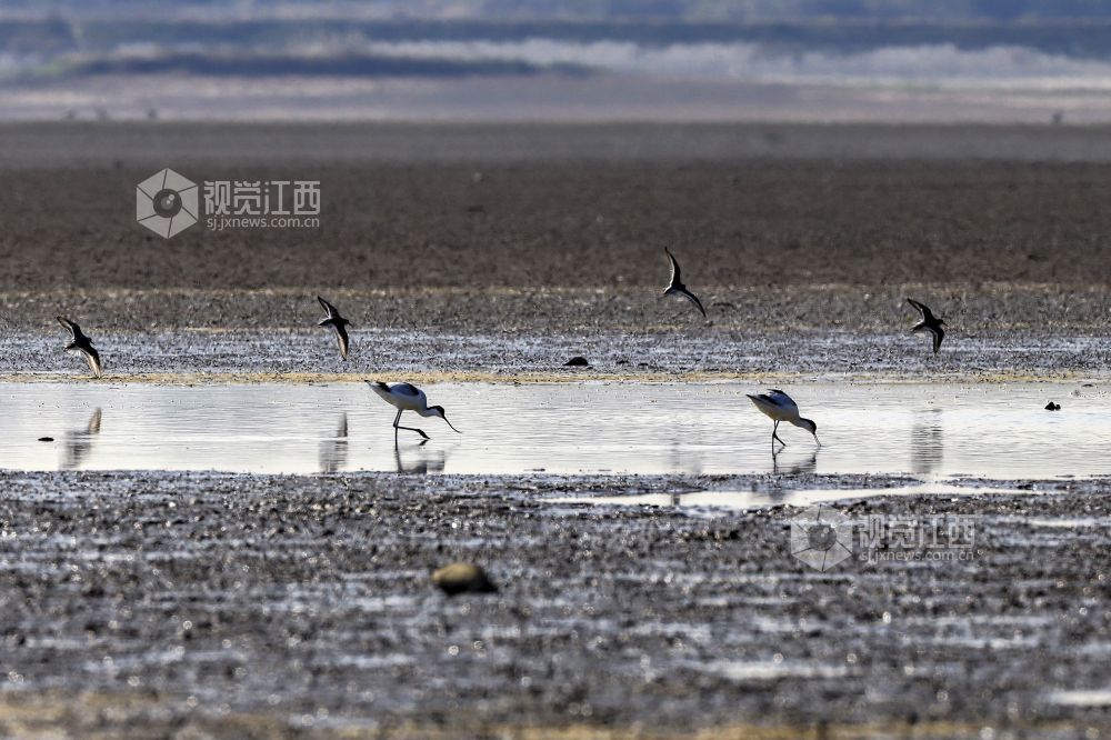 11月11日,成群候鸟在鄱阳湖江西省九江市湖口县湿地飞翔、觅食。时值初冬,鄱阳湖跌破枯水位,成了各类候鸟越冬的集结地。