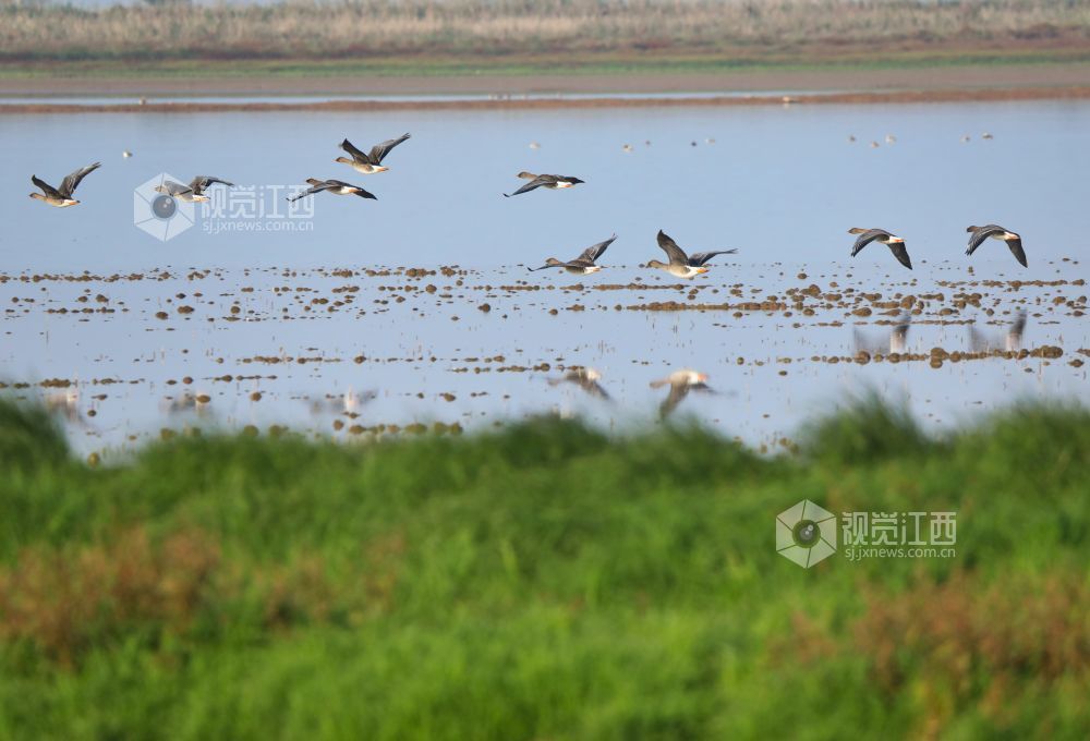 11月13日,初冬的江西省鄱阳湖南矶山湿地,荻花绽放。越冬候鸟由北国南来,成群结队的豆雁、大天鹅、白鹤等候鸟在广阔的草洲沼泽地嬉戏或翱翔,连绵不断,美不胜收。