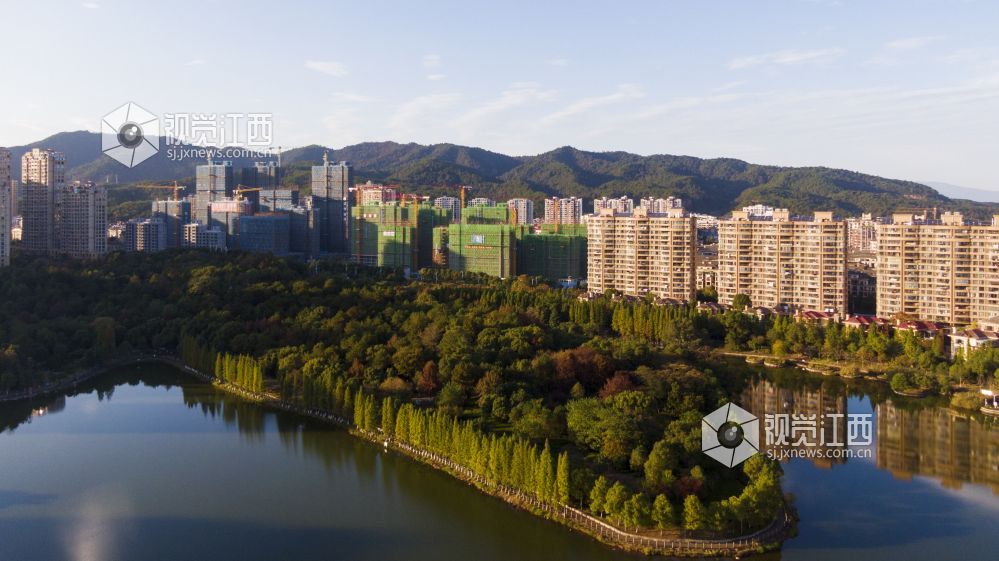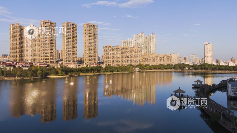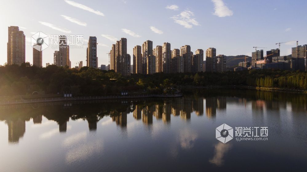 11月13日,新余市仰天岗山前的北湖,放眼望去这里不仅山美、水美、城更美。冬日的阳光将附近高楼的倒影投向平静的水面,与蓝天、白云、树林的倒影叠在一起,把湖面渲染得多姿多彩,色彩斑斓。