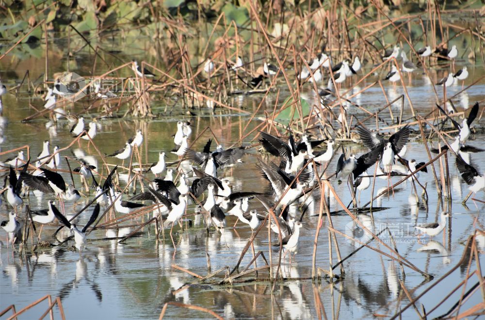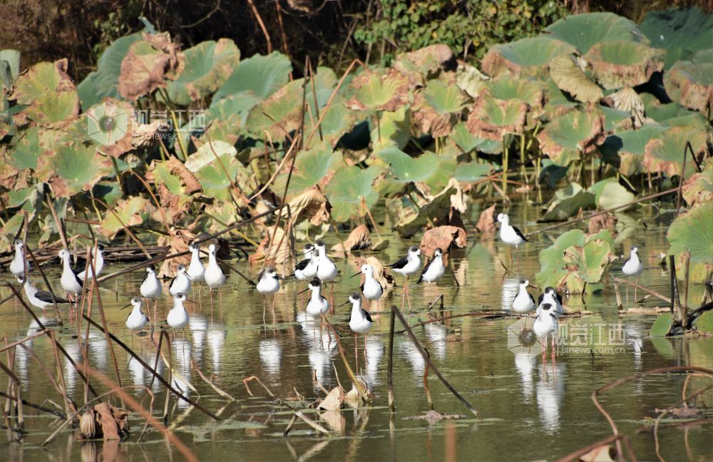 2021年11月15日,成群结队的黑翅长脚鹬飞抵江西省鄱阳县鄱阳湖畔的西门湖边的荷塘自由自在地觅食。