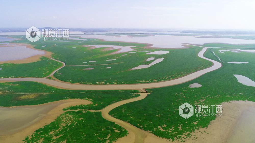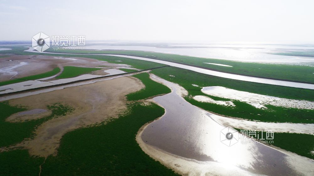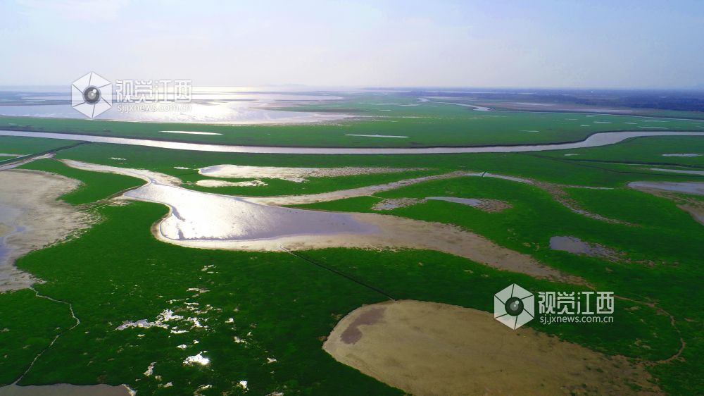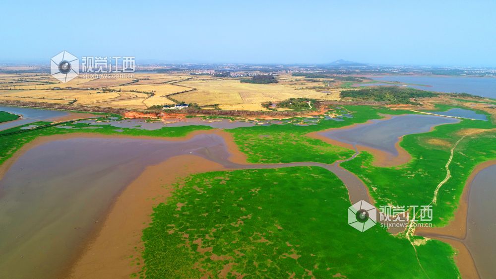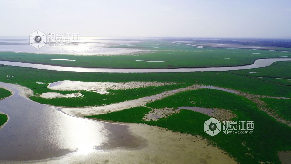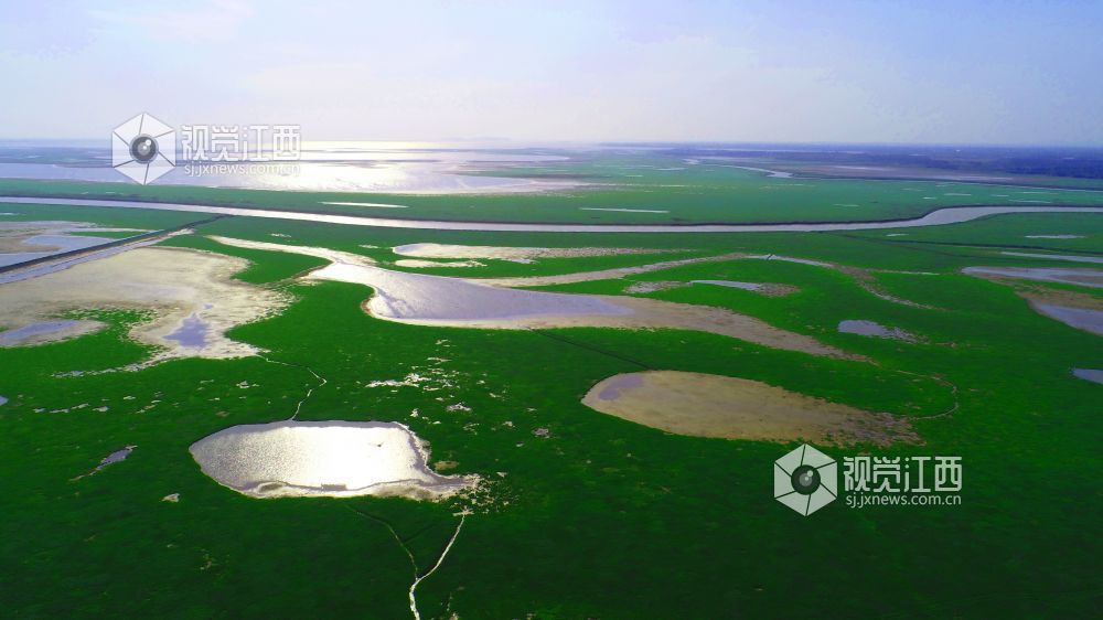 11月13日,在鄱阳县鸦鹊湖省级湿地公园,一片片草州就像绿茵场、一条条河道弯弯曲曲就像飞舞的玉带又像巨龙腾飞、一个个小水坑在光影的照耀下闪闪发光,就像点缀在鄱阳湖大地上的一颗颗璀璨明珠,不时有一群群候鸟飞过,构成一幅幅美丽的画卷。