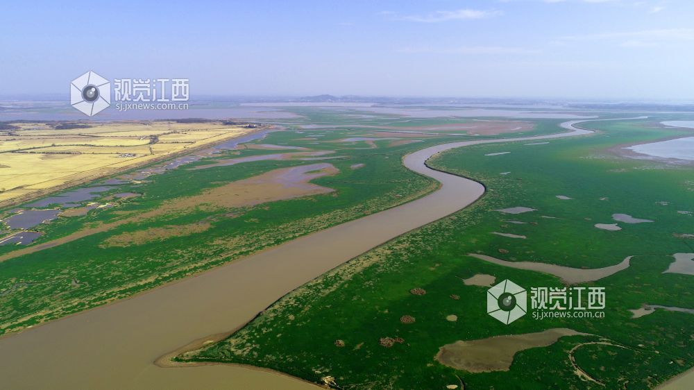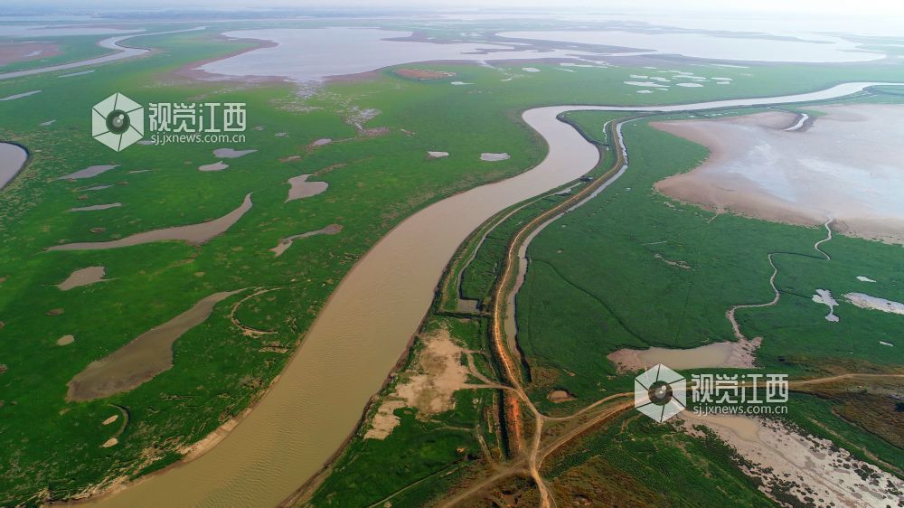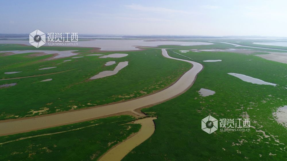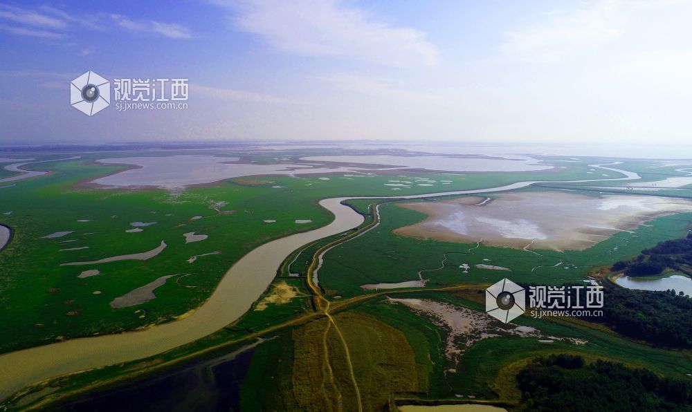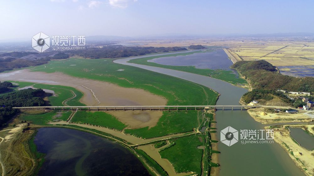 11月13日,在鄱阳县鸦鹊湖省级湿地公园,一片片草州就像绿茵场、一条条河道弯弯曲曲就像飞舞的玉带又像巨龙腾飞、一个个小水坑在光影的照耀下闪闪发光,就像点缀在鄱阳湖大地上的一颗颗璀璨明珠,不时有一群群候鸟飞过,构成一幅幅美丽的画卷。