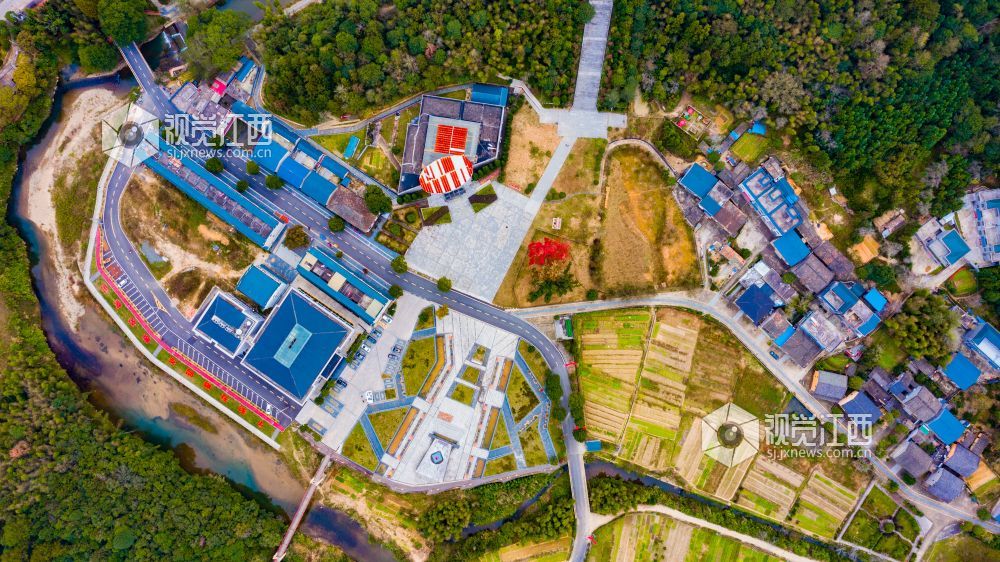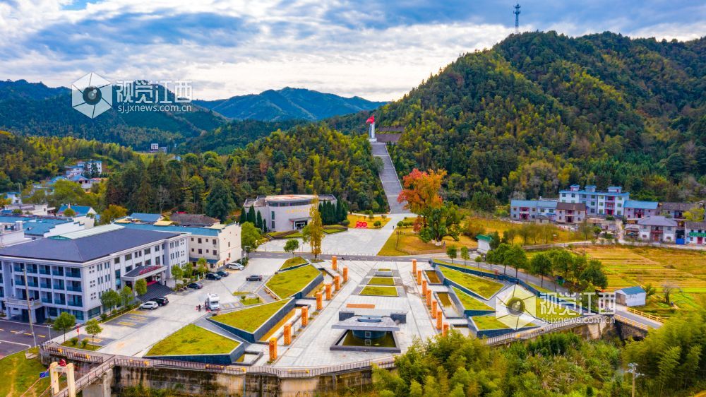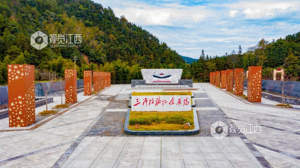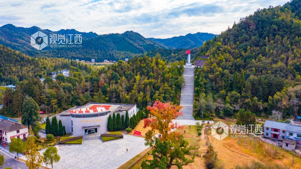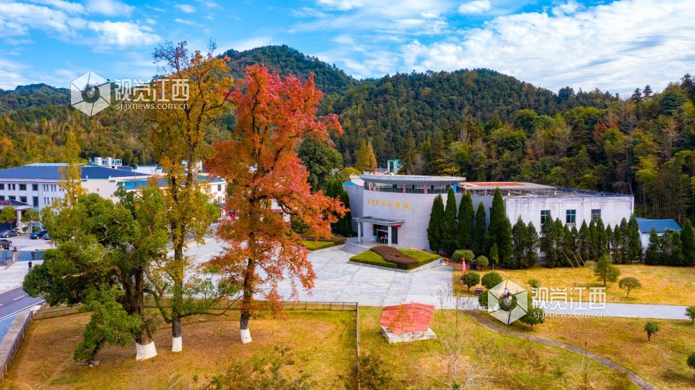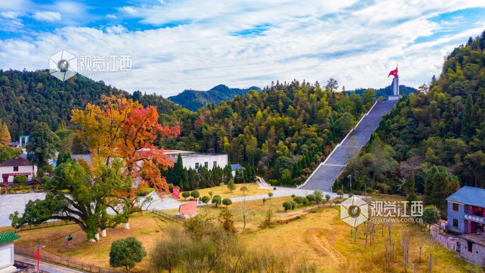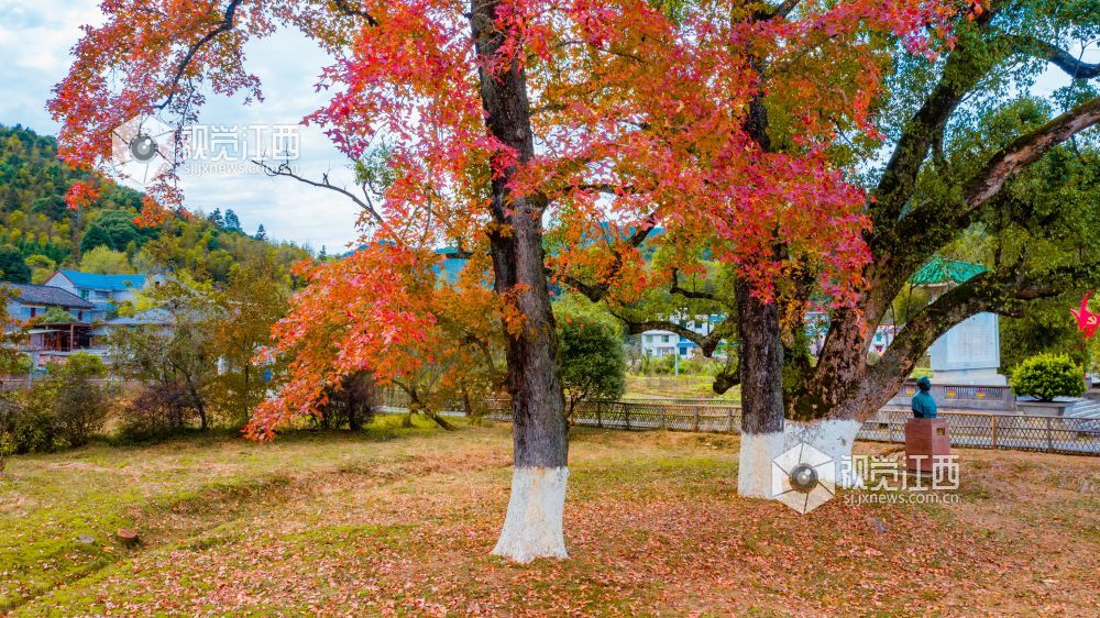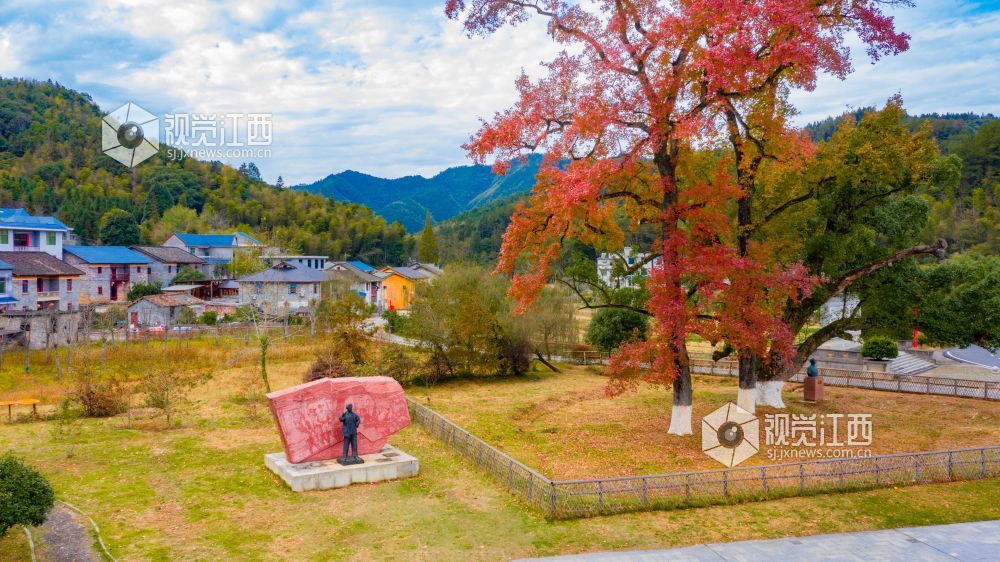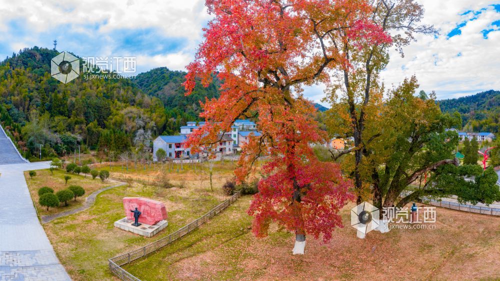 两棵红枫高80余米,与旁边绿色的古樟相互依偎、相互映衬,显得格外靓丽,成为三湾改编景区一道最美的风景。