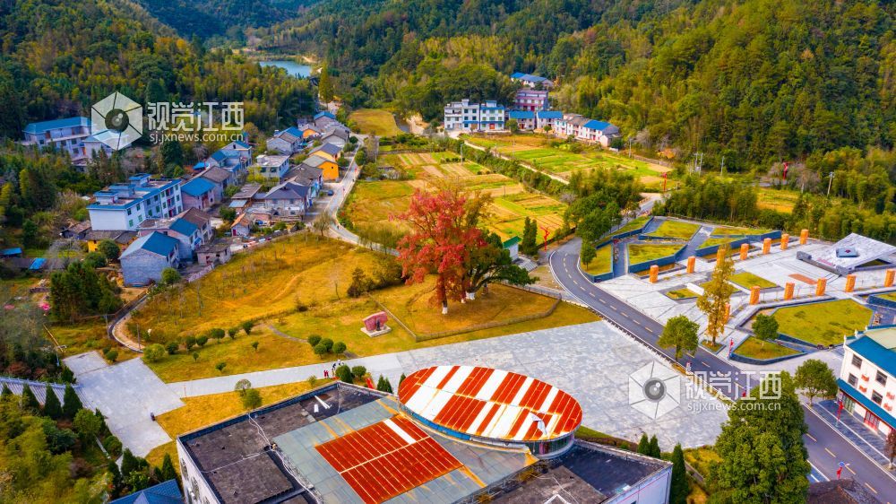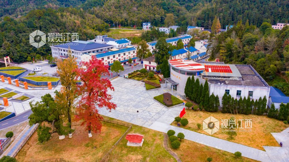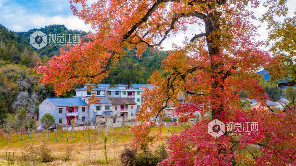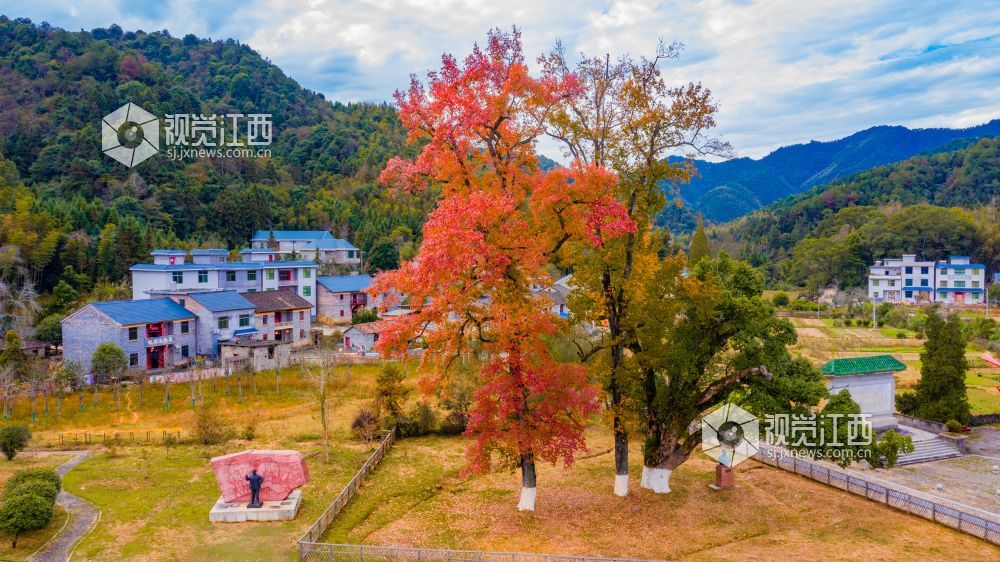 进入初冬,江西省永新县三湾改编旧址的两棵红枫褪去了一身绿色,开始变成了鲜艳的黄色和红色,通红在阳光下熠熠生辉,如黛远山、红色枫叶点燃了五彩斑斓的冬天。