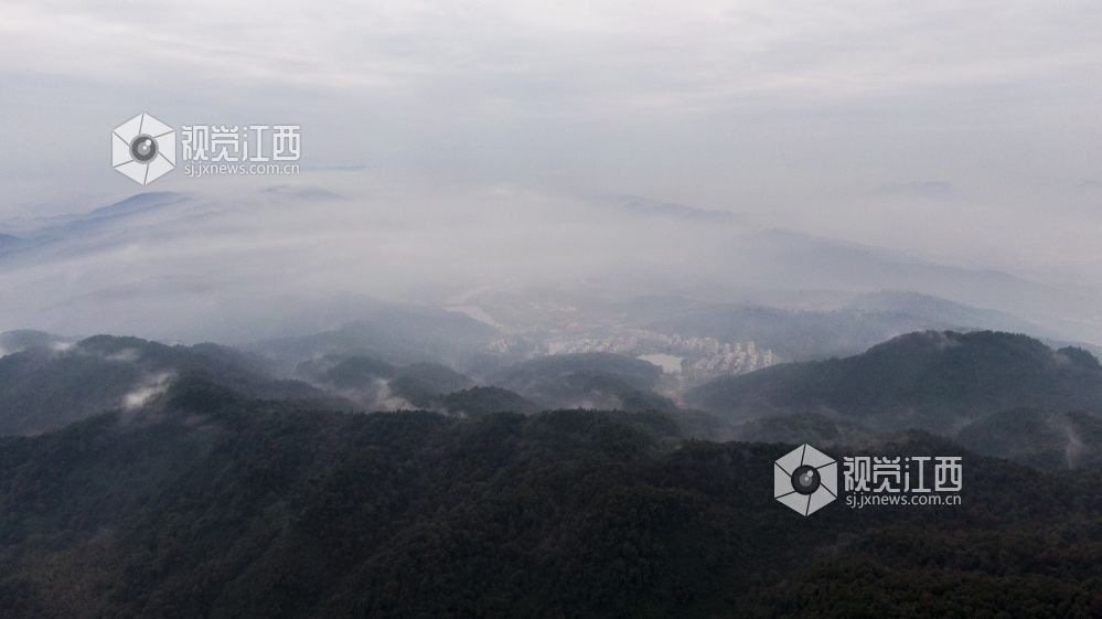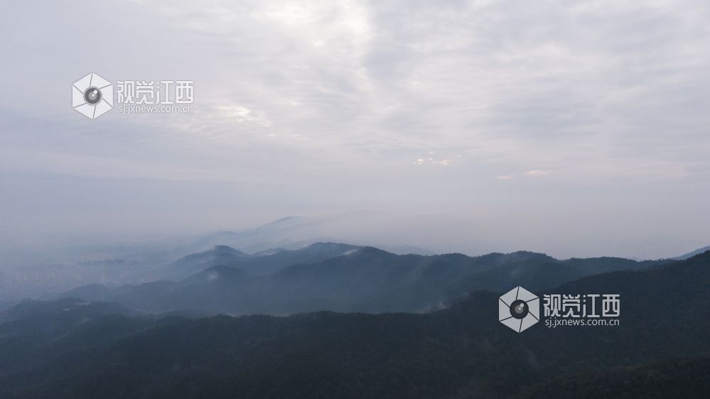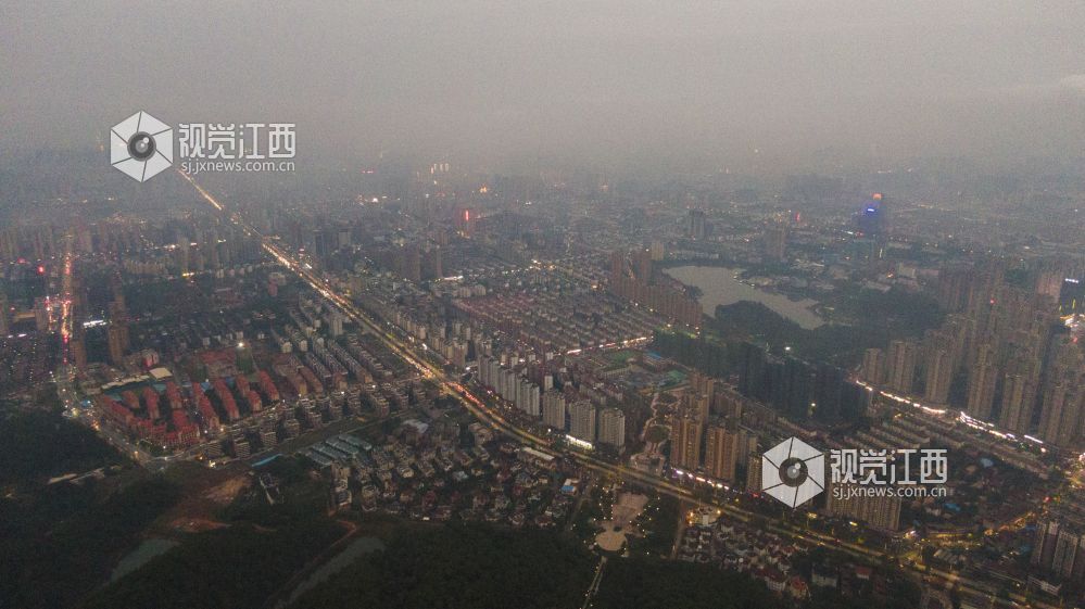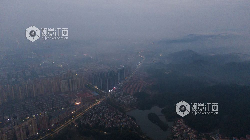 11月17日傍晚时分,雨后的江西省新余市仰天岗山上雾气朦胧,山下华灯初上,夜色斑斓,在雨后晚霞映衬下显得分外妖娆,美丽如画。