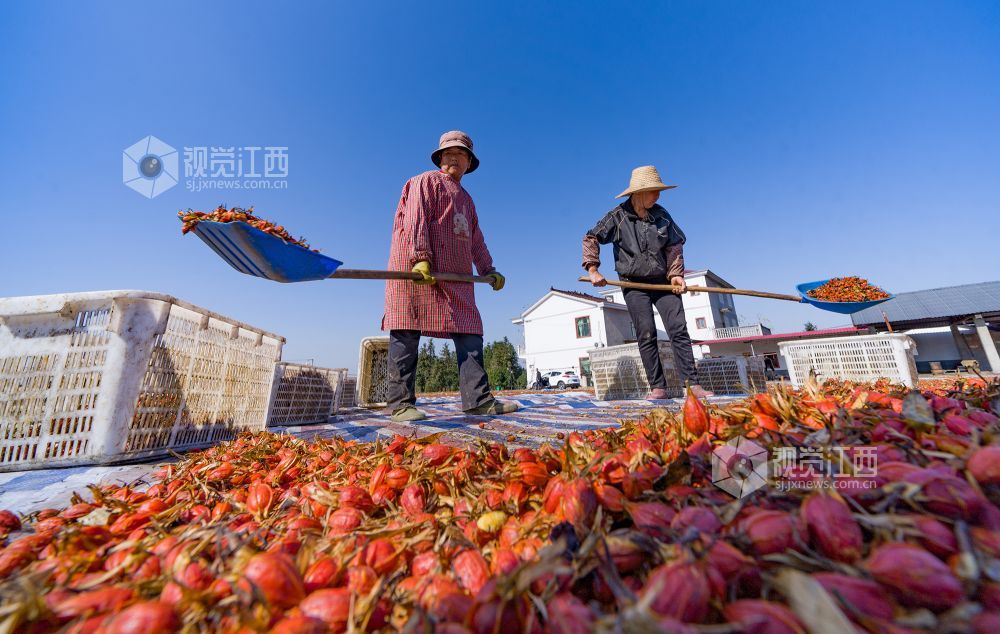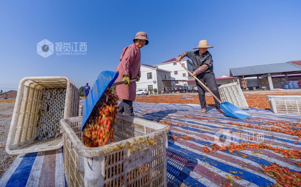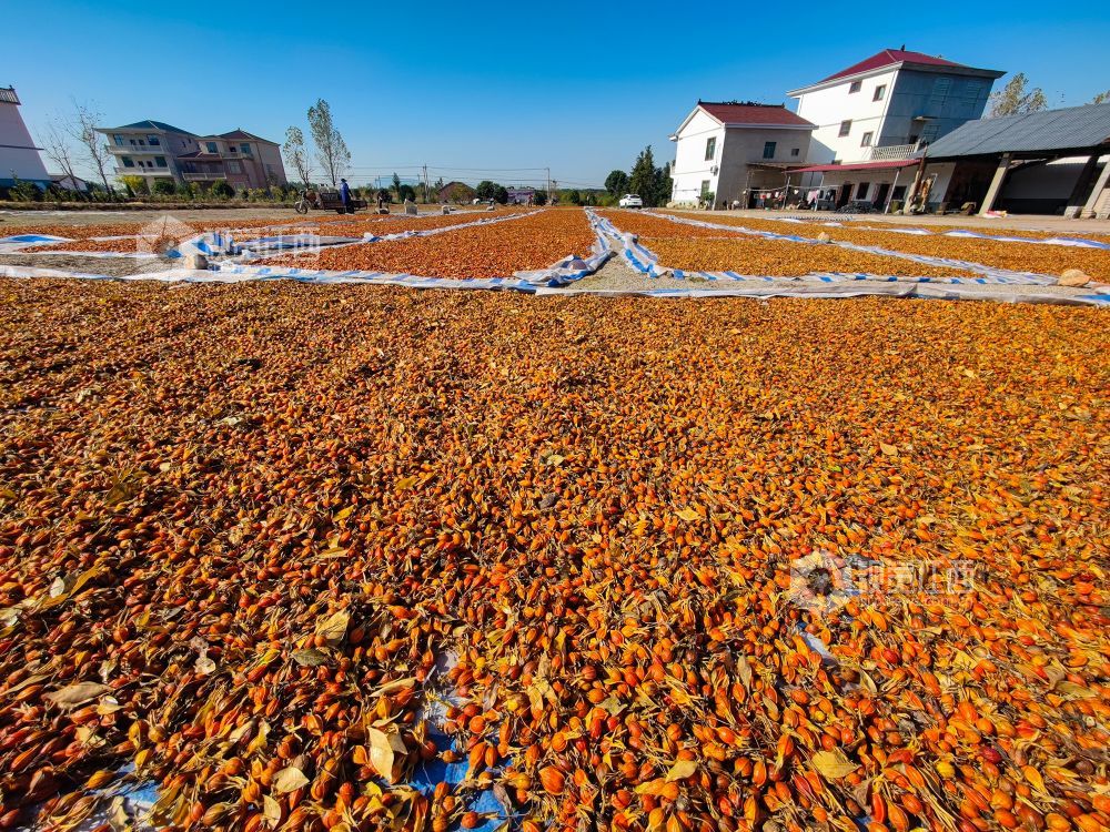 2021年11月17日,江西省抚州市金溪县双塘镇阳光村,农民在收晾晒好的黄栀子。