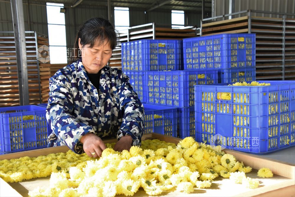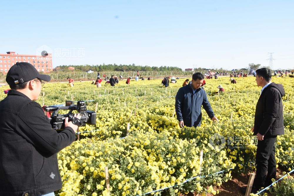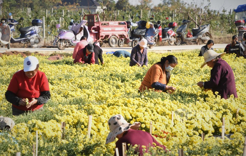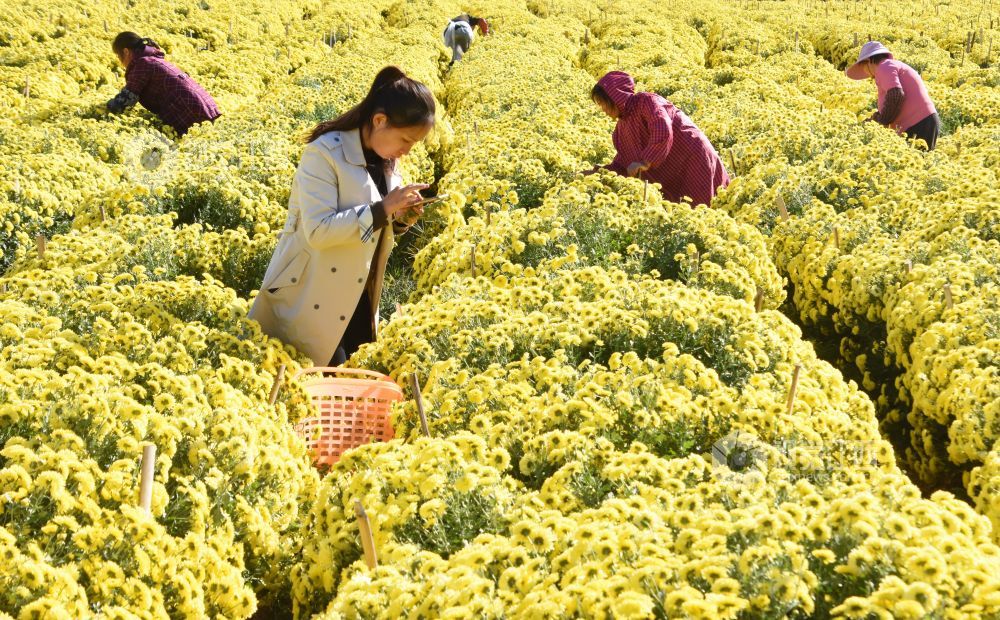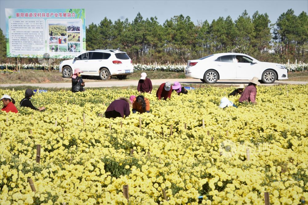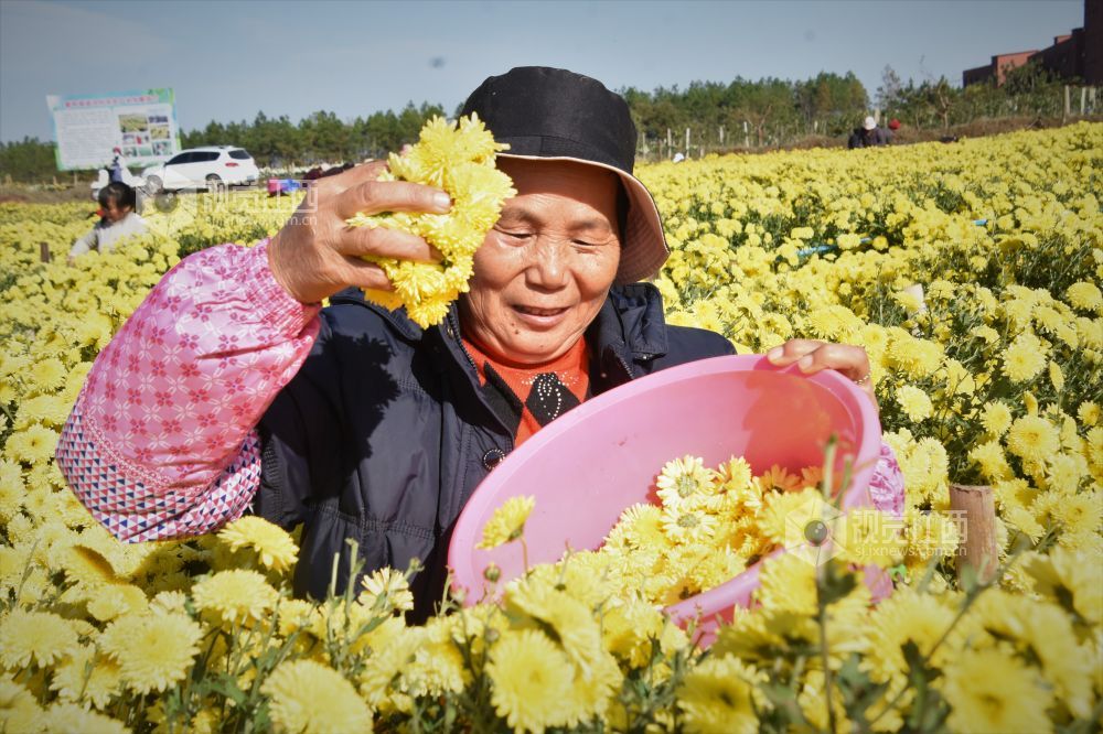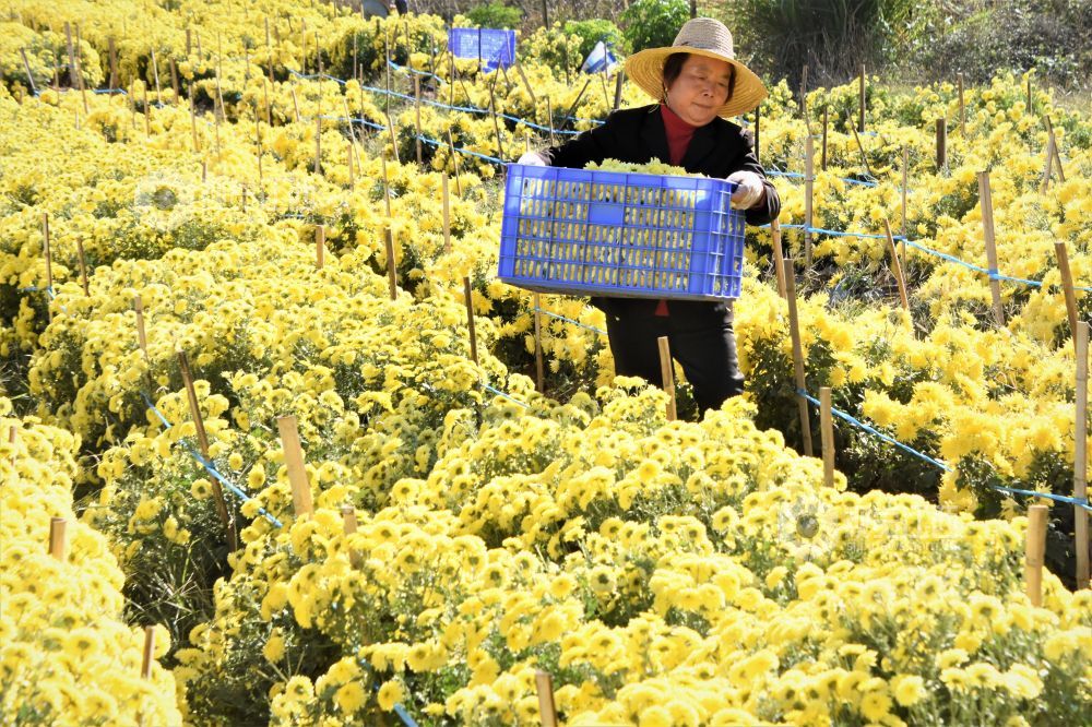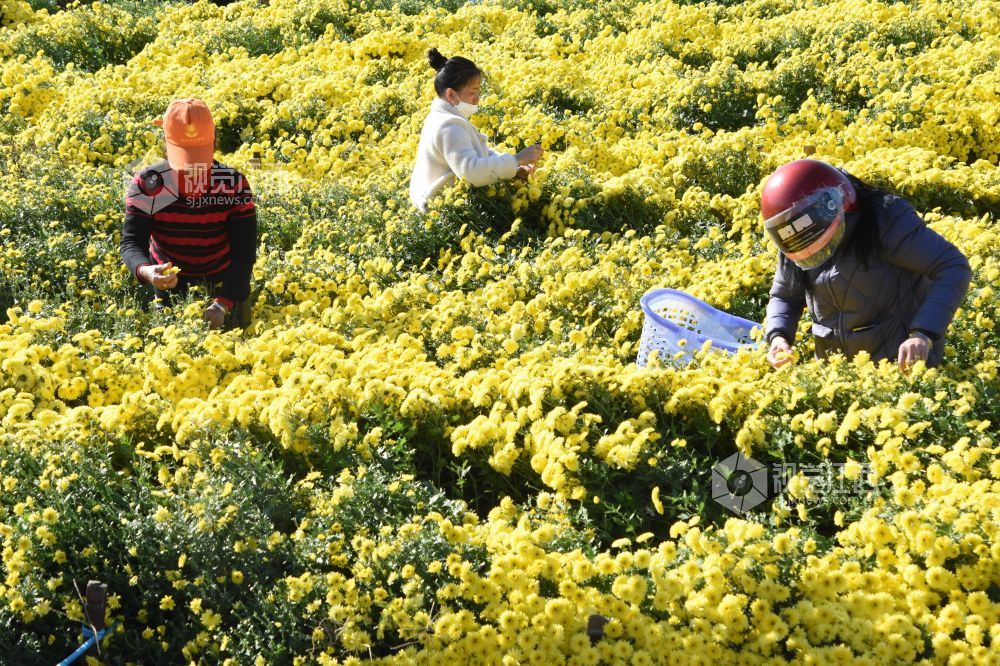 2021年11月23日,江西省鄱阳县鄱阳镇道汊村村民们正在村后特色药材基地采摘黄金菊花。近年来,该镇党委积极引导鼓励所属乡村因地制宜发展ー村ー品特色产业,走共同富裕之路,促推乡村振兴。