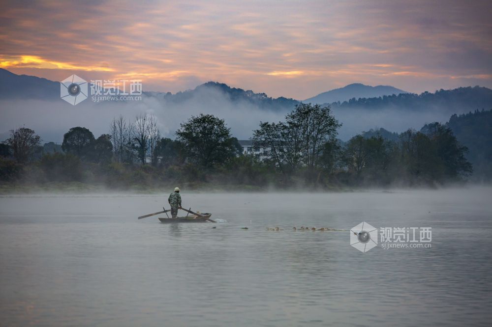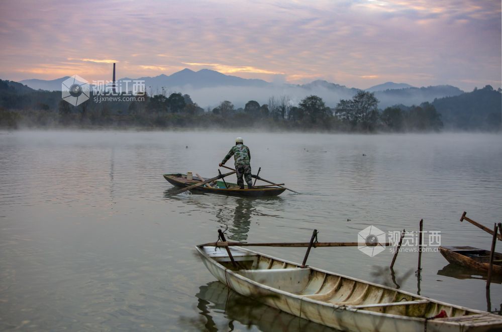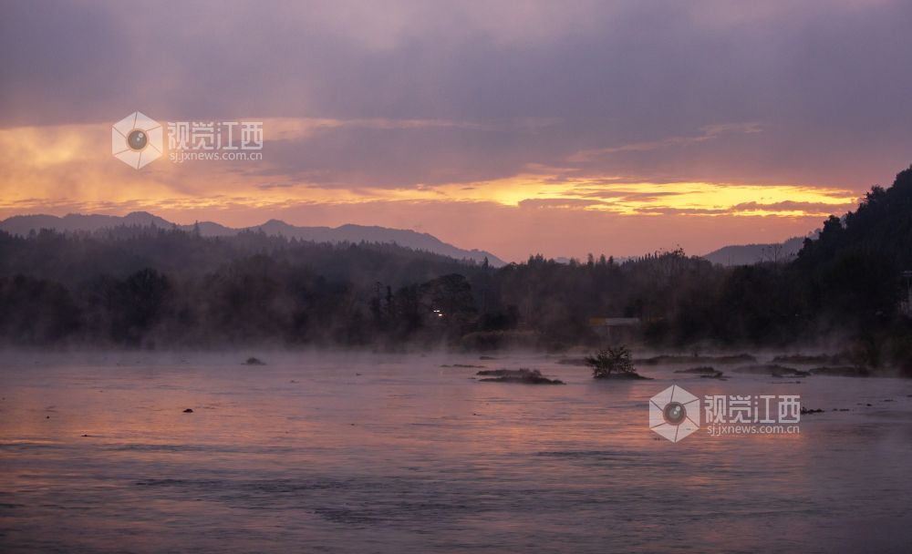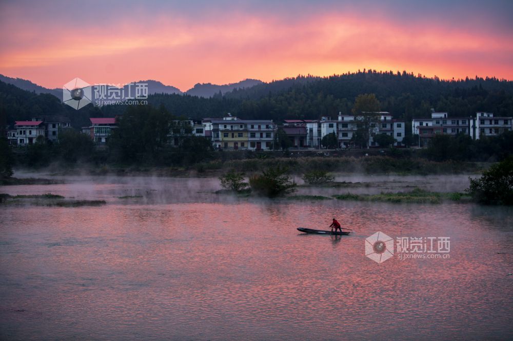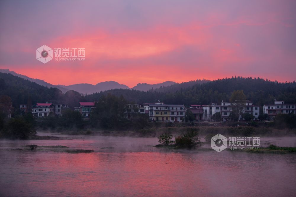 2021年11月24日清晨,江西省分宜县洋江镇境内的袁河上雾气升腾,整个河面像是披上了洁白无瑕的衣裳,天边绚丽多彩的朝霞染红了河水,恍若到了人间仙境般的天堂,让人如痴如醉。