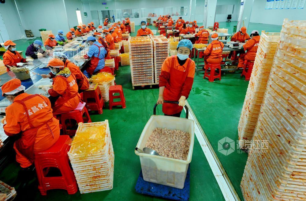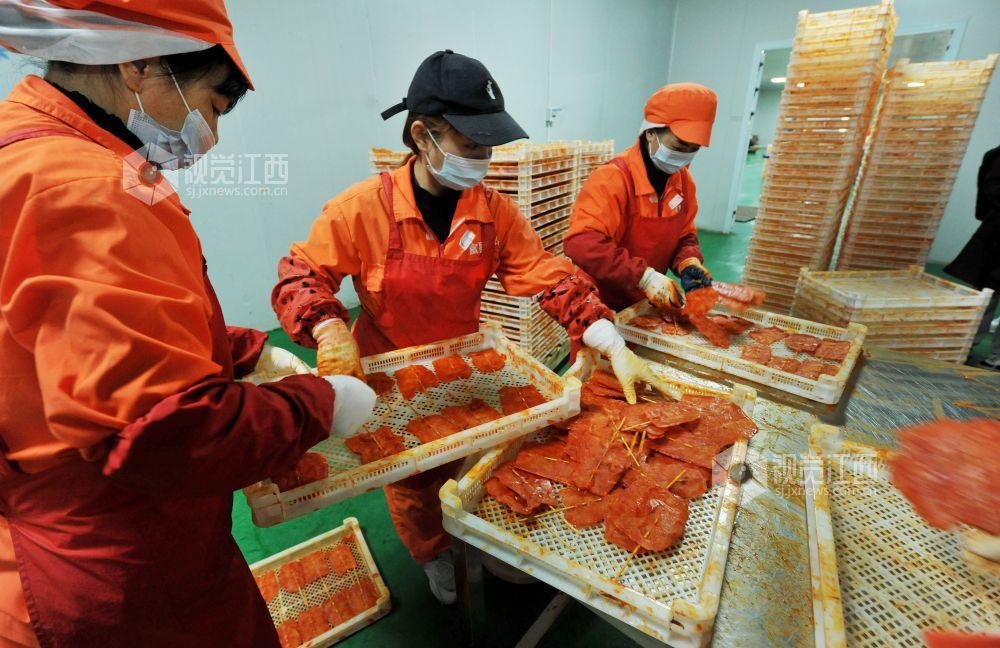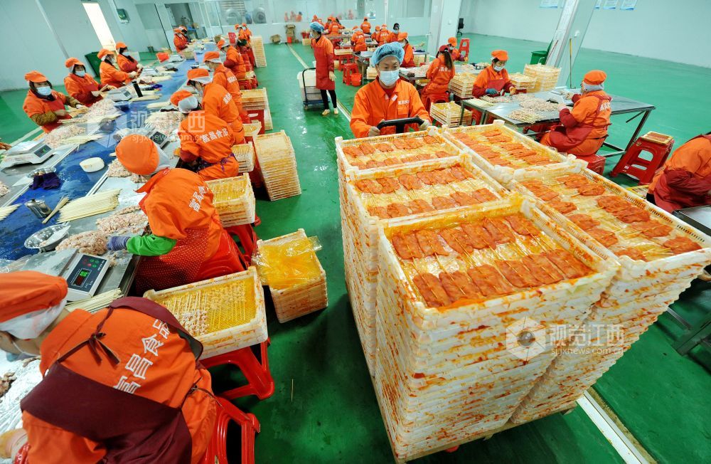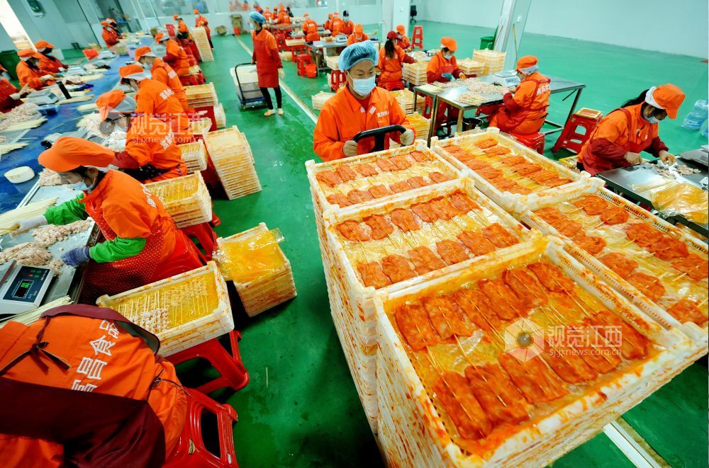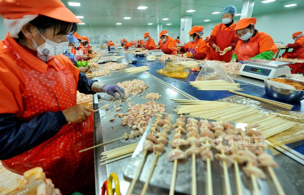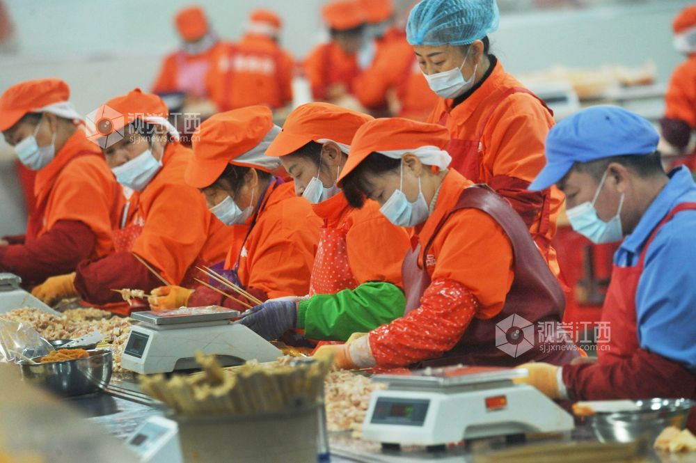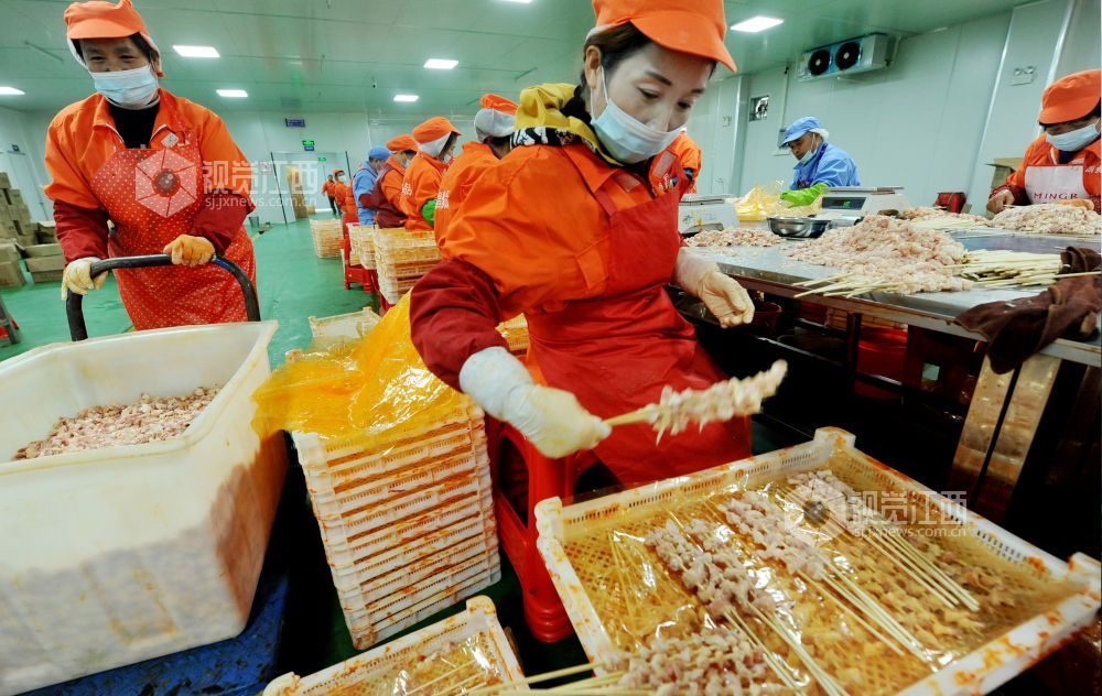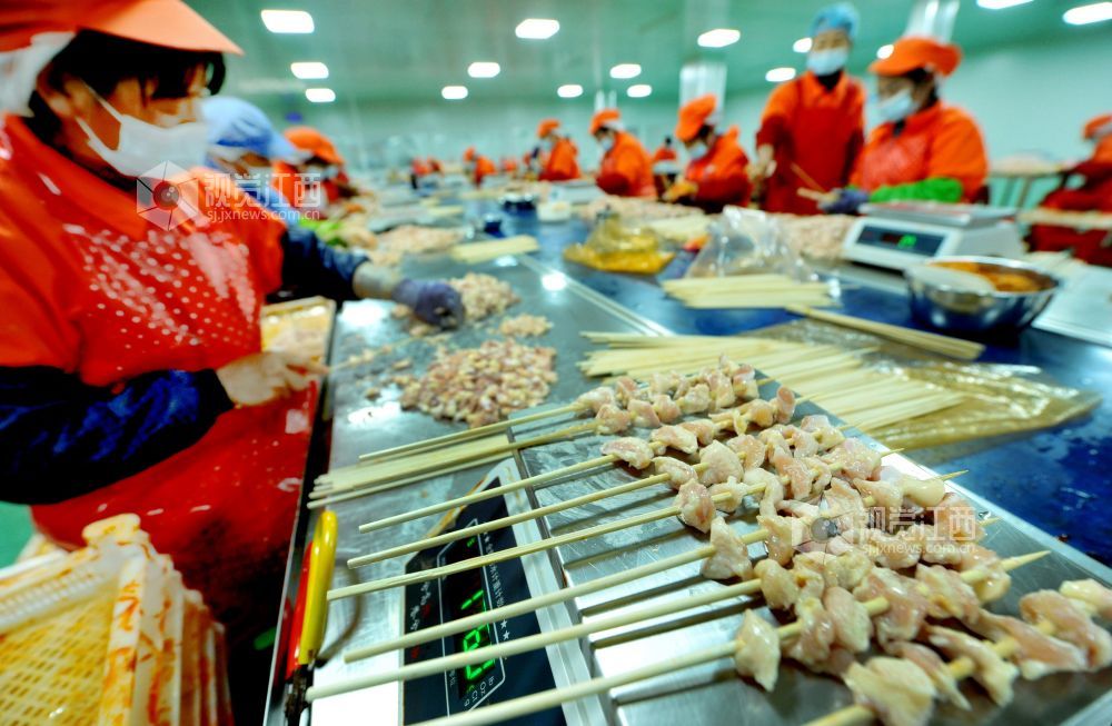 2021年11月29日,江西省贵溪市滨江镇婆桥村一食品加工企业员工正在加紧赶制销往湖北武汉的订单肉串。