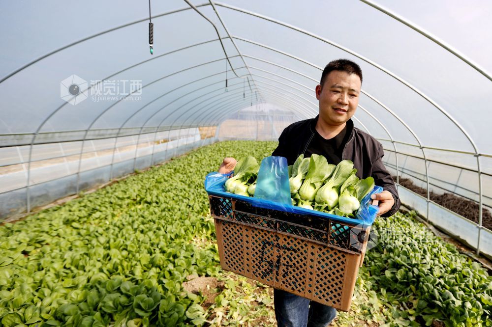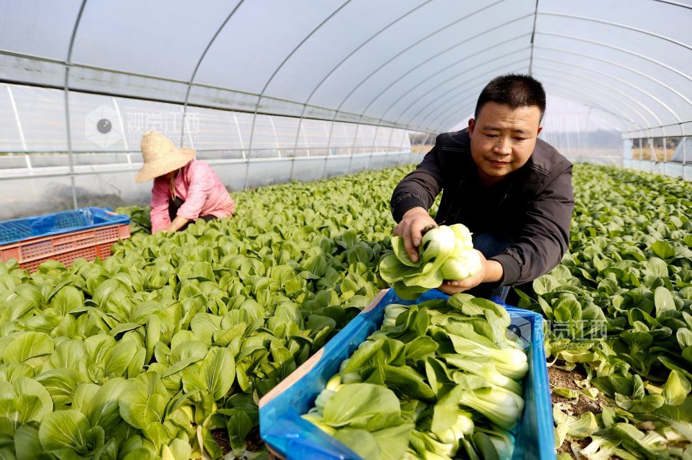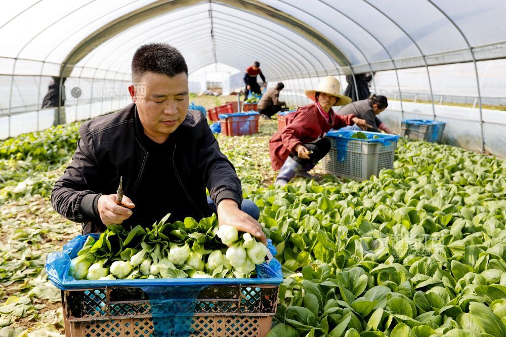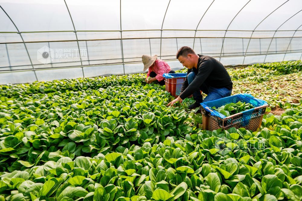 2021年11月29日,在江西省吉安市峡江县马埠镇下茨村蔬菜种植基地,姚淼带领村民在采摘小白菜。姚淼返乡后,带领村民流转70余亩土地,发展大棚蔬菜种植,走上了致富路。
