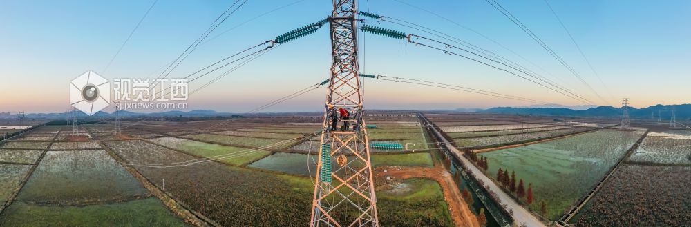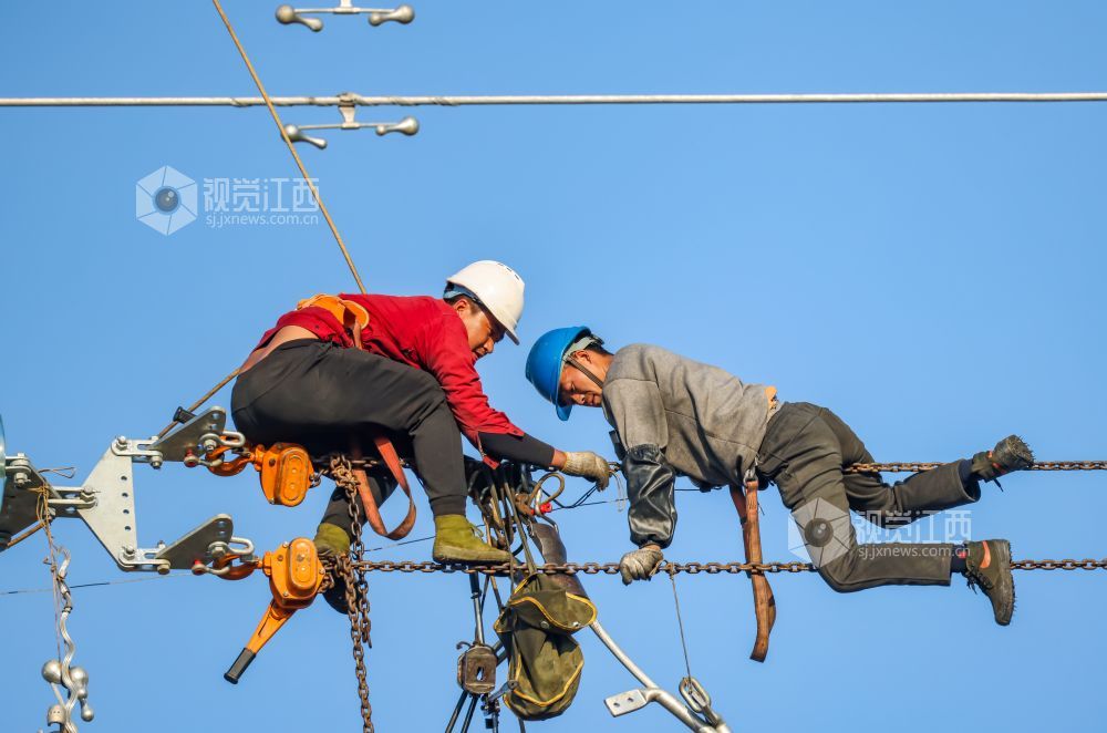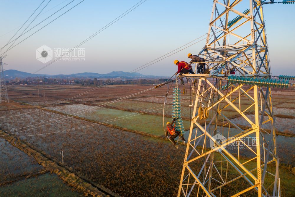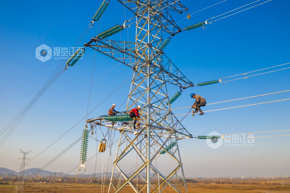 2021年12月6日,在江西省瑞昌市赛湖农场螺丝港,工人们正在安九高铁庐山站专供线路铁塔上忙碌施工,以确保工程在今年12月中旬全部完工并投入使用。