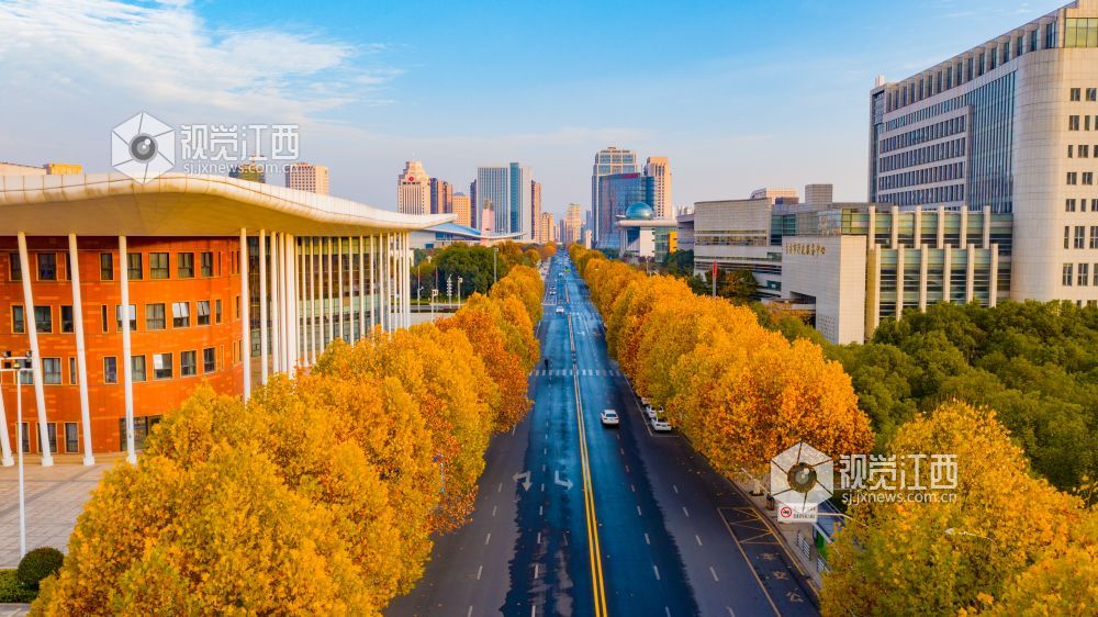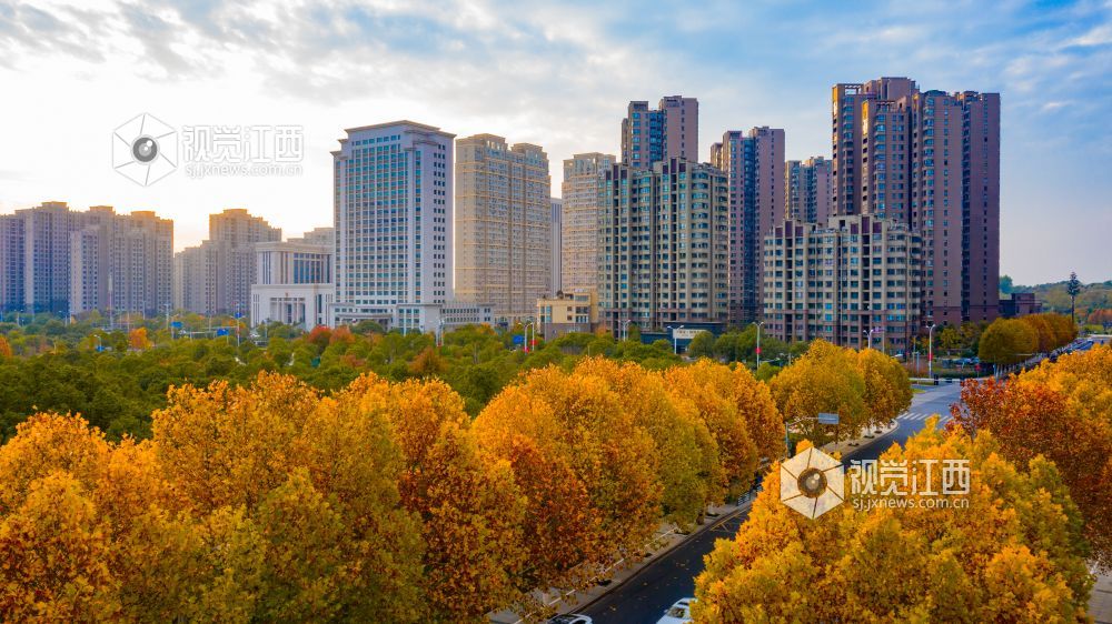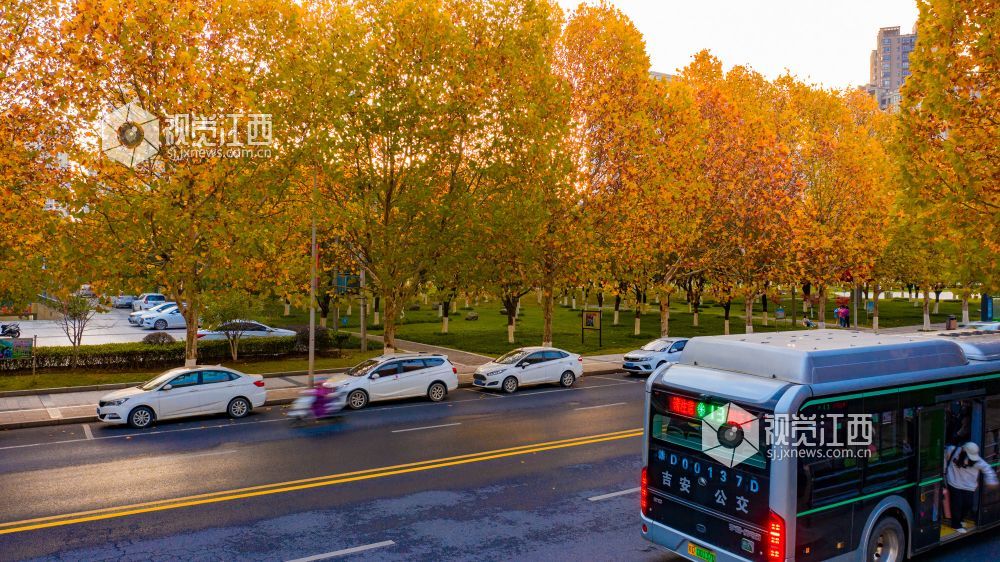 在江西吉安市城南的尚义路,一排长长的梧桐树的树叶已经渐渐变黄,将道路两旁装扮的靓丽多姿。各种颜色渲染交织,犹如一幅油画。