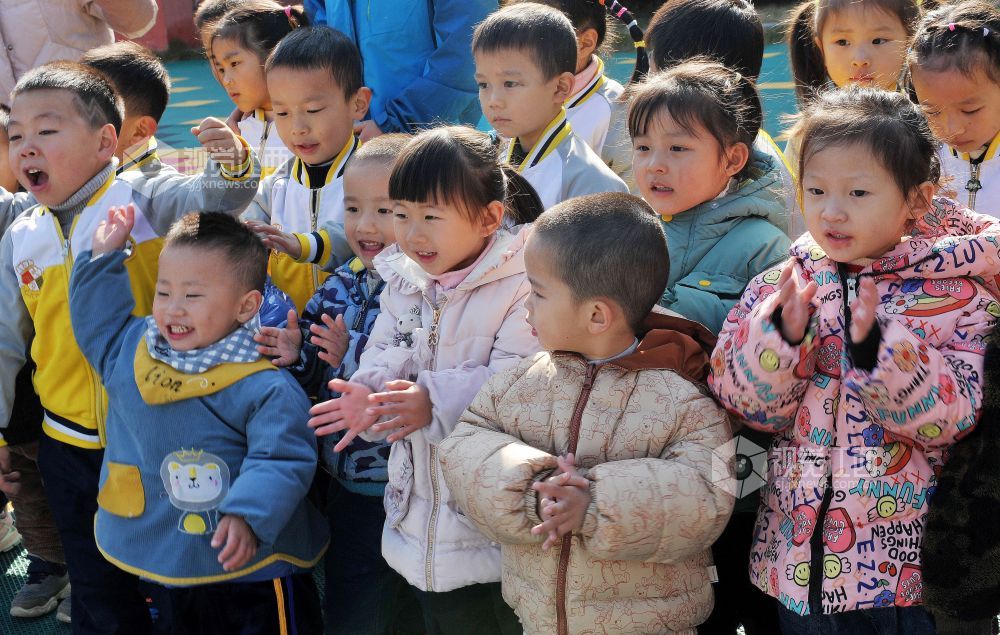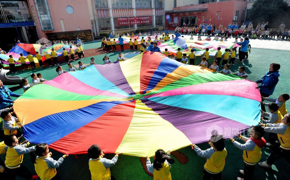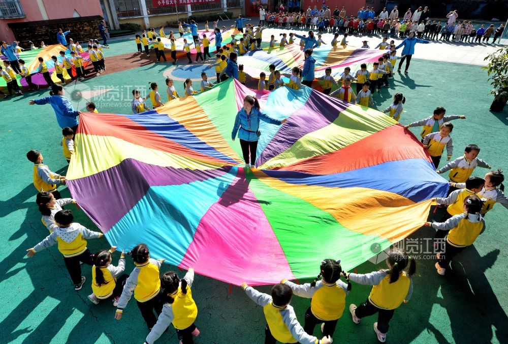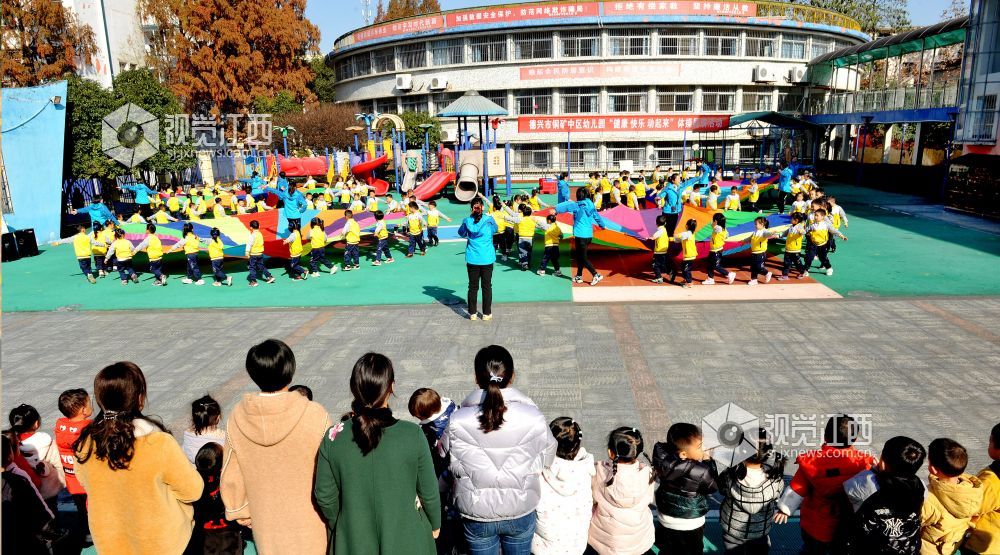 2021年12月8日,江西省德兴市铜矿中区幼儿园大班的小朋友和老师正在开心舞动彩虹伞。