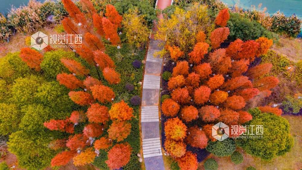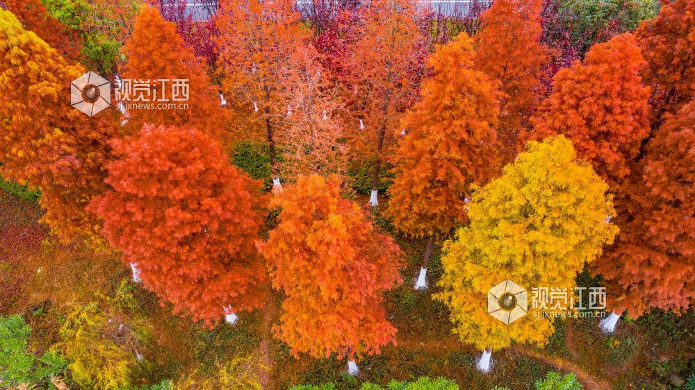 初冬时节,在江西省吉安市新干县湿地公园内的水杉林浸染“红妆”,迎来最佳观赏期。一排排高大的水杉屹立挺拔,蔚为壮观。在阳光的映照下,犹如簇簇焰火缤纷盛放,形成一幅美丽的天然画卷,吸引许多市民前往观赏。