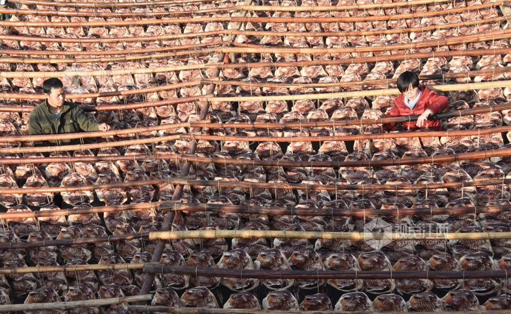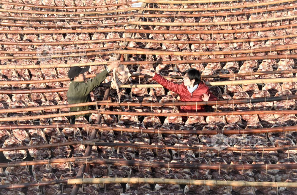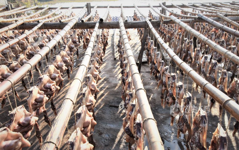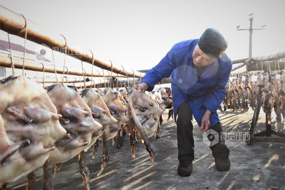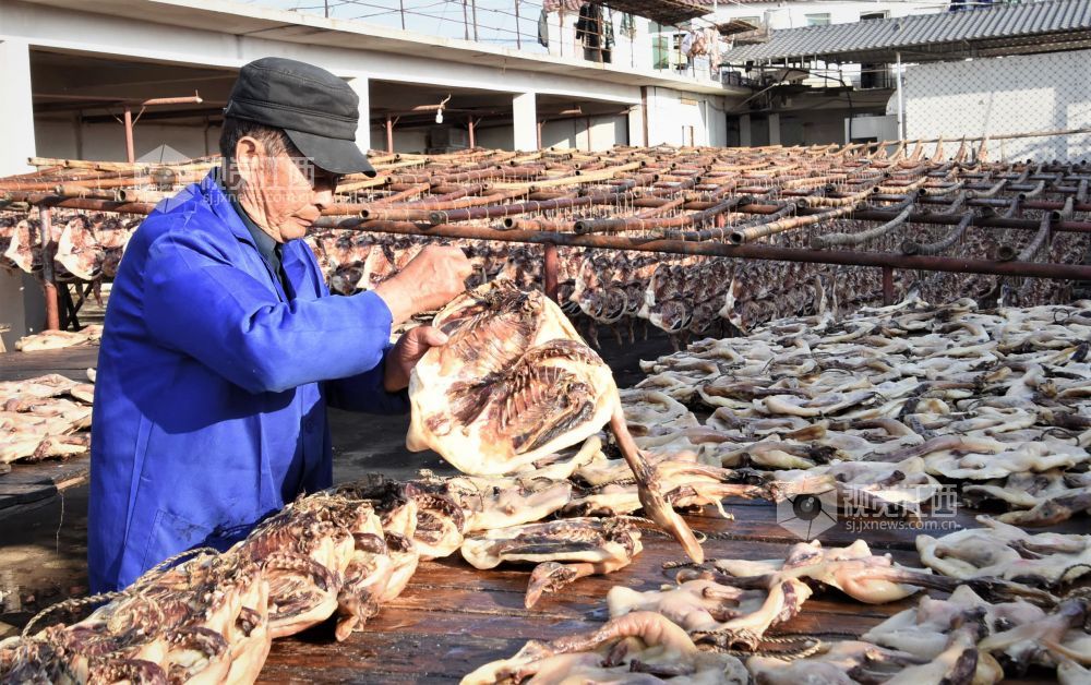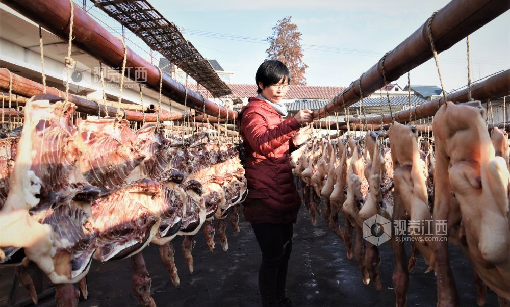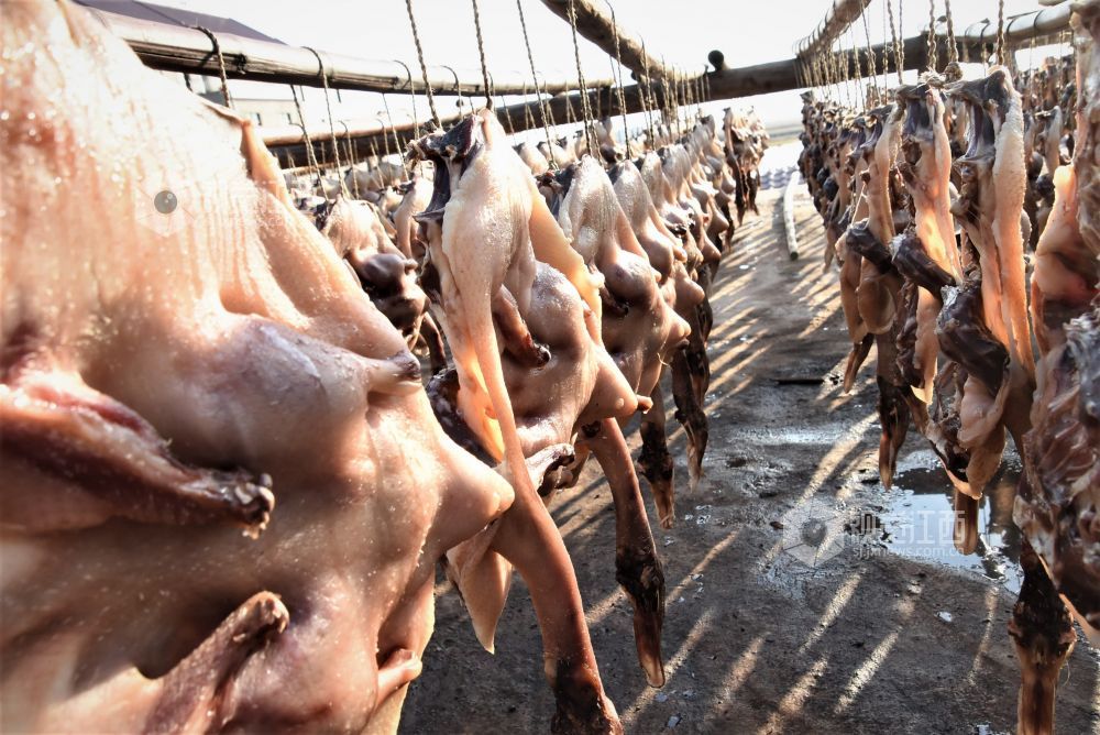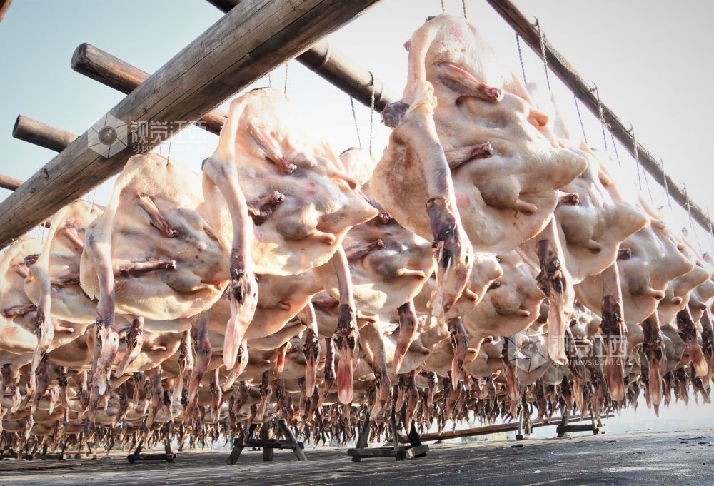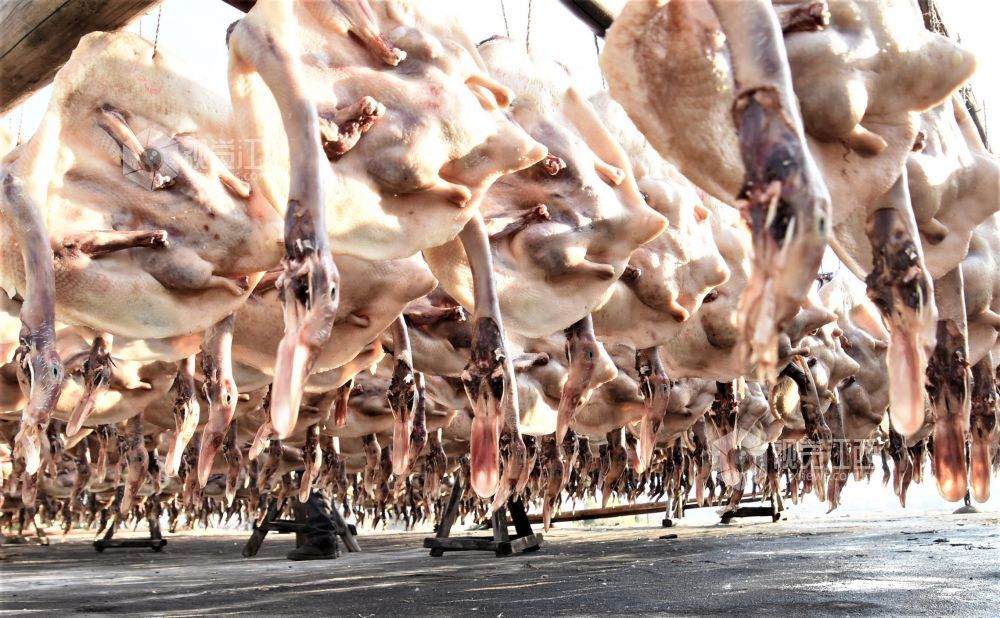2021年12月19日,农历冬至前夕,江西省鄱阳县饶丰镇空气中处处都能闻着板鸭的飘香味,这里手工制作腌制传统板鸭已有半个世纪。