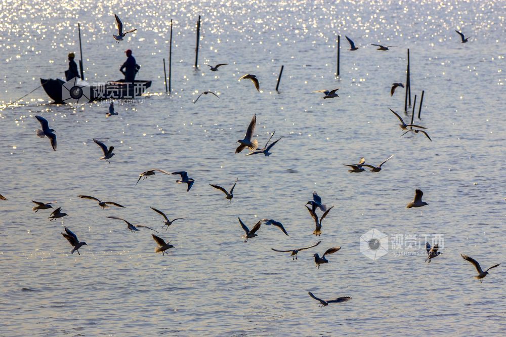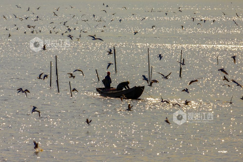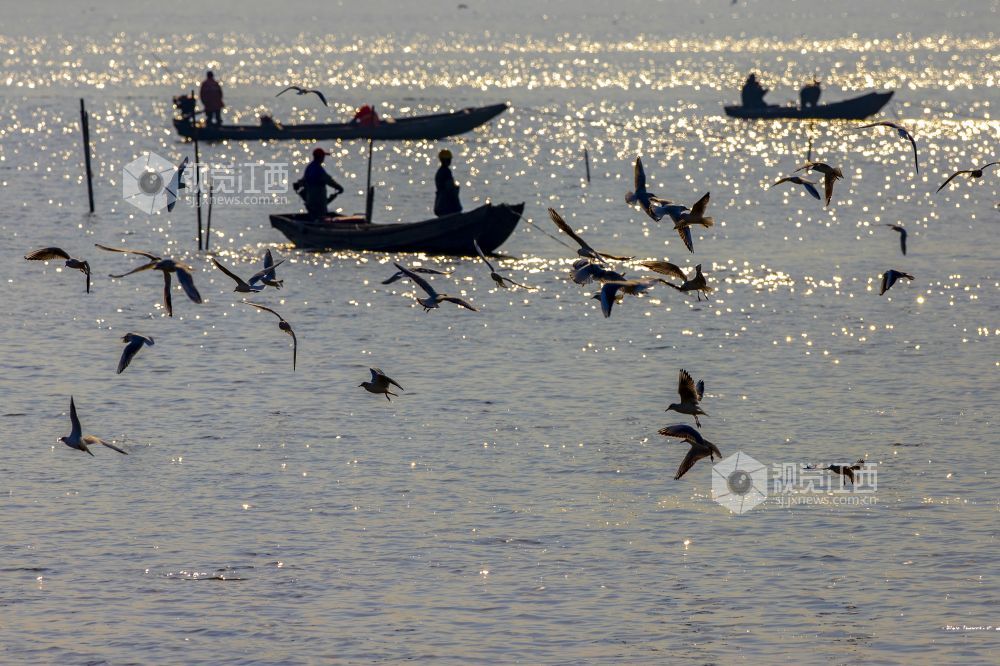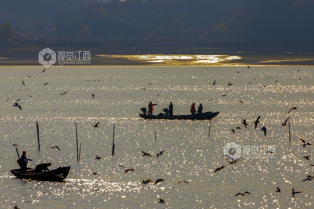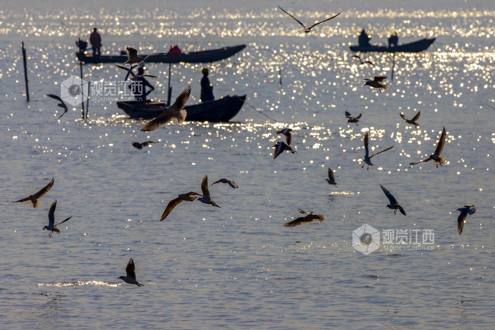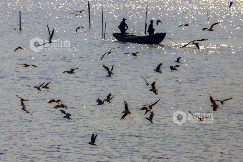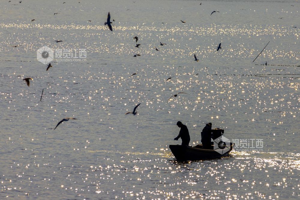 仲冬时节,江西省九江市湖口县南北港水产场湖面波光粼粼,劳作的渔民与起落的须浮鸥乐此不疲,呈现一派人与自然和谐共处的美景。