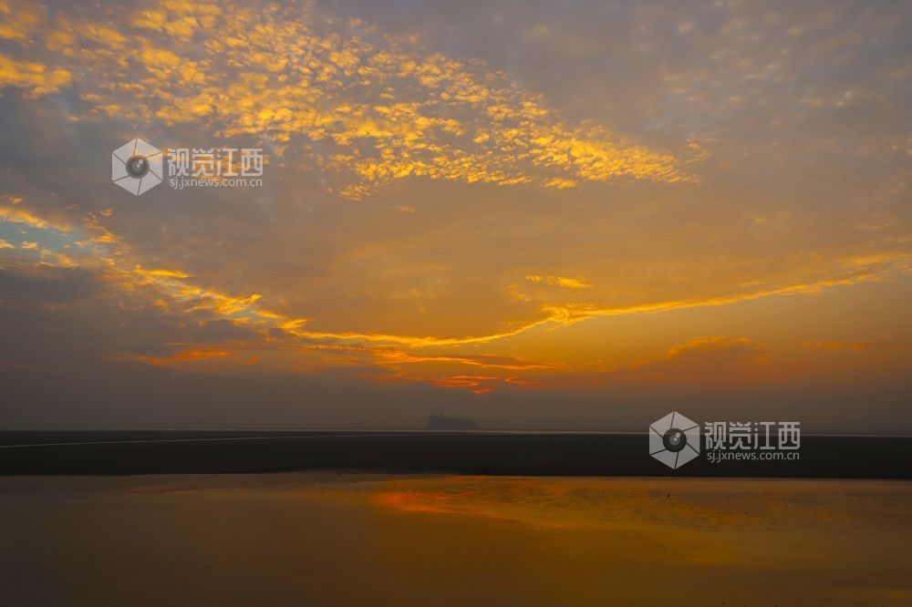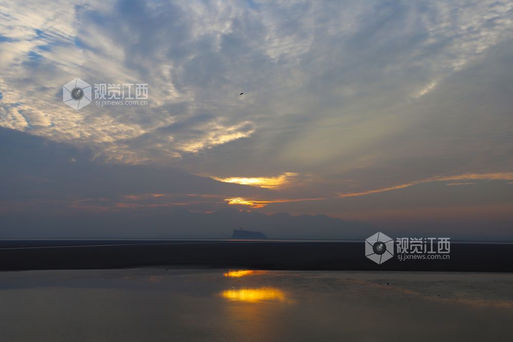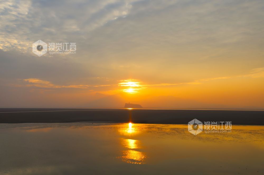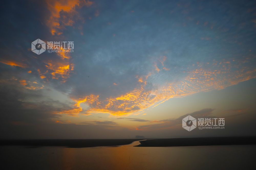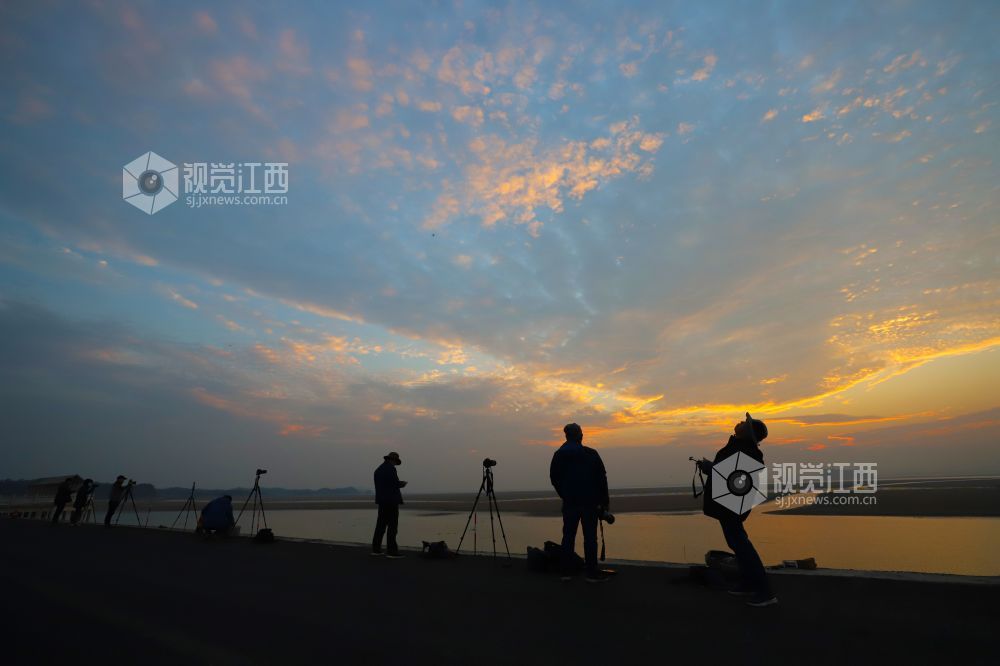 12月20日,江西鄱阳湖水位持续回落,湖口县鄱阳湖水域的鞋山,呈现出枯水一线、霞光满天的美景,不少摄影爱好者慕名前来打卡。