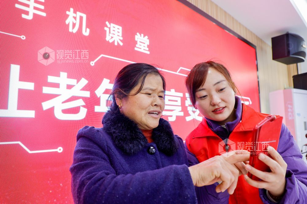 2021年12月21日,在江西省吉安市峡江县玉笥社区,新时代文明实践志愿者在给老人讲解智能手机使用方法。
