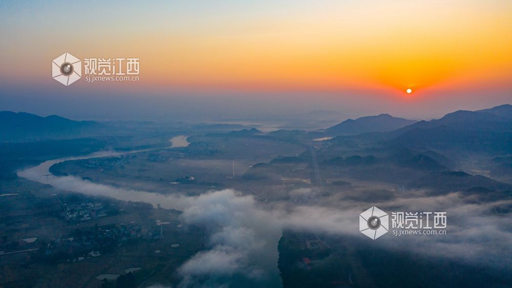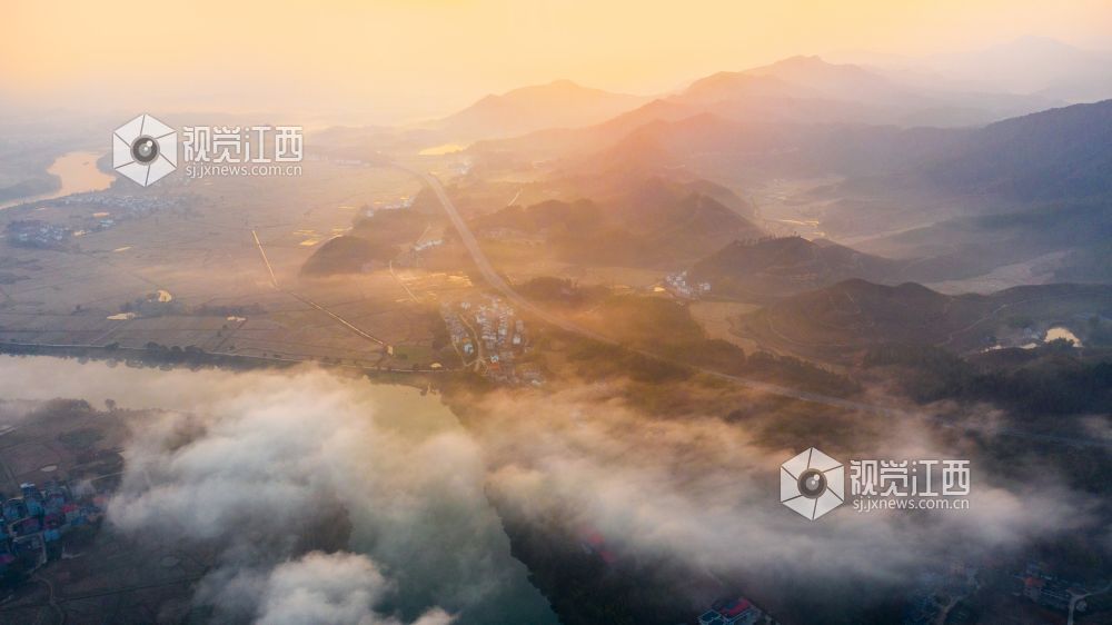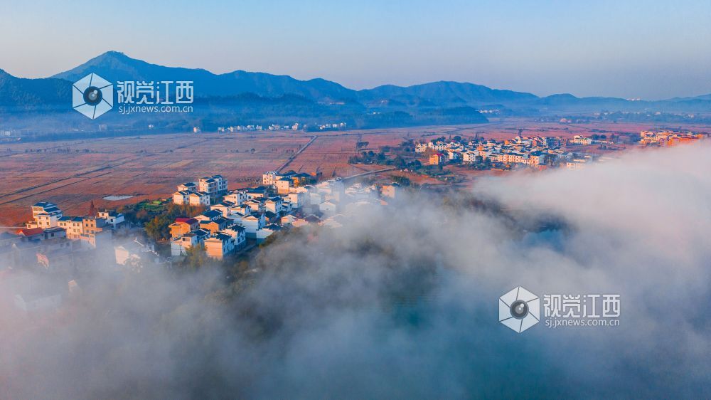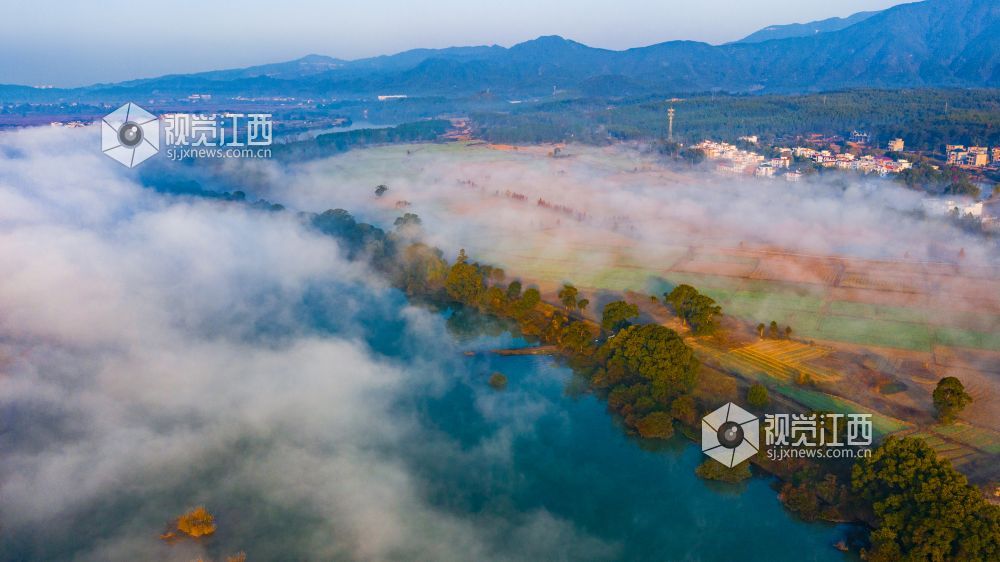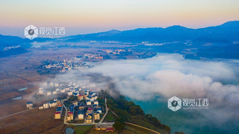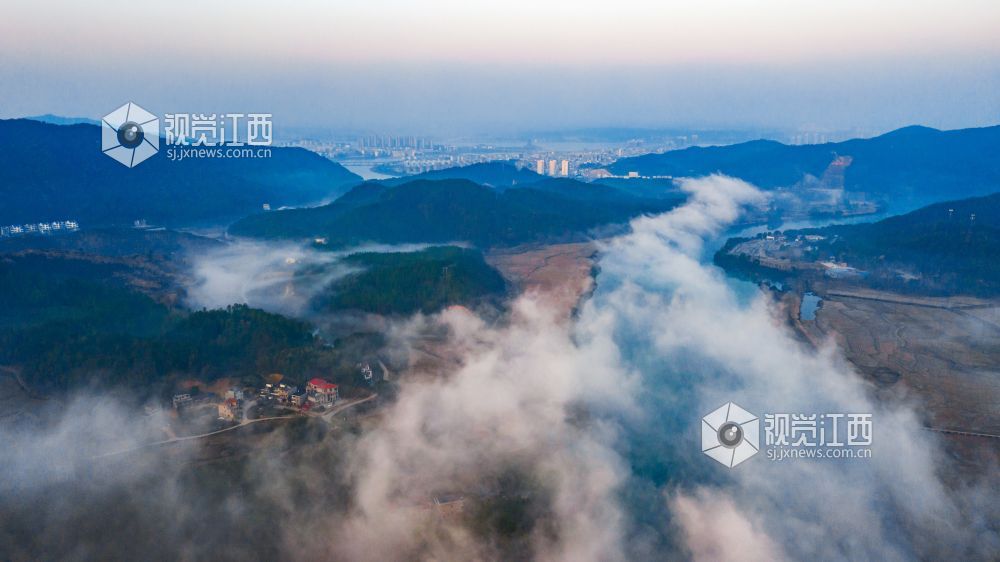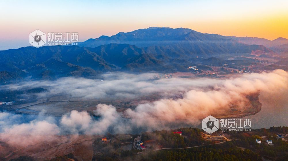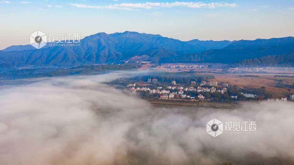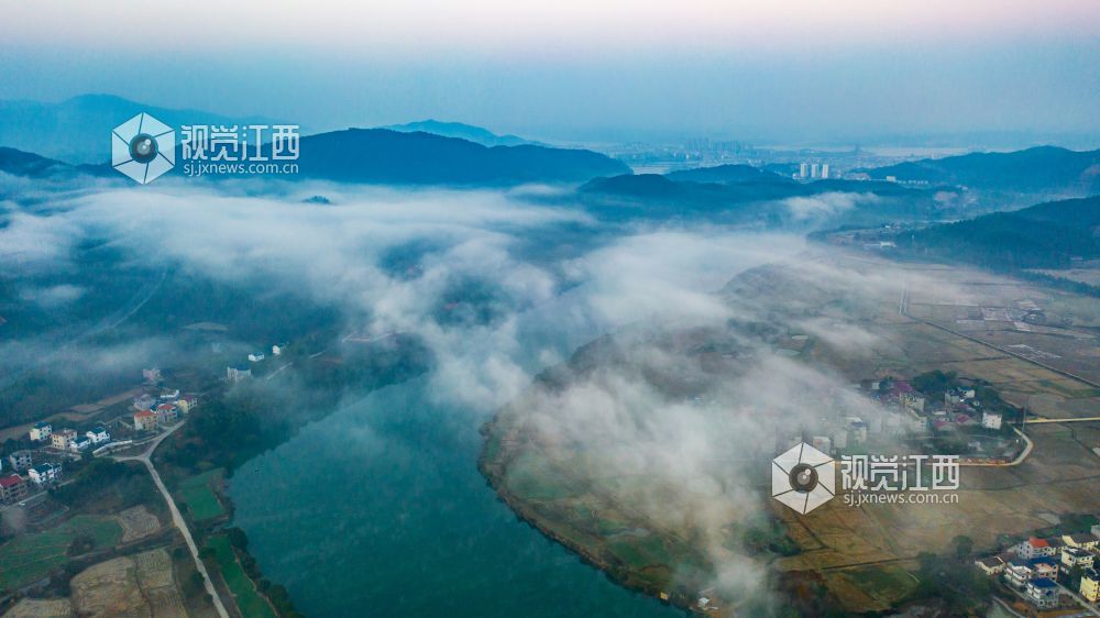 初冬的清晨, 在江西省吉安市吉水县乌江两岸的炉下村、鱼梁村、井头村等乡村都被浓厚的平流雾所笼罩,云海环绕山峰,云雾层层叠叠。