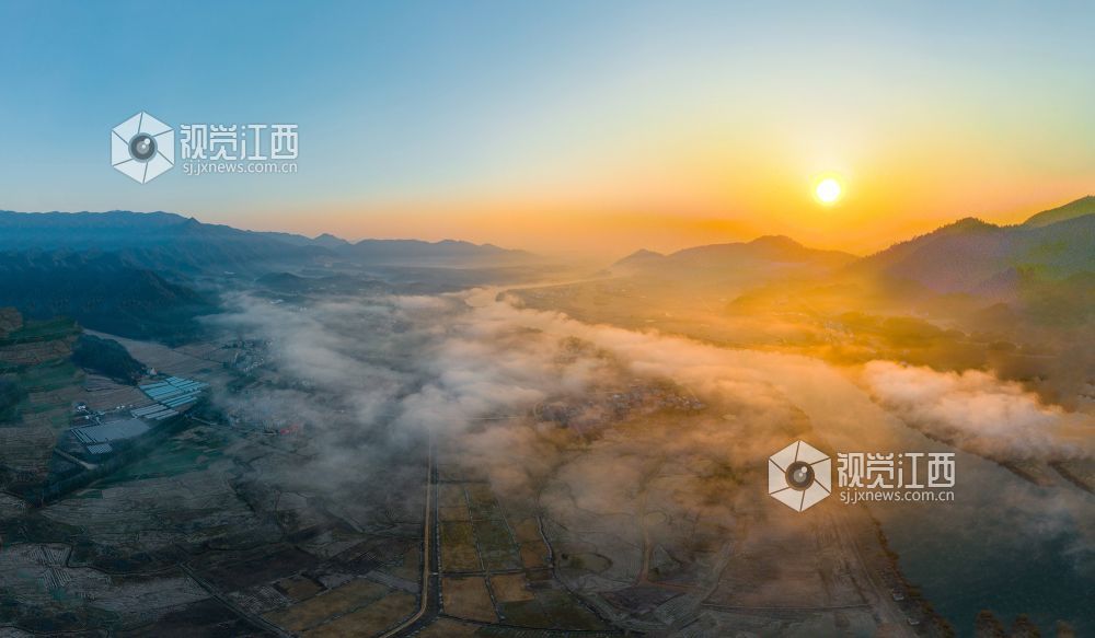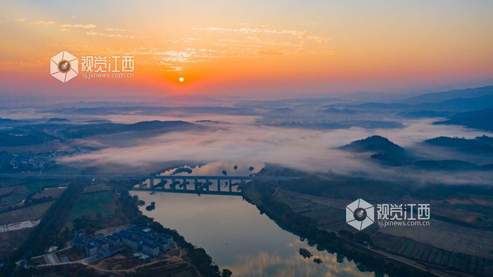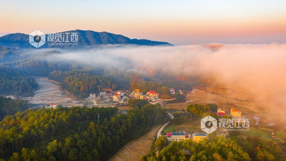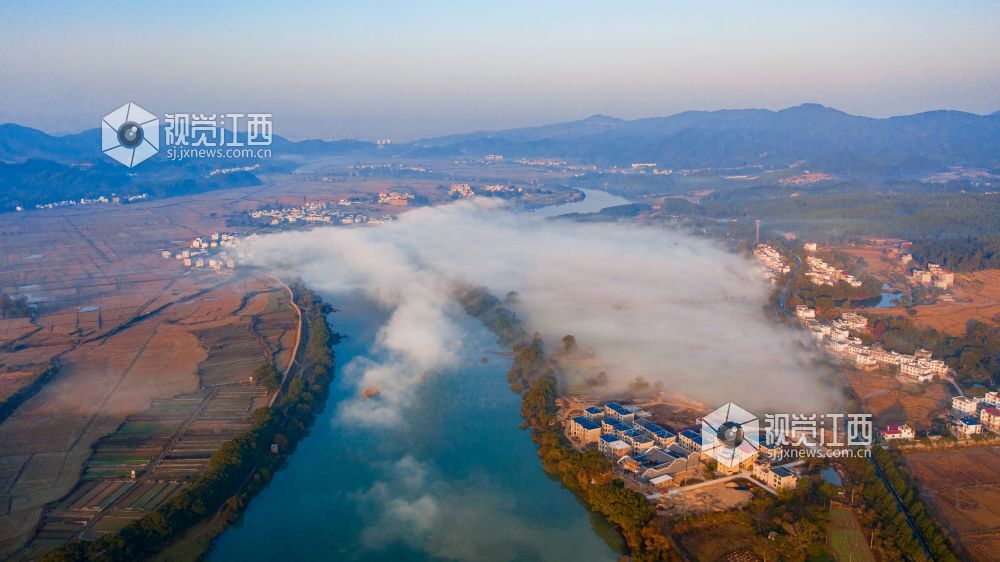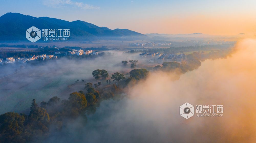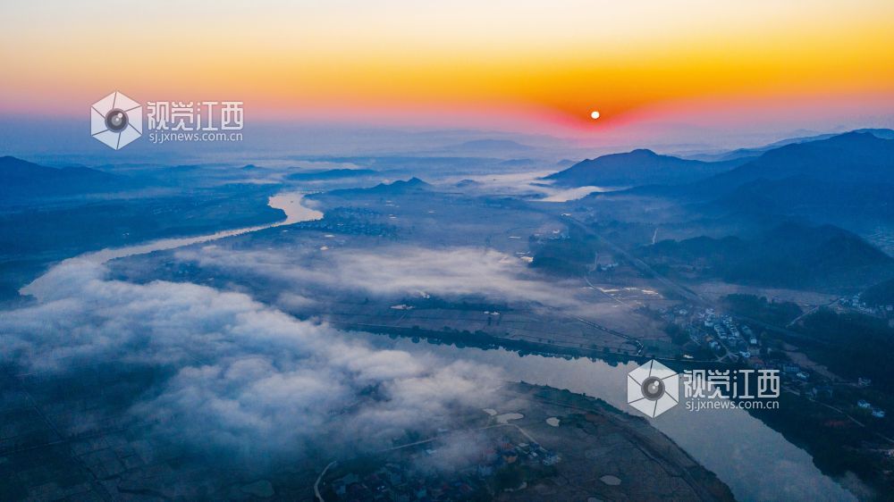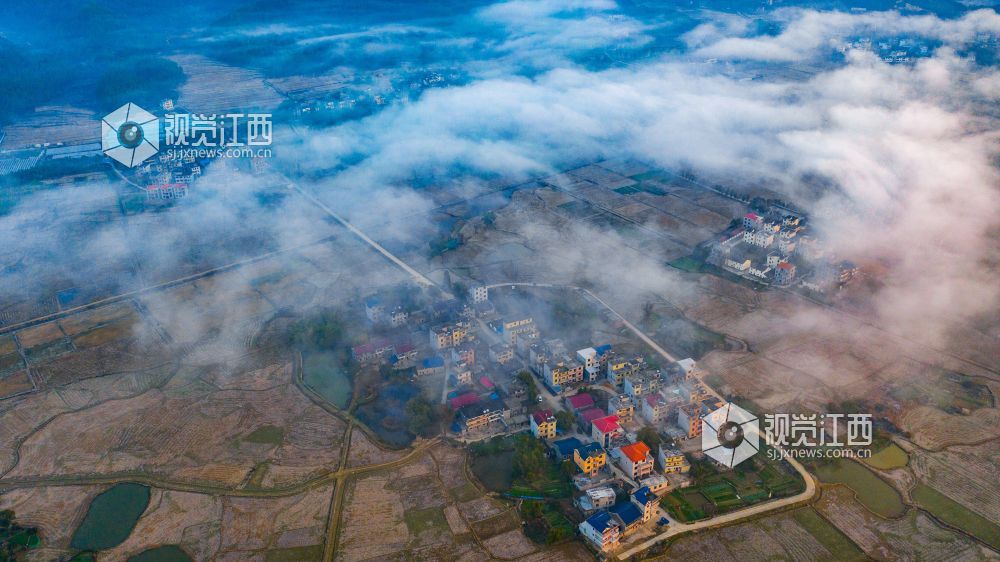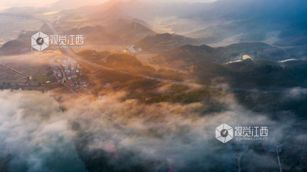 初冬的清晨, 在江西省吉安市吉水县乌江两岸的炉下村、鱼梁村、井头村等乡村都被浓厚的平流雾所笼罩,云海环绕山峰,云雾层层叠叠。