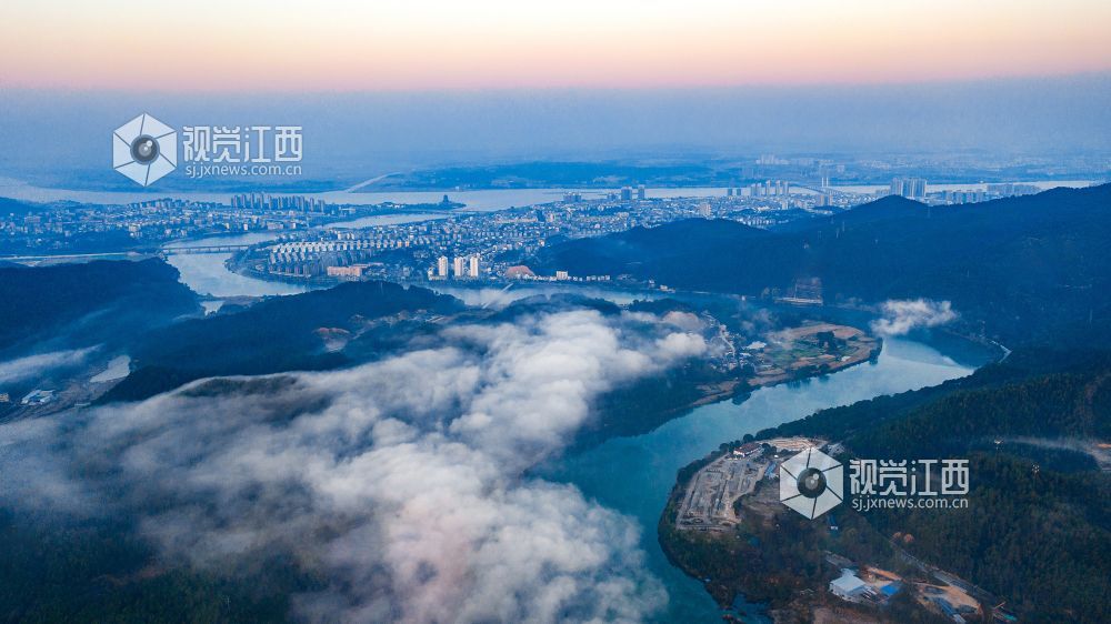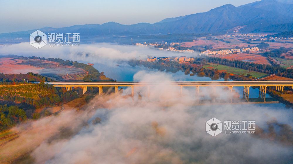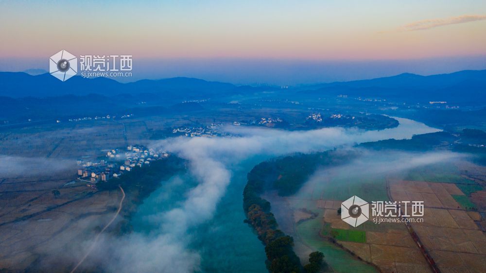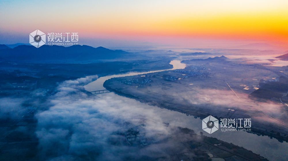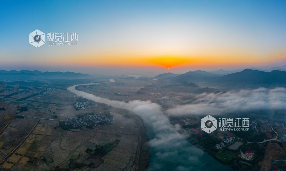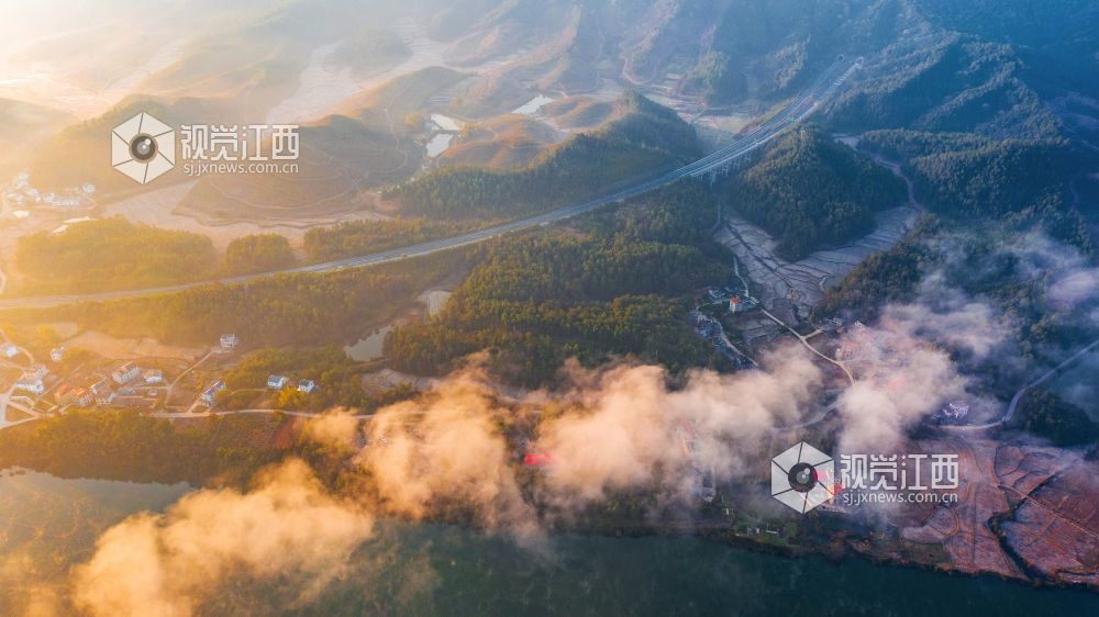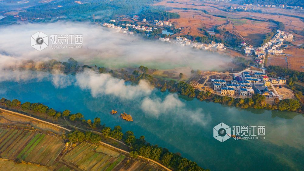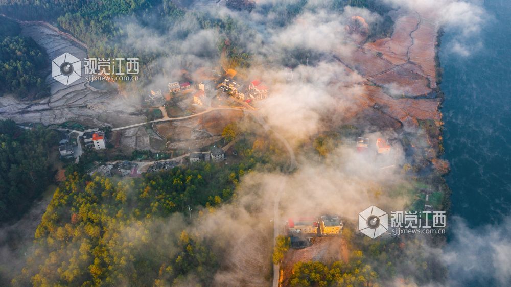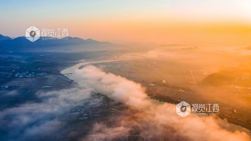初冬的清晨, 在江西省吉安市吉水县乌江两岸的炉下村、鱼梁村、井头村等乡村都被浓厚的平流雾所笼罩,云海环绕山峰,云雾层层叠叠。