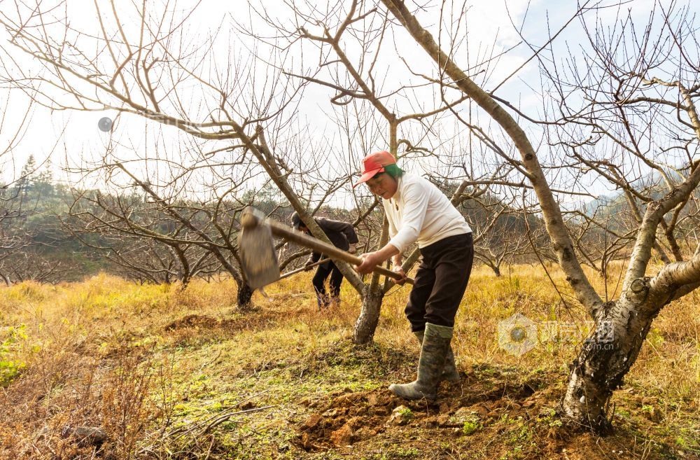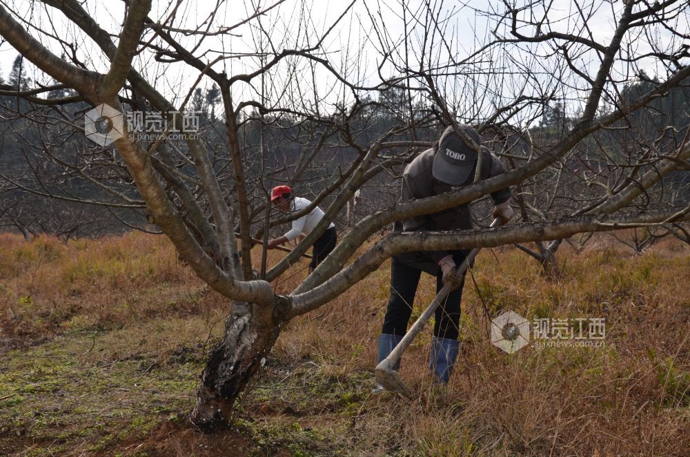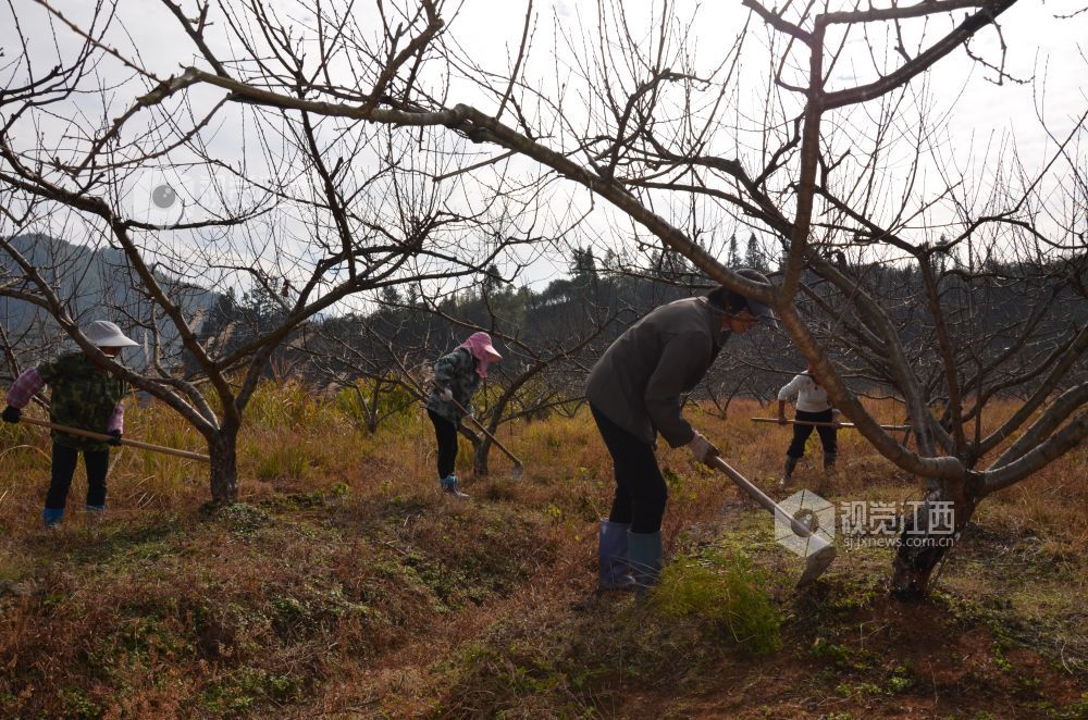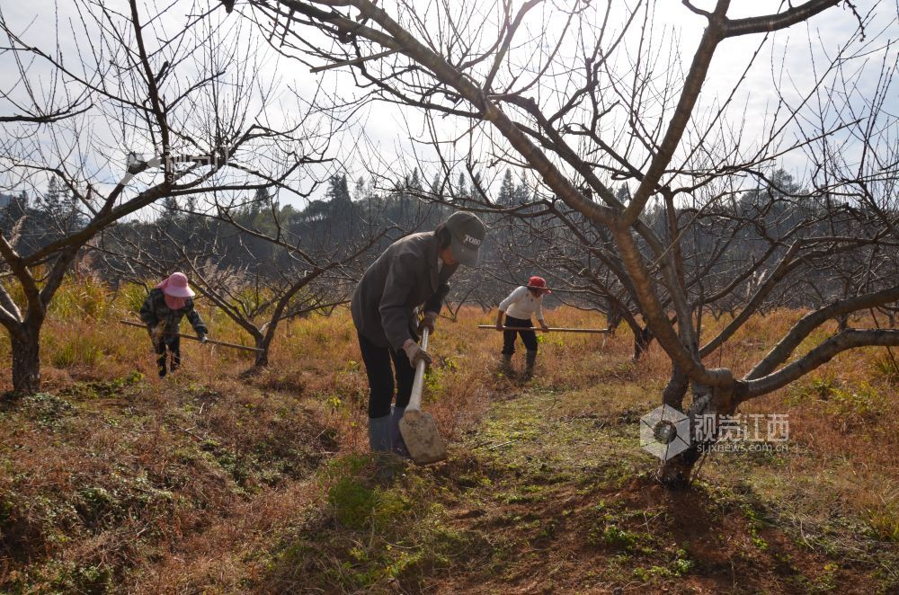 12月22日,江西省永新县曲白乡白沙村黄桃基地内一派繁忙的景象,果农们在致富带头人李小清的指导下,忙着给桃树除草、剪枝整形,为来年果业丰产增收打好基础。