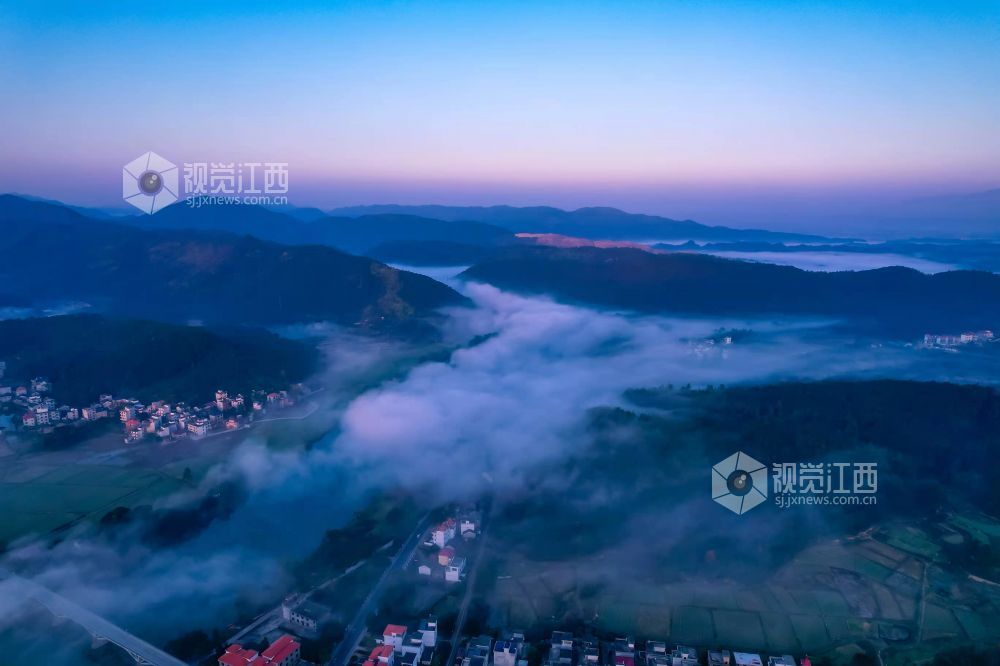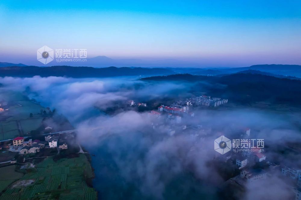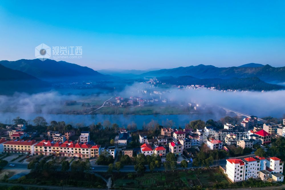 12月24日,冬日清晨,江西省永新县在中乡洋湖村在晨雾的笼罩下,禾河两岸的村庄如梦如幻,构成一幅幅美丽的生态画卷。