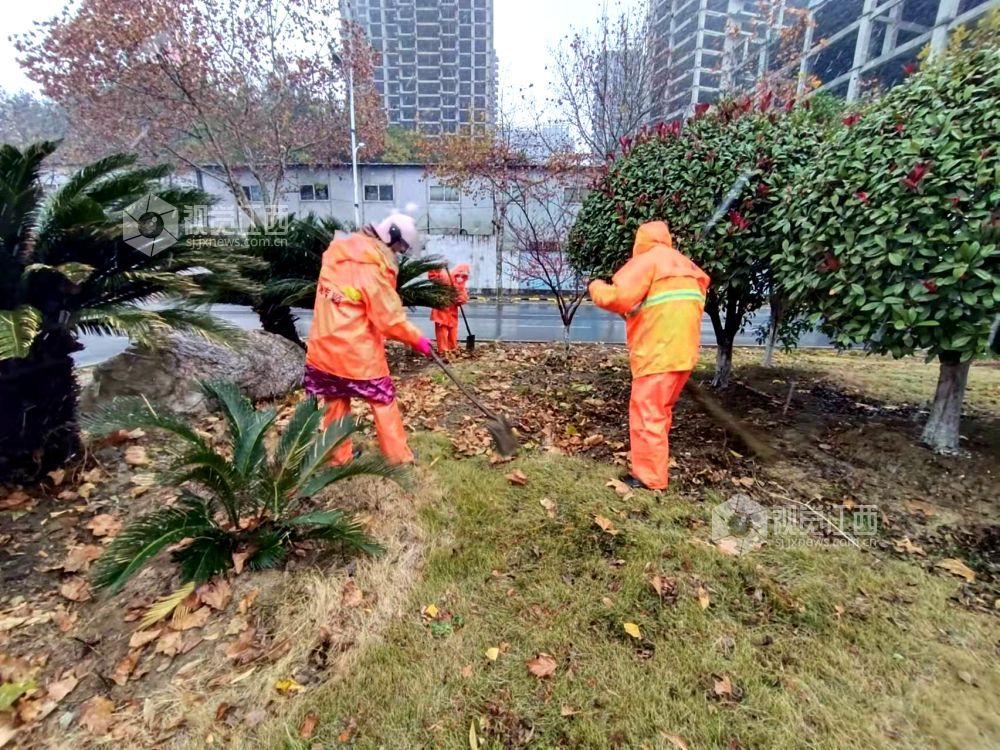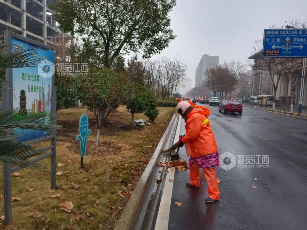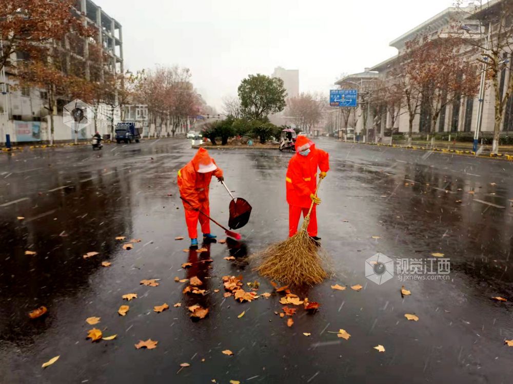 2021年12月25日,在江西省九江市湖口县台山大道,身穿橘红色工作服的环卫工人冒着雪花正清扫着路面和绿化带上的垃圾。