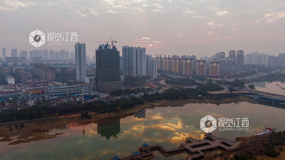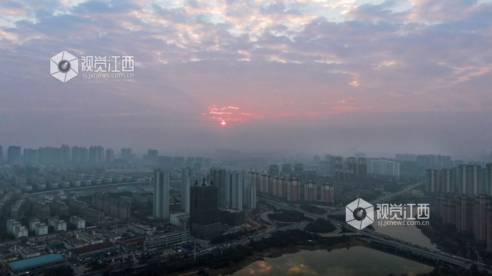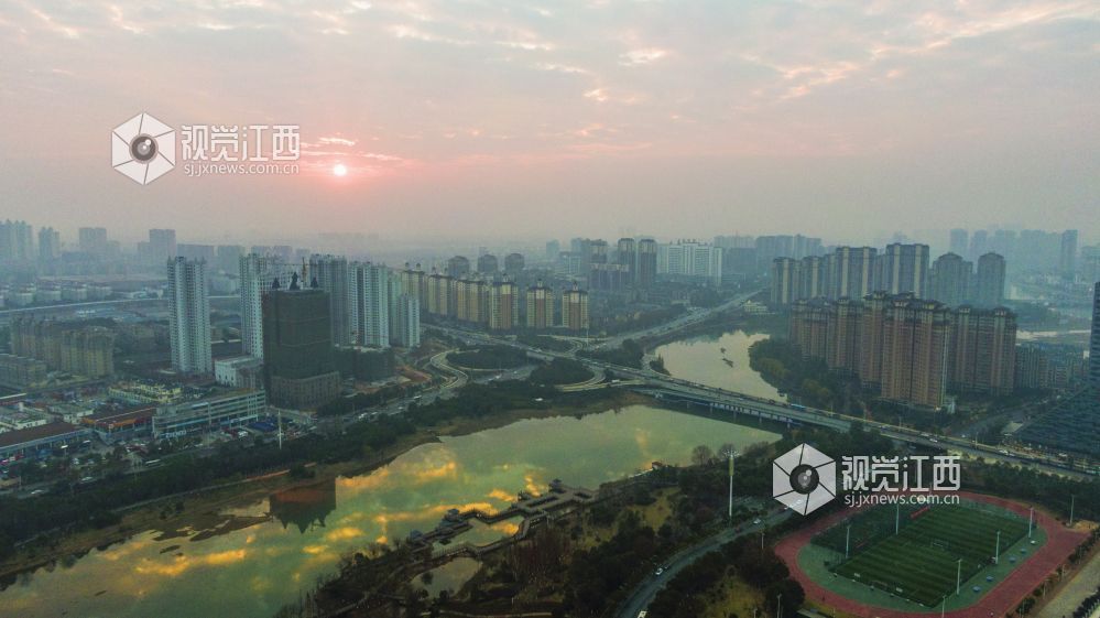 2022年1月4日,日出时的江西省新余市孔目江湿地公园五彩斑澜、水天一色,呈现出一幅“河畅、水清、岸绿、景美”的生态画卷。