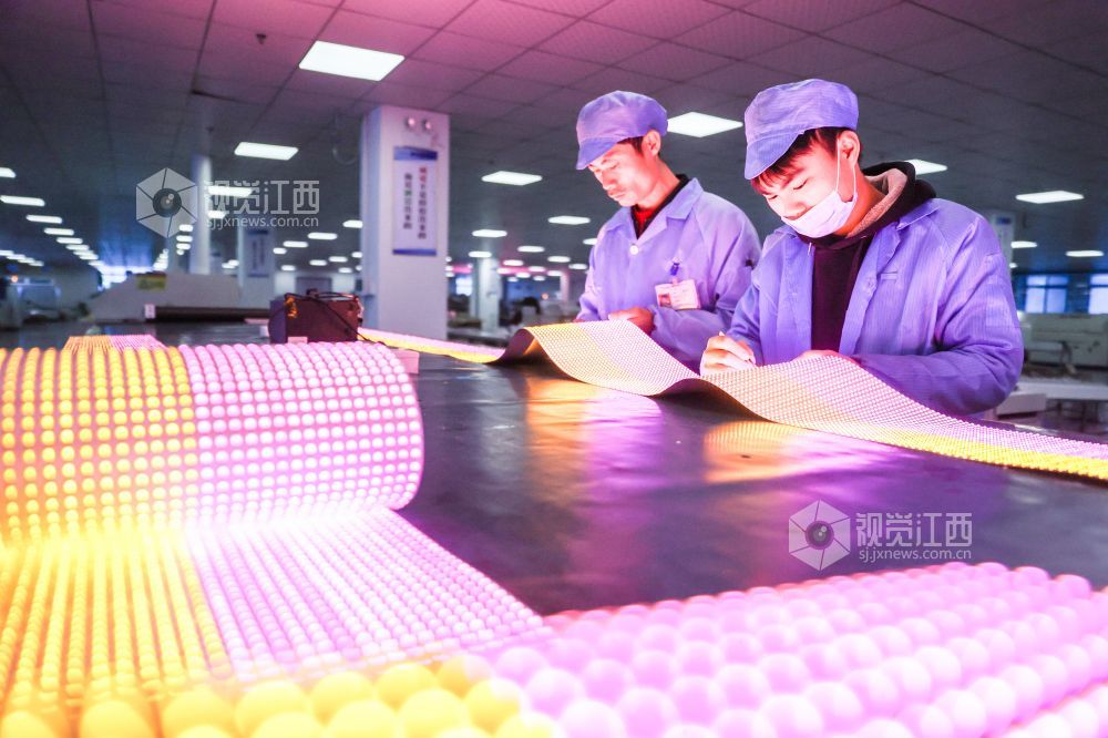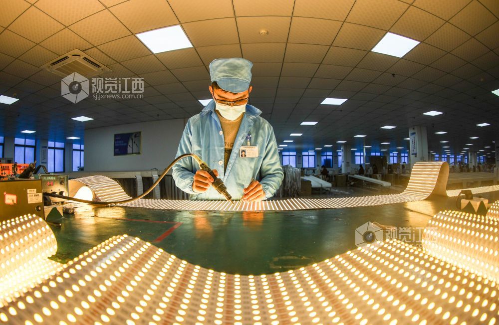 2022年1月4日,位于江西省瑞昌市智造小镇一公司的LED低压灯带生产线前,工人正在对灯带进行测试和老化。