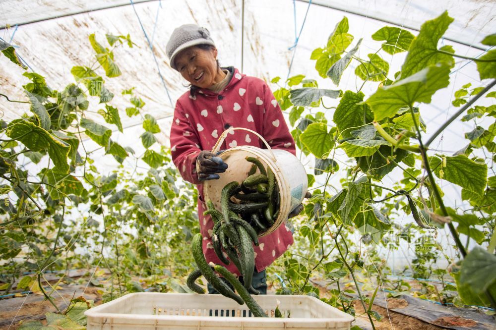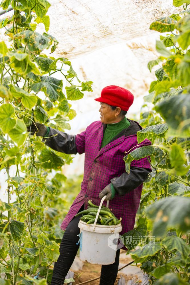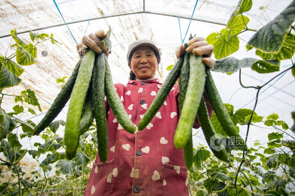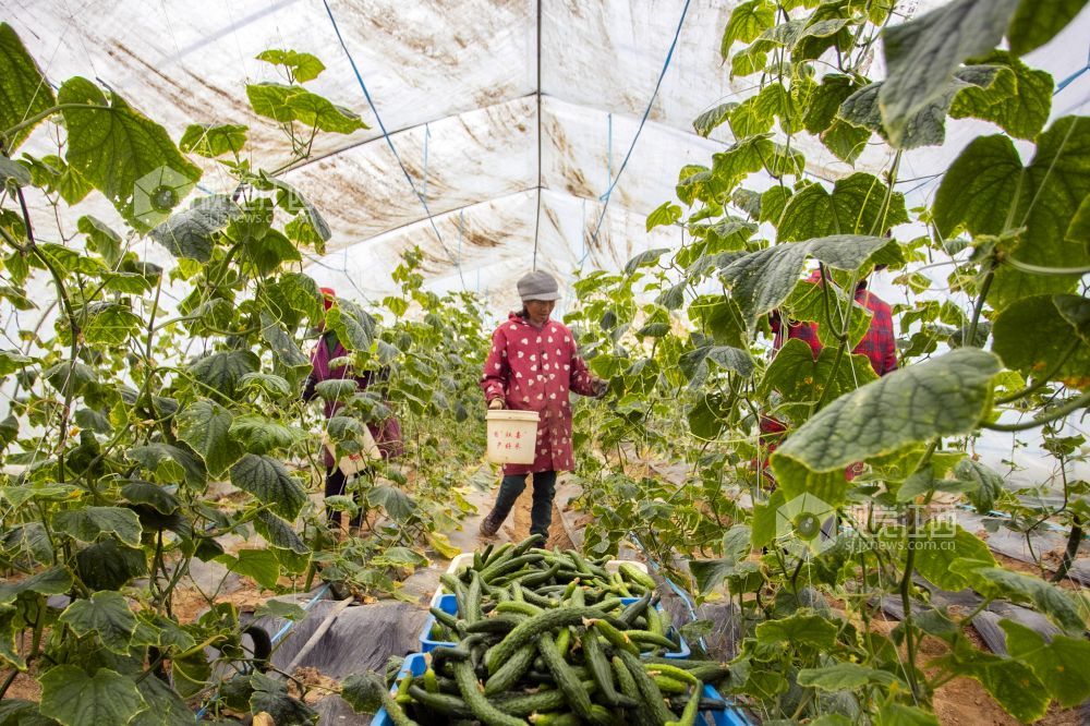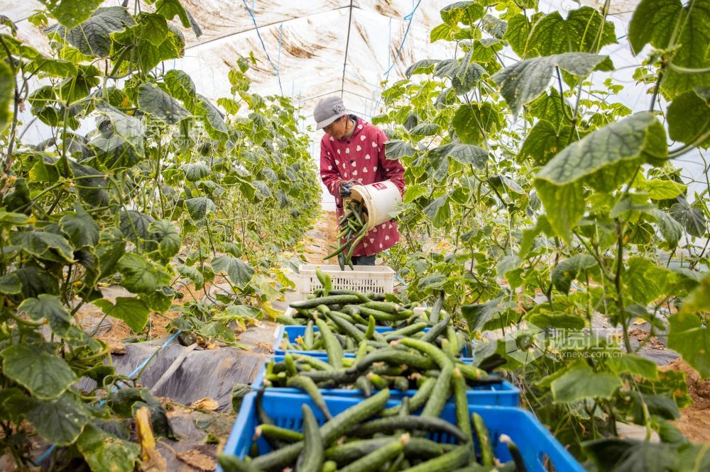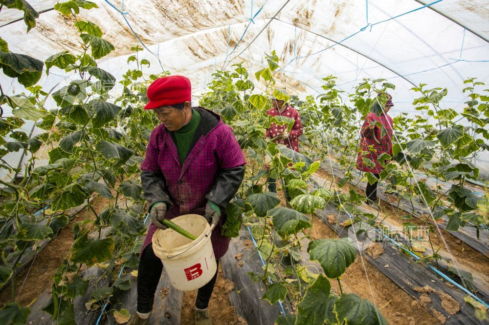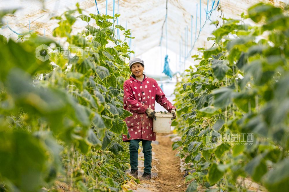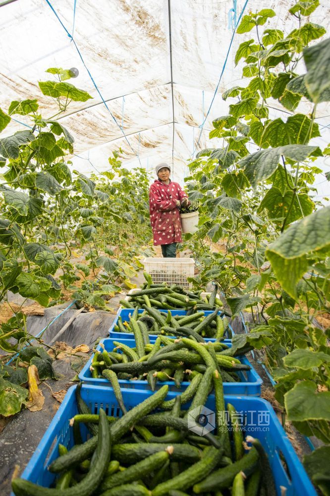 2022年1月6日,江西省九江市湖口县城山镇团墩村产业帮扶基地生机盎然,农户正在采收成熟的果蔬。