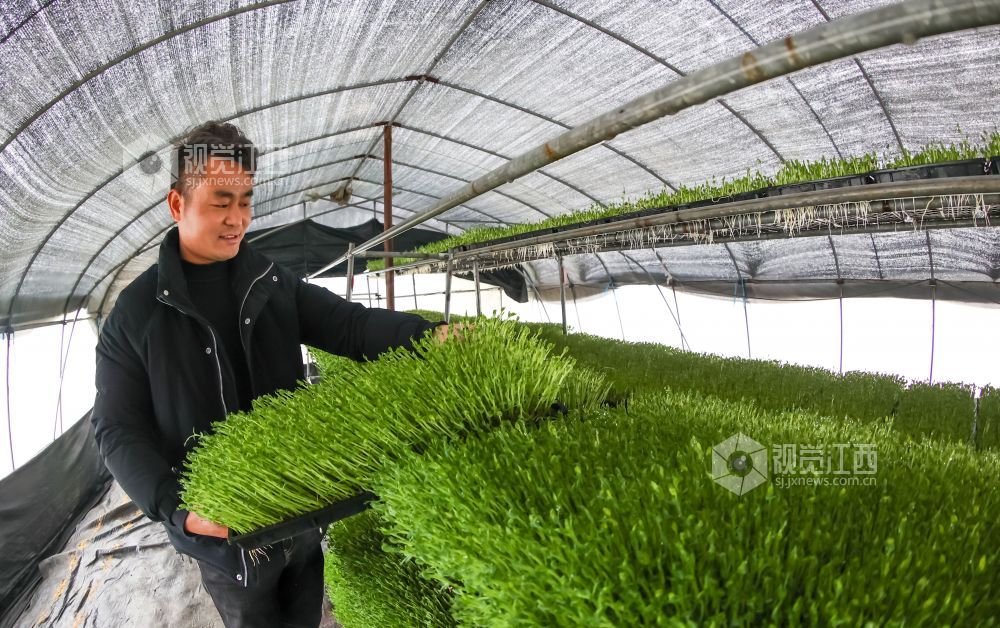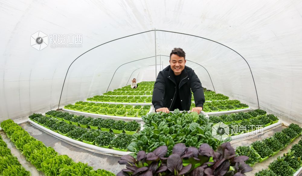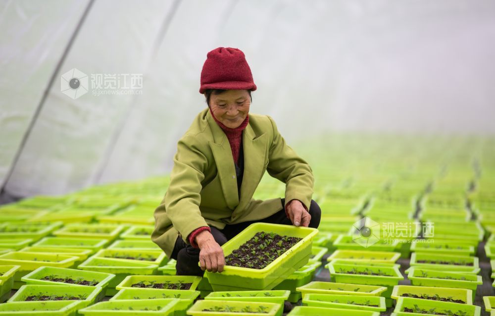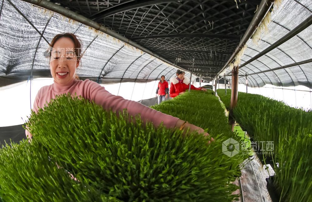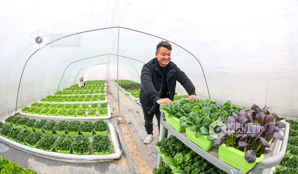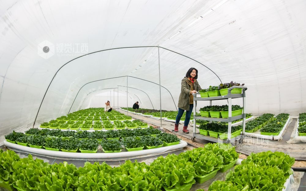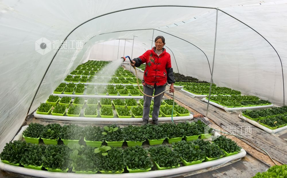 2022年1月6日,江西省瑞昌市高丰镇高丰村盆栽活体蔬菜基地内,村民们在大棚里管护、采收盆栽有机蔬菜。