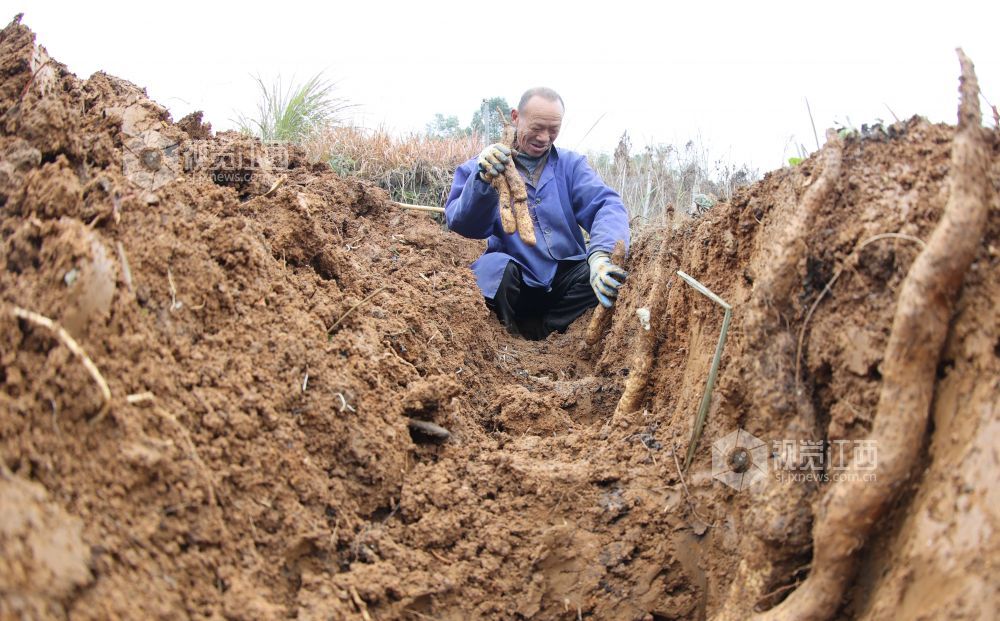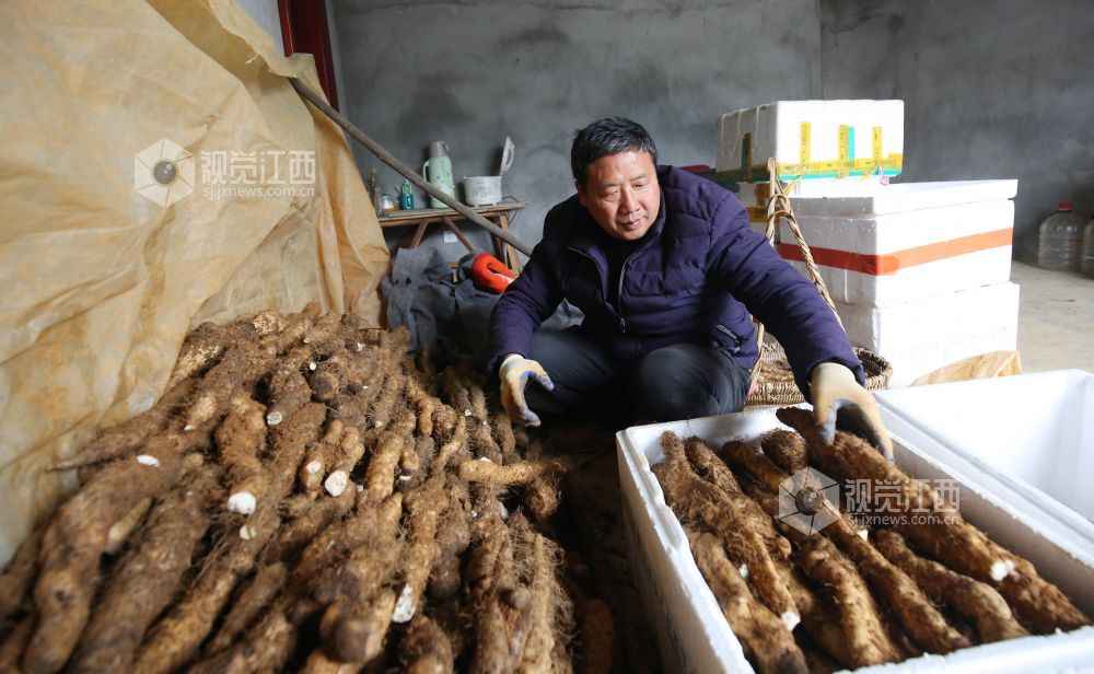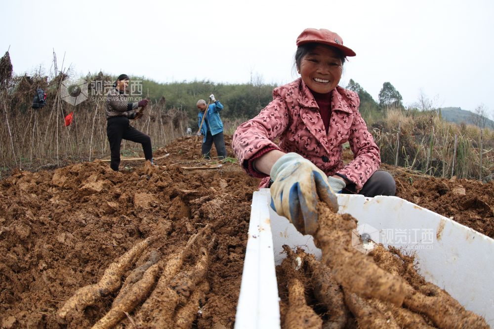 2022年1月7日,江西省瑞昌市南阳乡上坂村罗城山村民在采挖、包装山药。